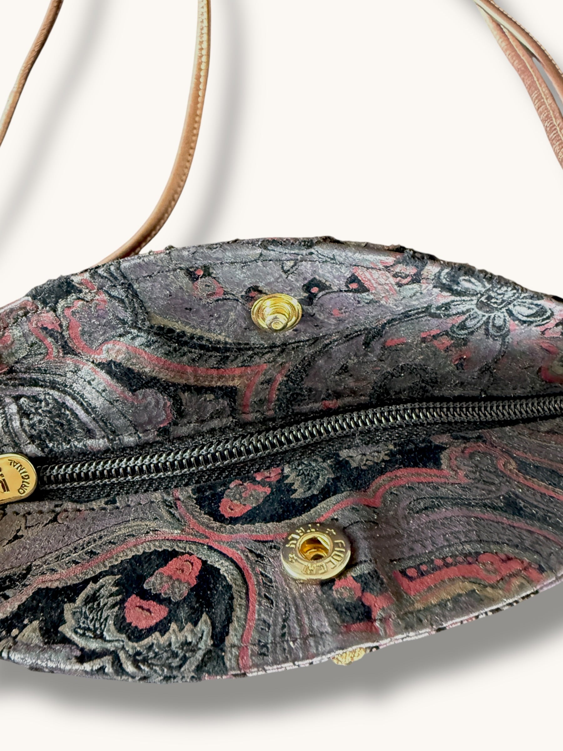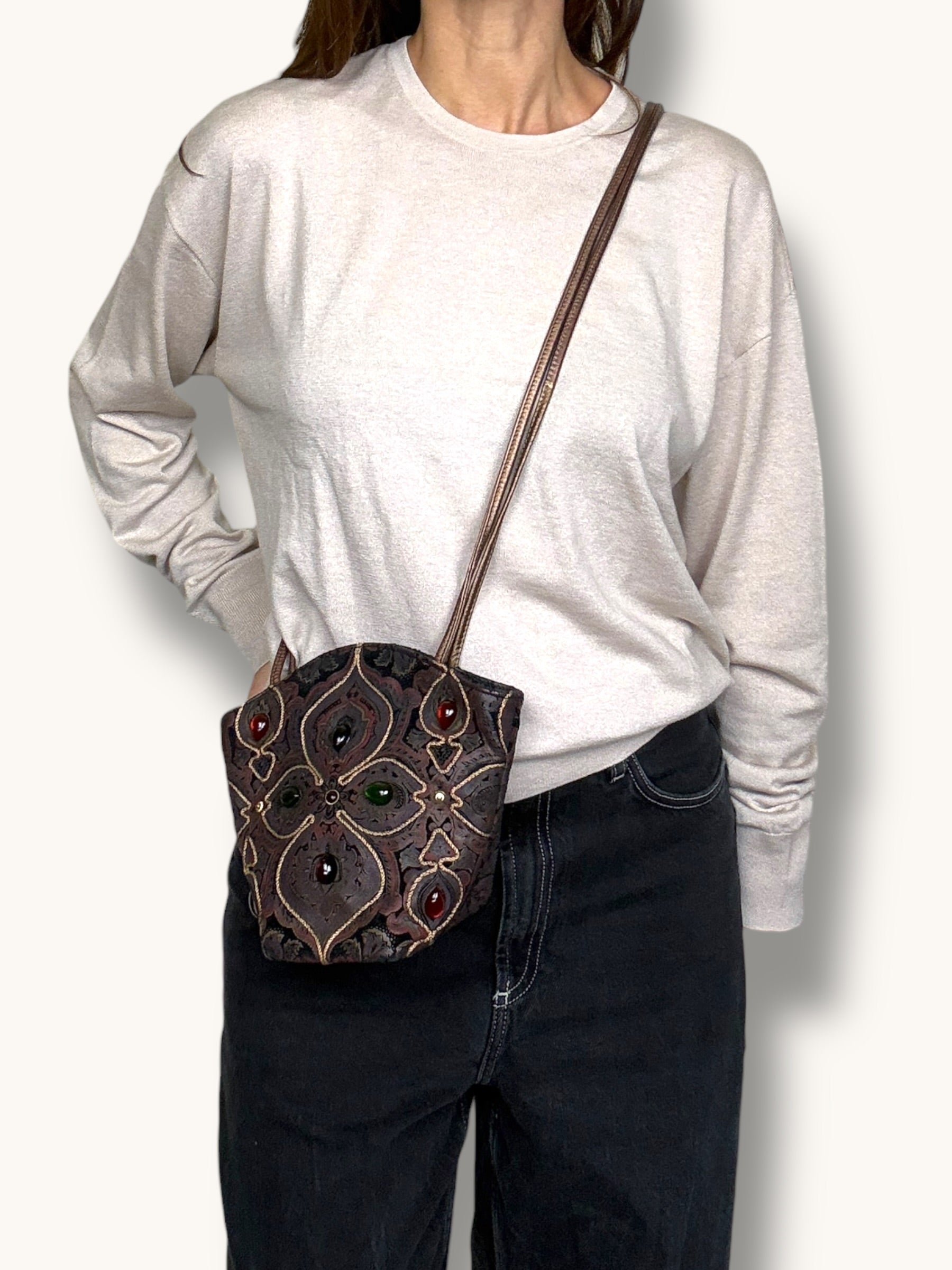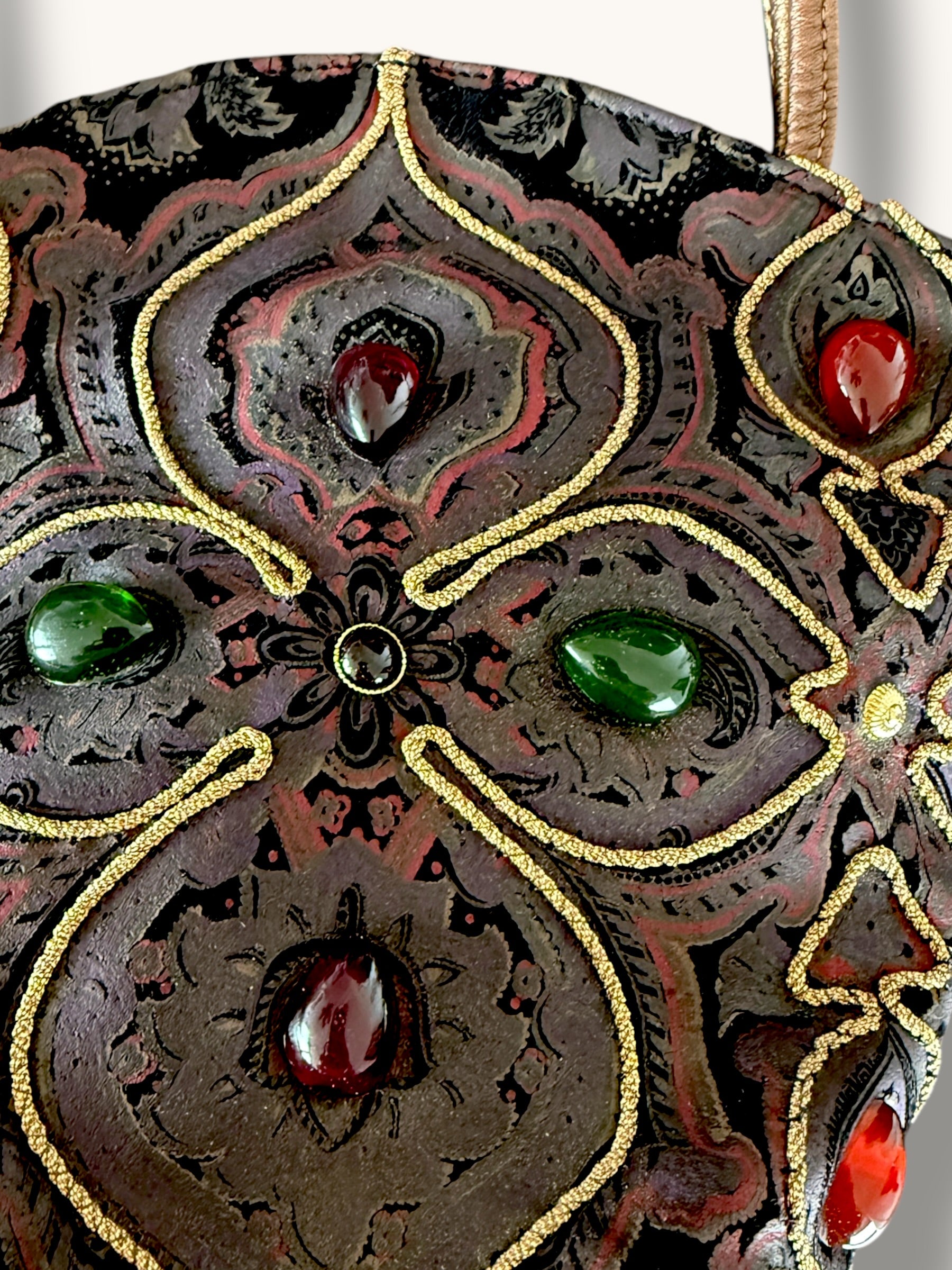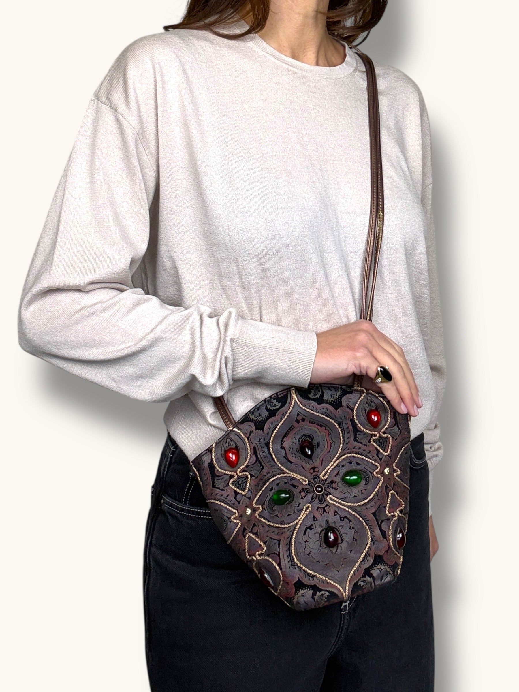 Stunning Vintage brown Leather bag Made in Italy with colored cabochon and gold trims. Long leather straps.