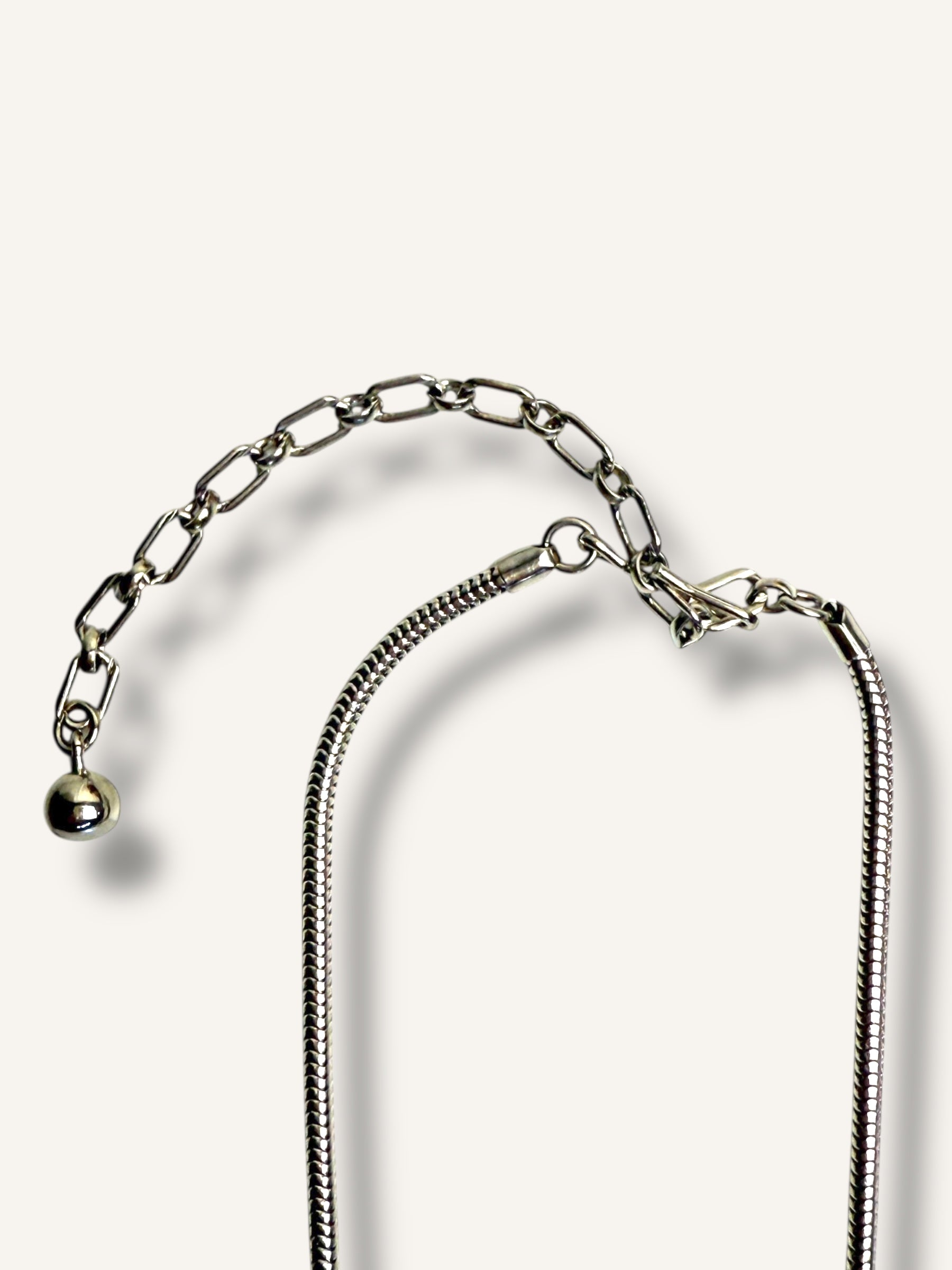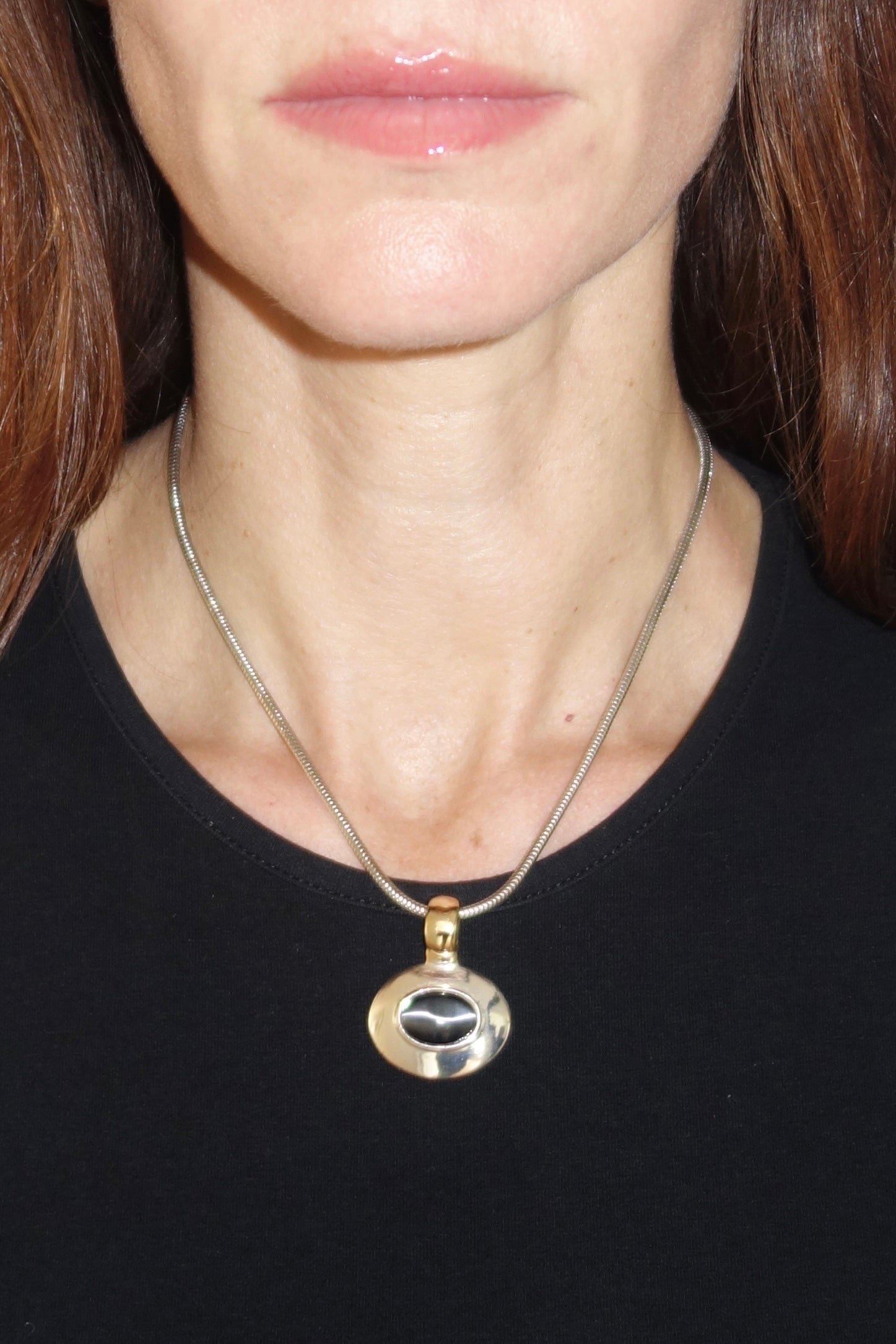 Vintage Modernist Necklace. Elegant vintage modernist necklace featuring a sculptural silver-tone pendant with an oval glass cabochon at it's center. The smooth, polished finish highlights the contrast between the metallic luster and the grey blue, glossy cabochon. Suspended from a sleek snake chain with an adjustable clasp and extender for perfect length versatility, this piece exudes timeless sophistication and minimalist charm—ideal for elevating any outfit from day to night.