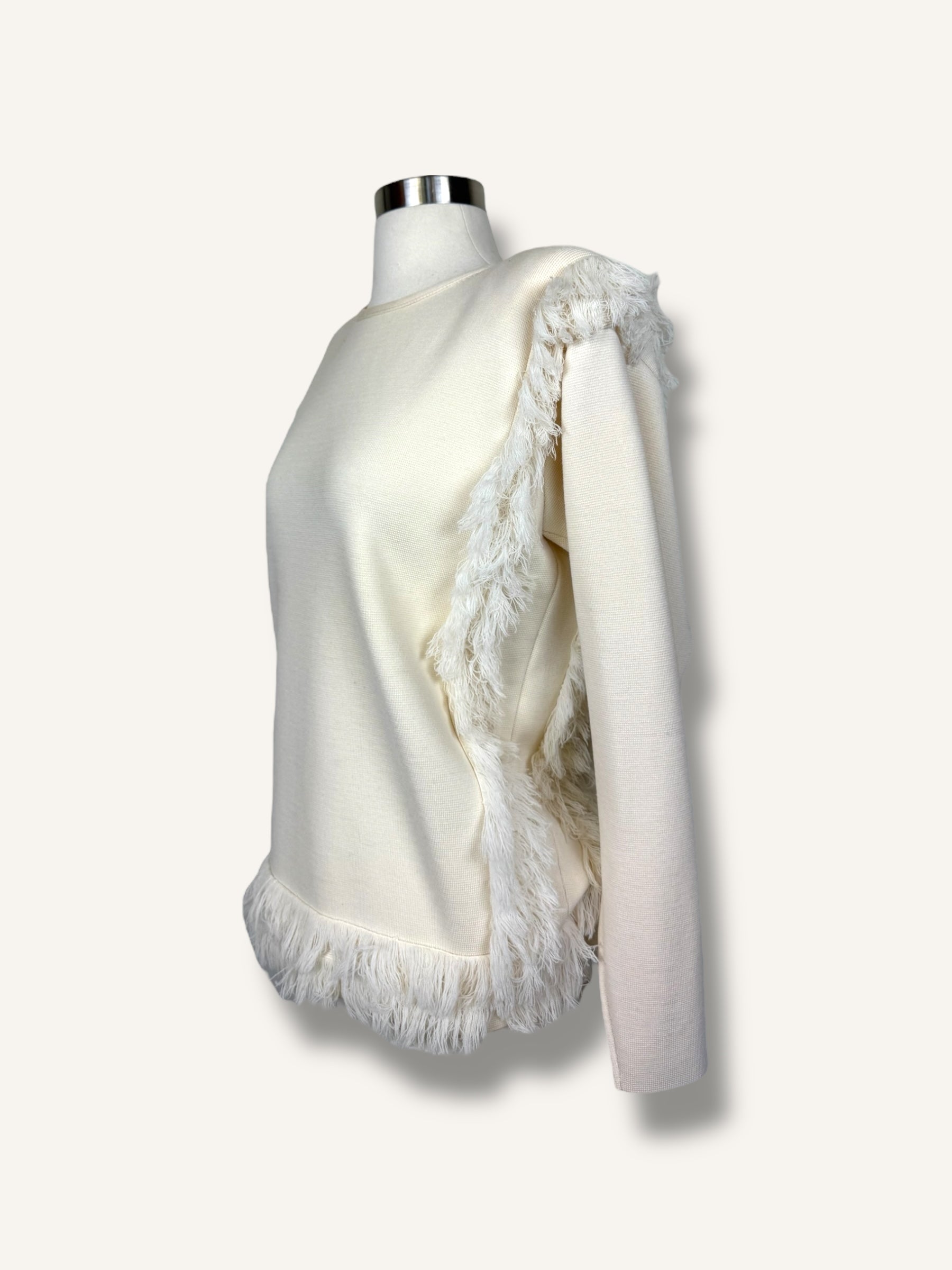 Vintage Chloé ivory sweater with tonal fringe trim along the shoulders, sides, and hem. Designed with a clean crew neckline, thick shoulder pads, long sleeves, and a soft knit body, the textured fringe detail adds movement and dimension to the minimalist silhouette. A standout piece that balances classic elegance with playful detail.
