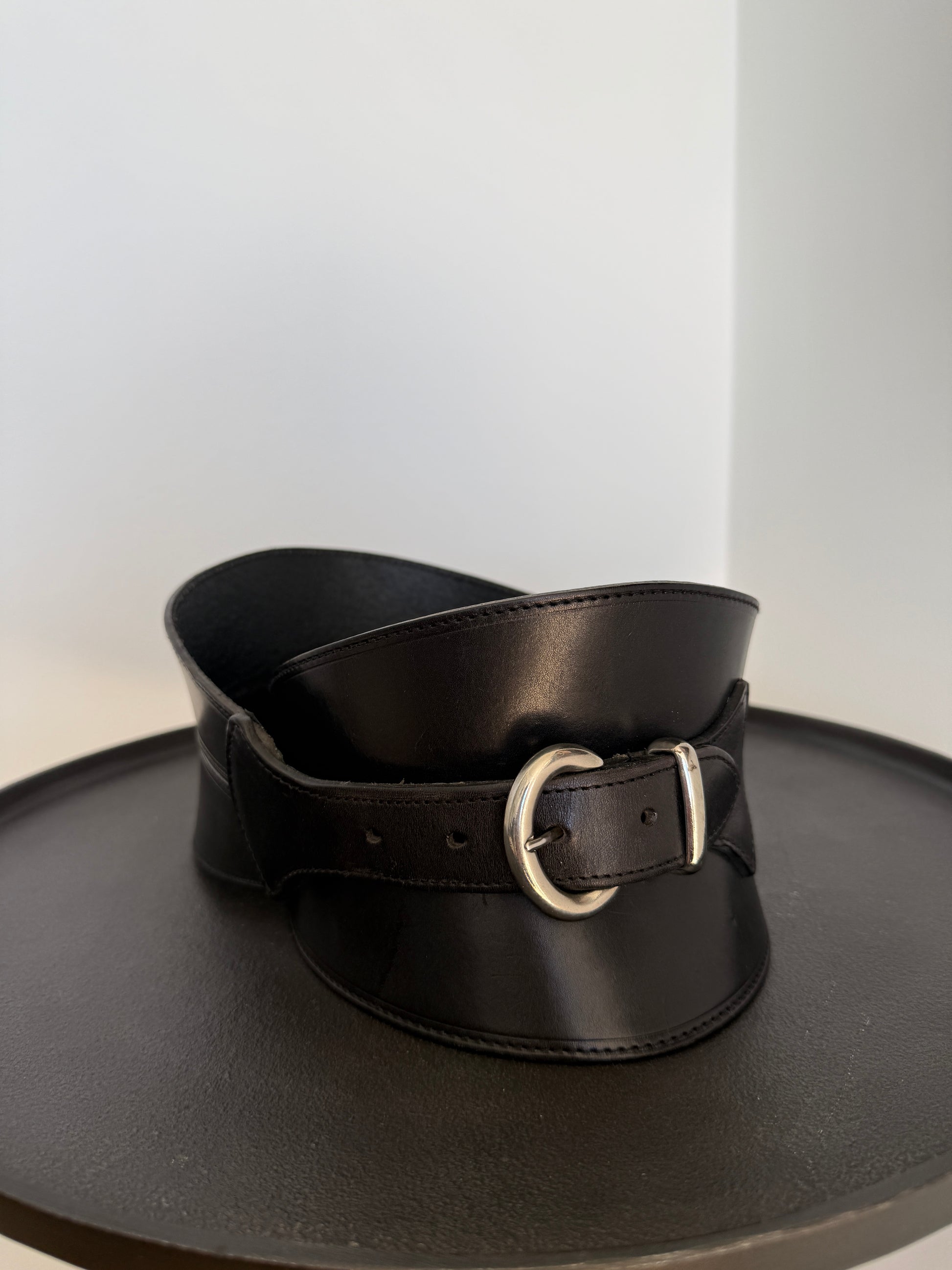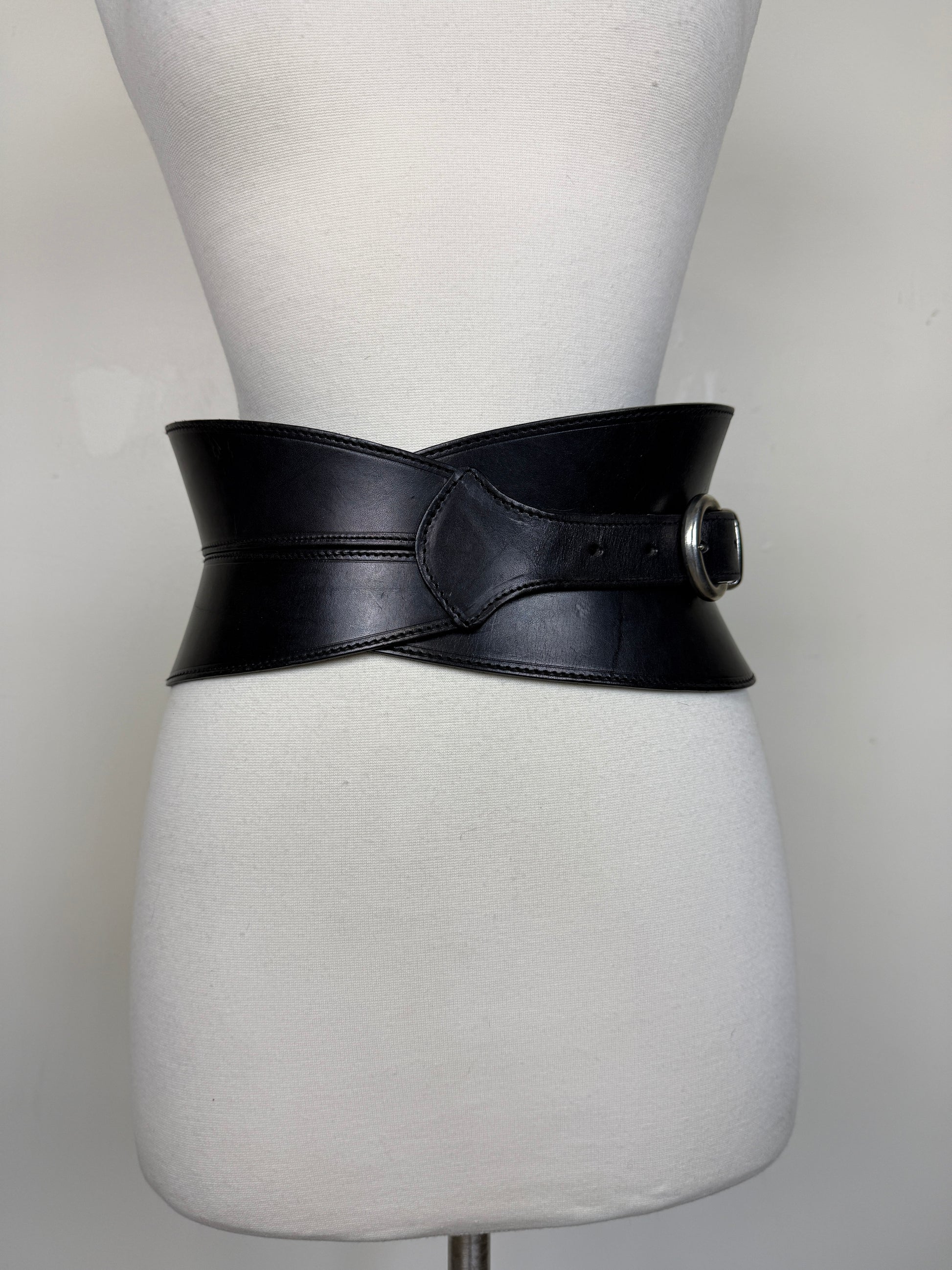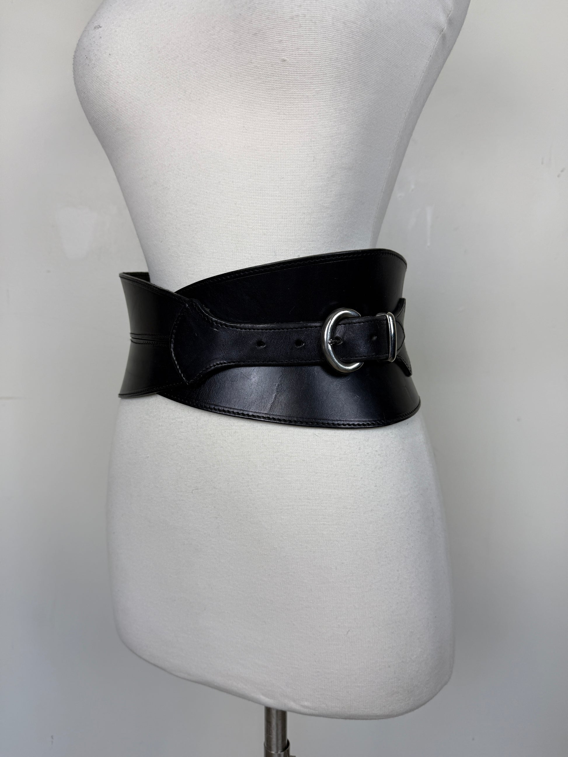 A sculptural vintage black leather corset belt designed to instantly define the waist with a bold, structured silhouette. Crafted in smooth, high-shine leather, it features a dramatic curved shape that hugs the body, a silver-tone buckle detail at the front, and an elasticated back for a comfortable, flexible fit. The clean lines and strong proportions make it the perfect statement piece to elevate everything from oversized blazers to fluid dresses—effortless, powerful, and undeniably chic.