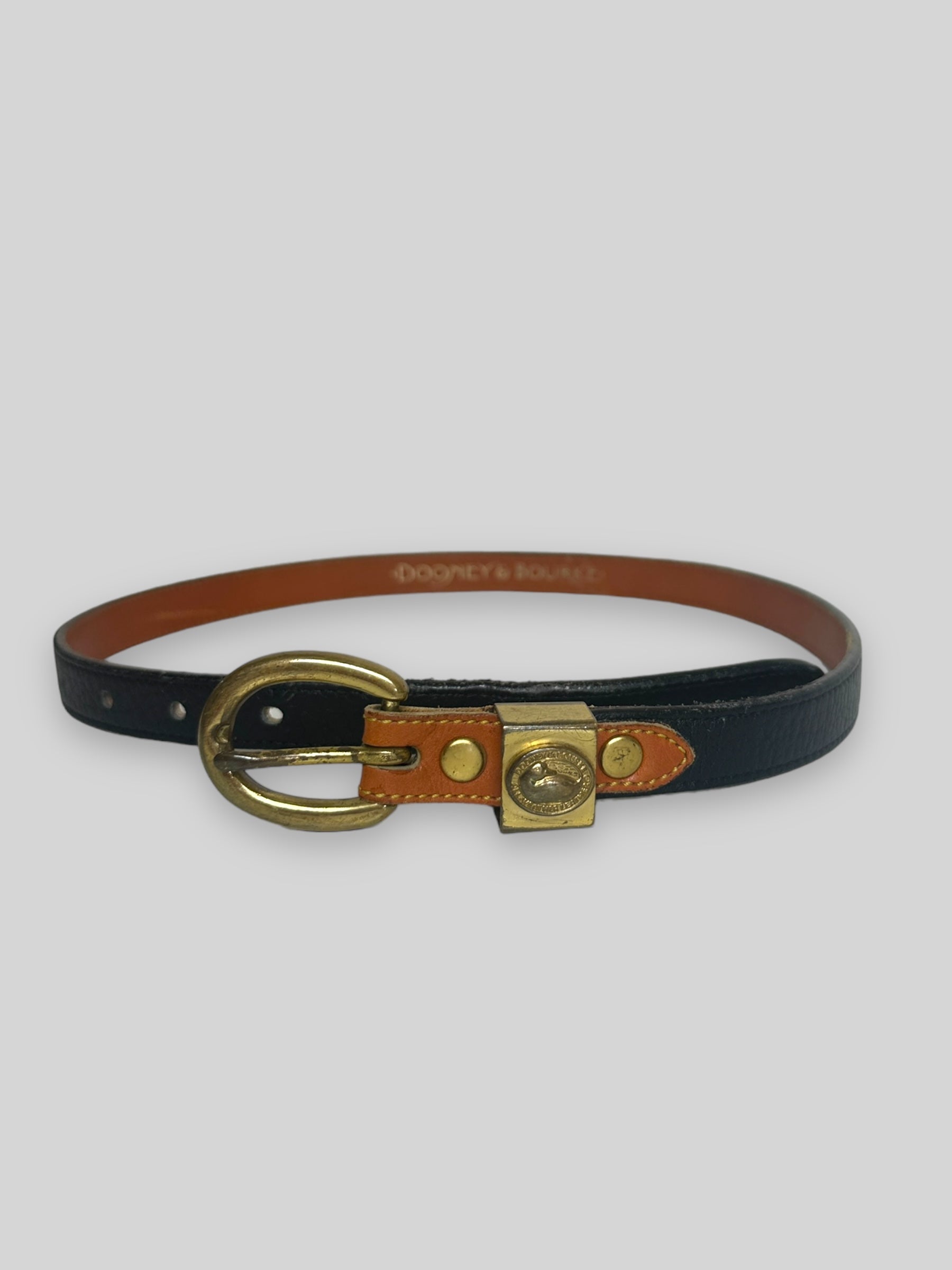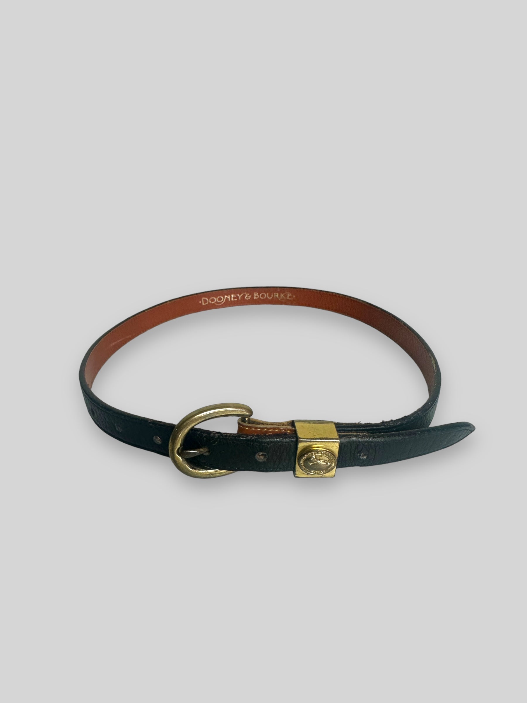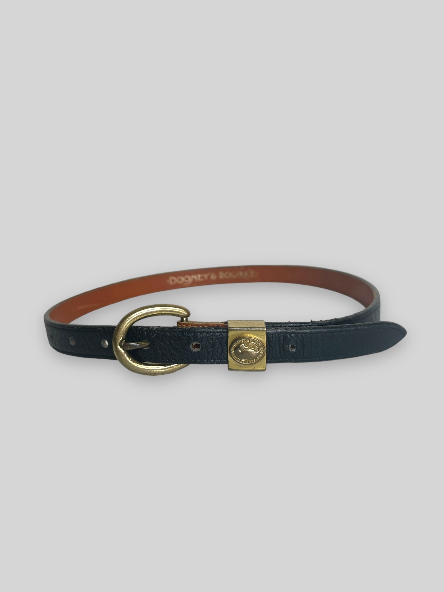 Vintage Donney and Bourke black leather belt with brass buckle with embossed logo.