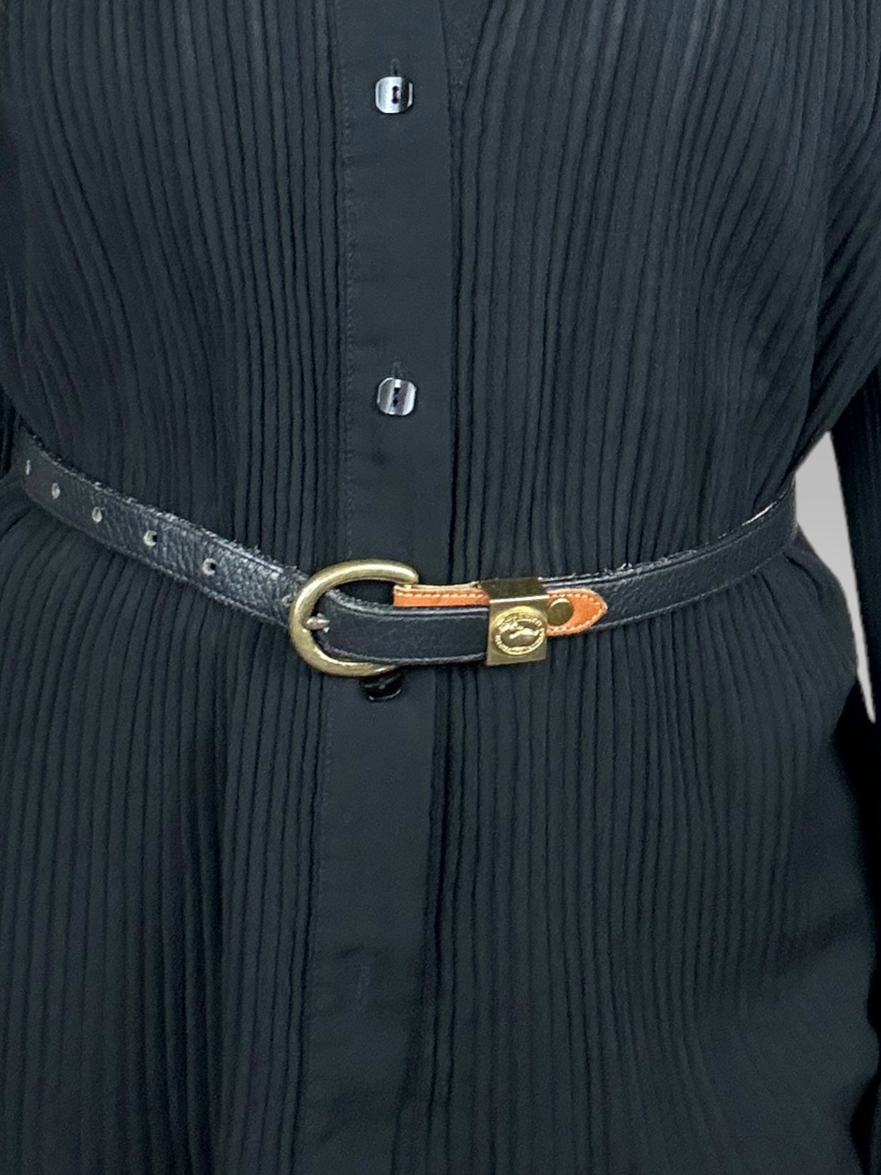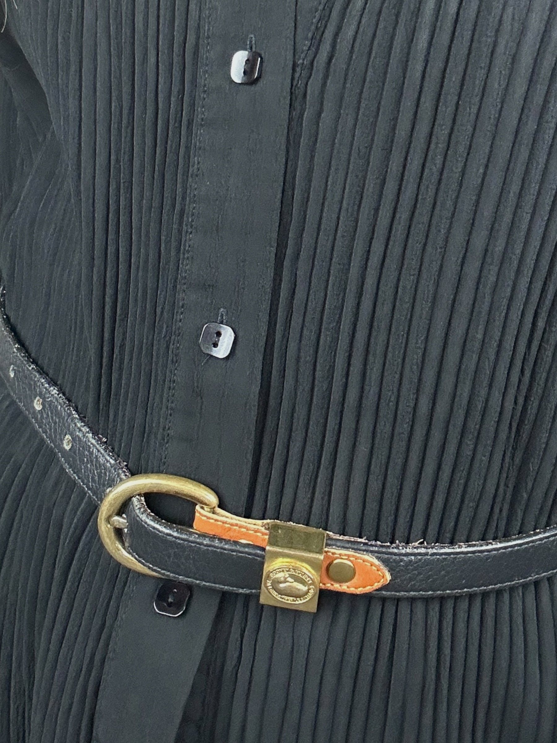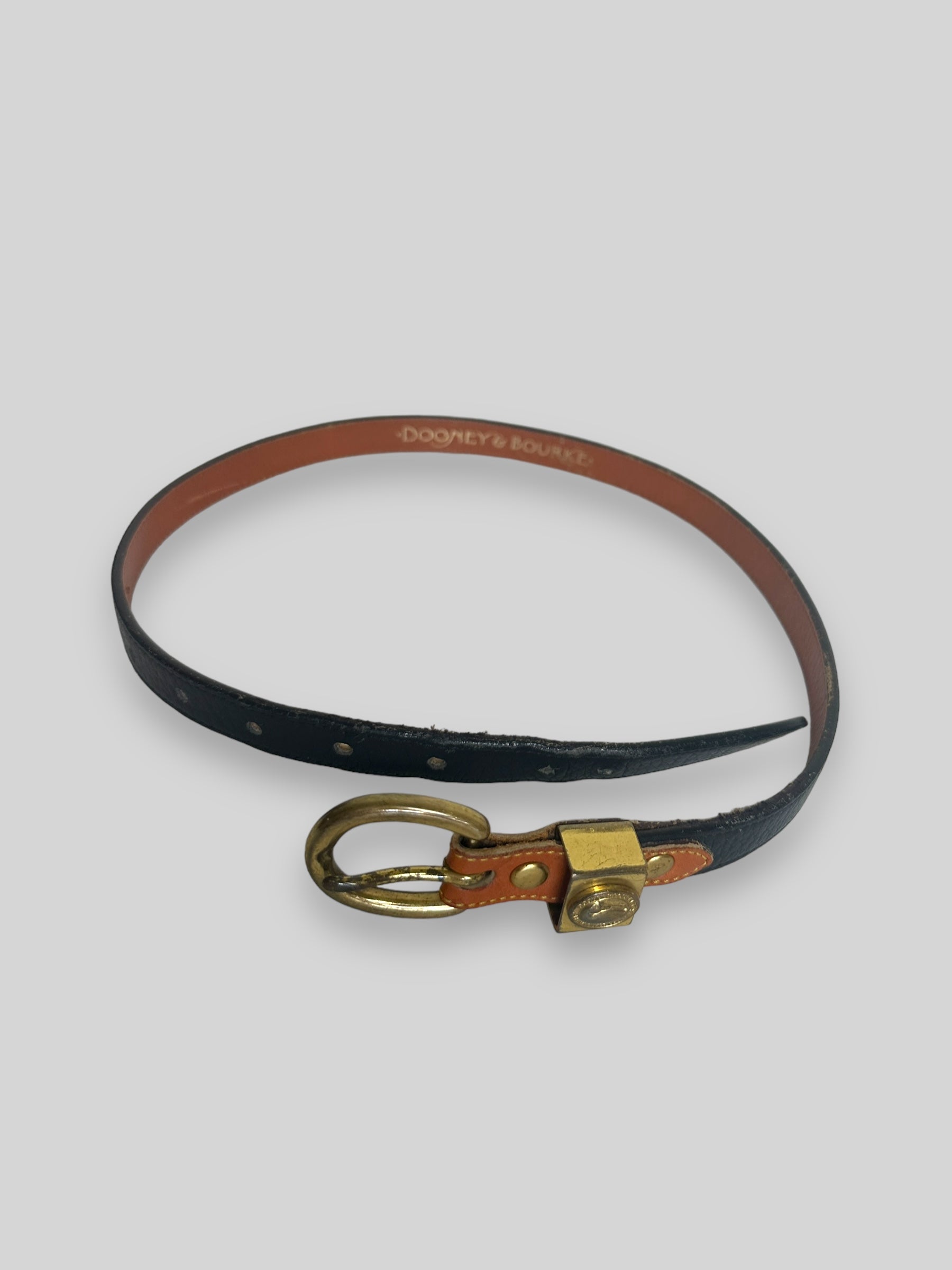 Vintage Donney and Bourke black leather belt with brass buckle with embossed logo.