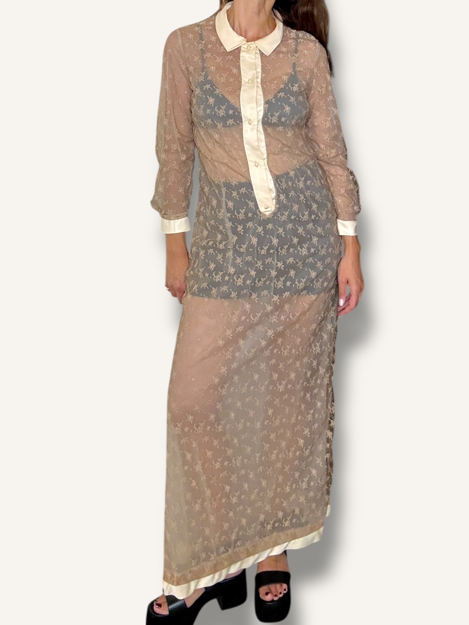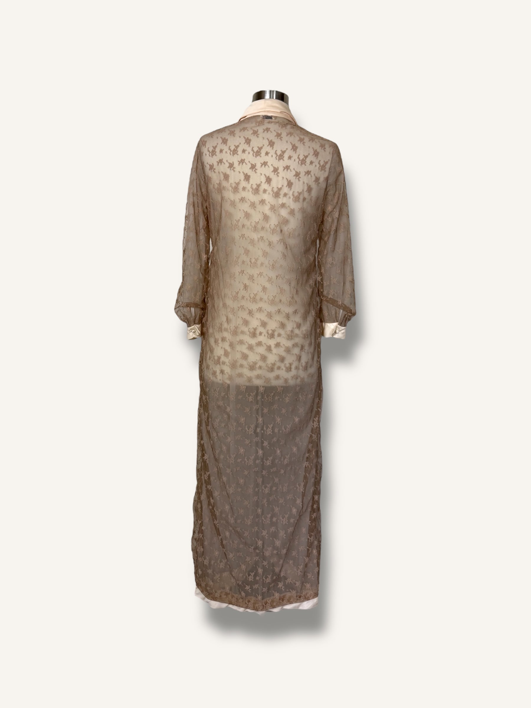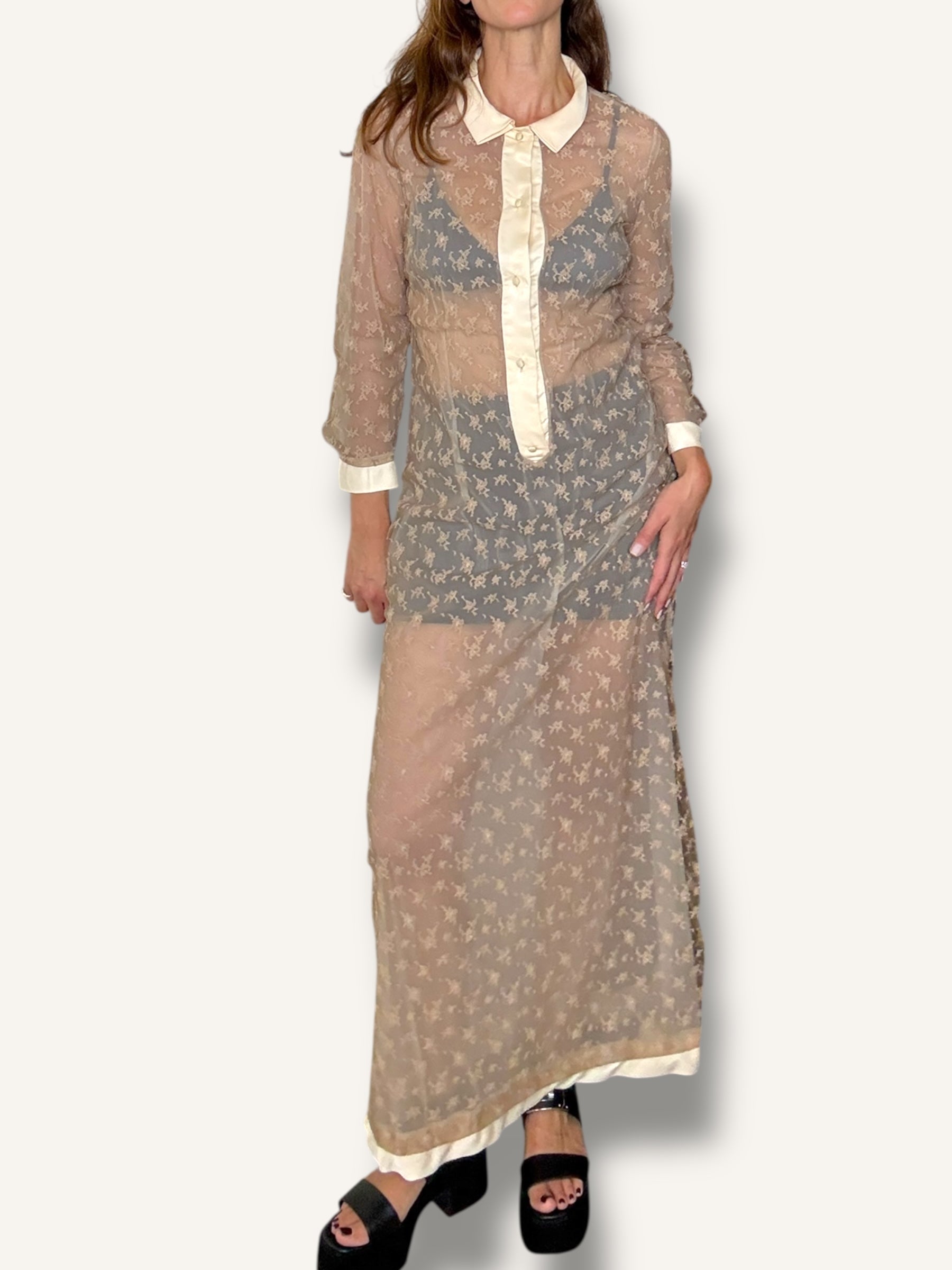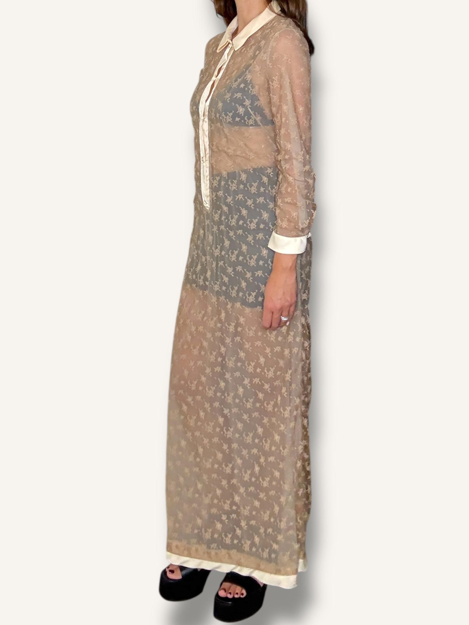 Delicate 1970s Christian Dior maxi dress in sheer blush lace with soft ivory satin trim. Features a pointed collar, button-down front, and semi-sheer silhouette. Elegant, romantic, and timeless.