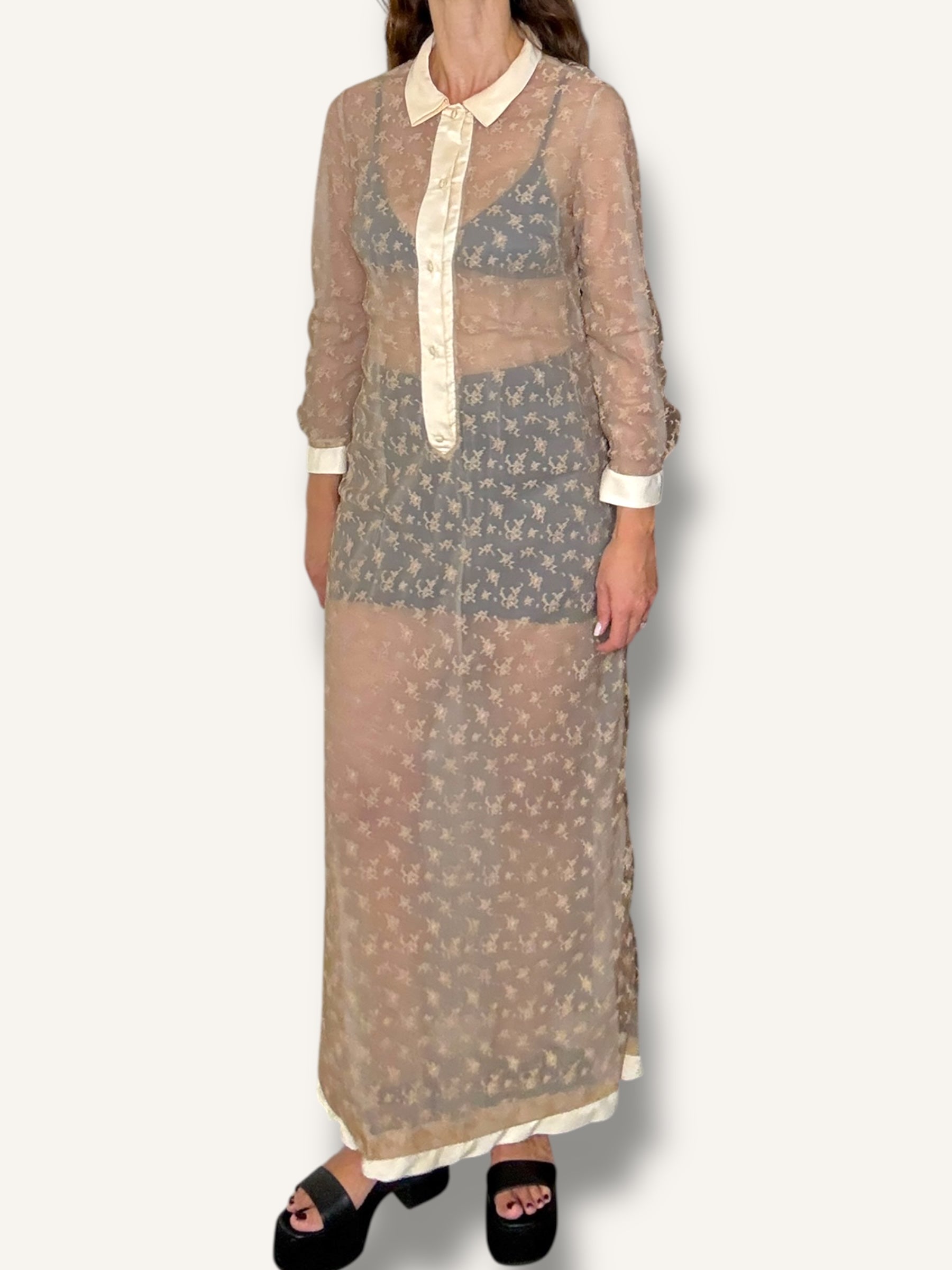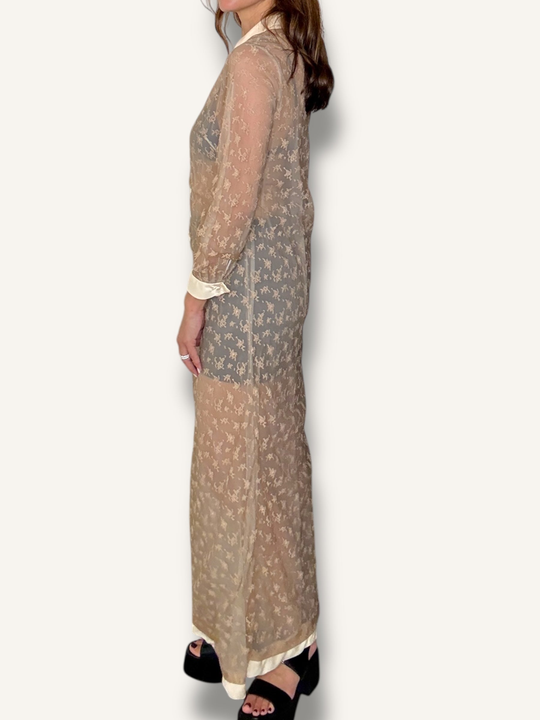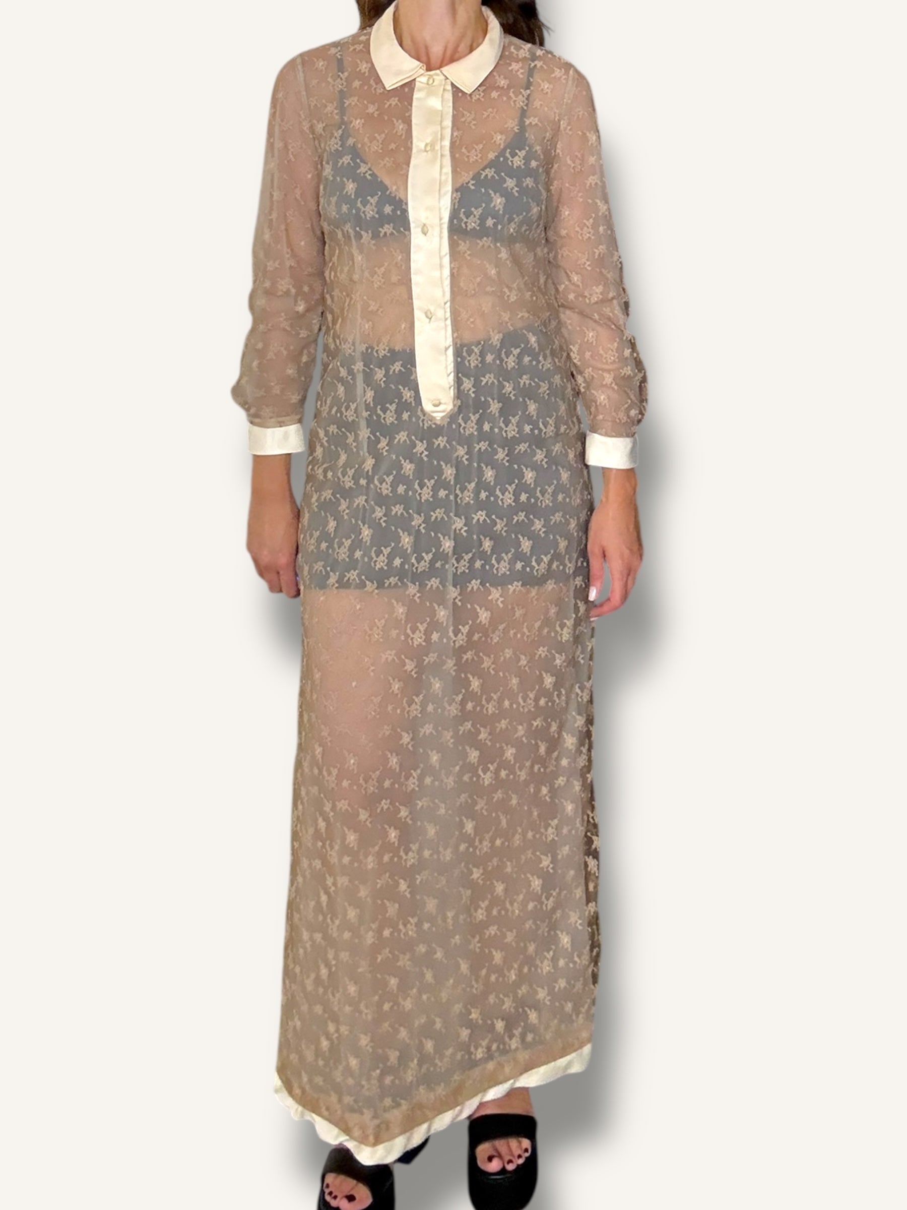 Delicate 1970s Christian Dior maxi dress in sheer blush lace with soft ivory satin trim. Features a pointed collar, button-down front, and semi-sheer silhouette. Elegant, romantic, and timeless.