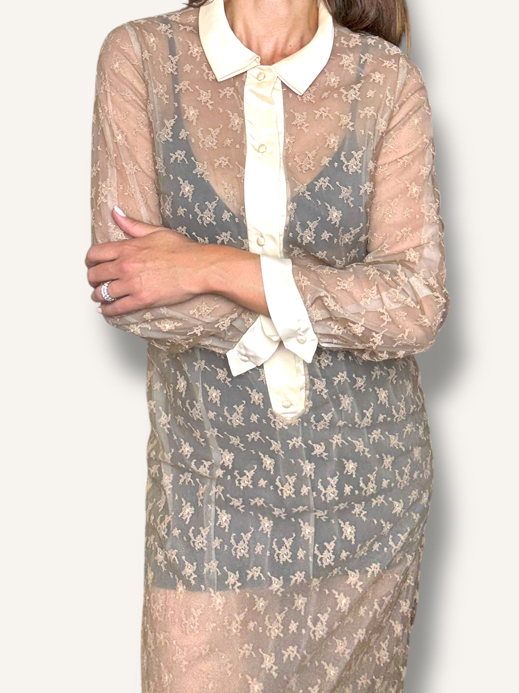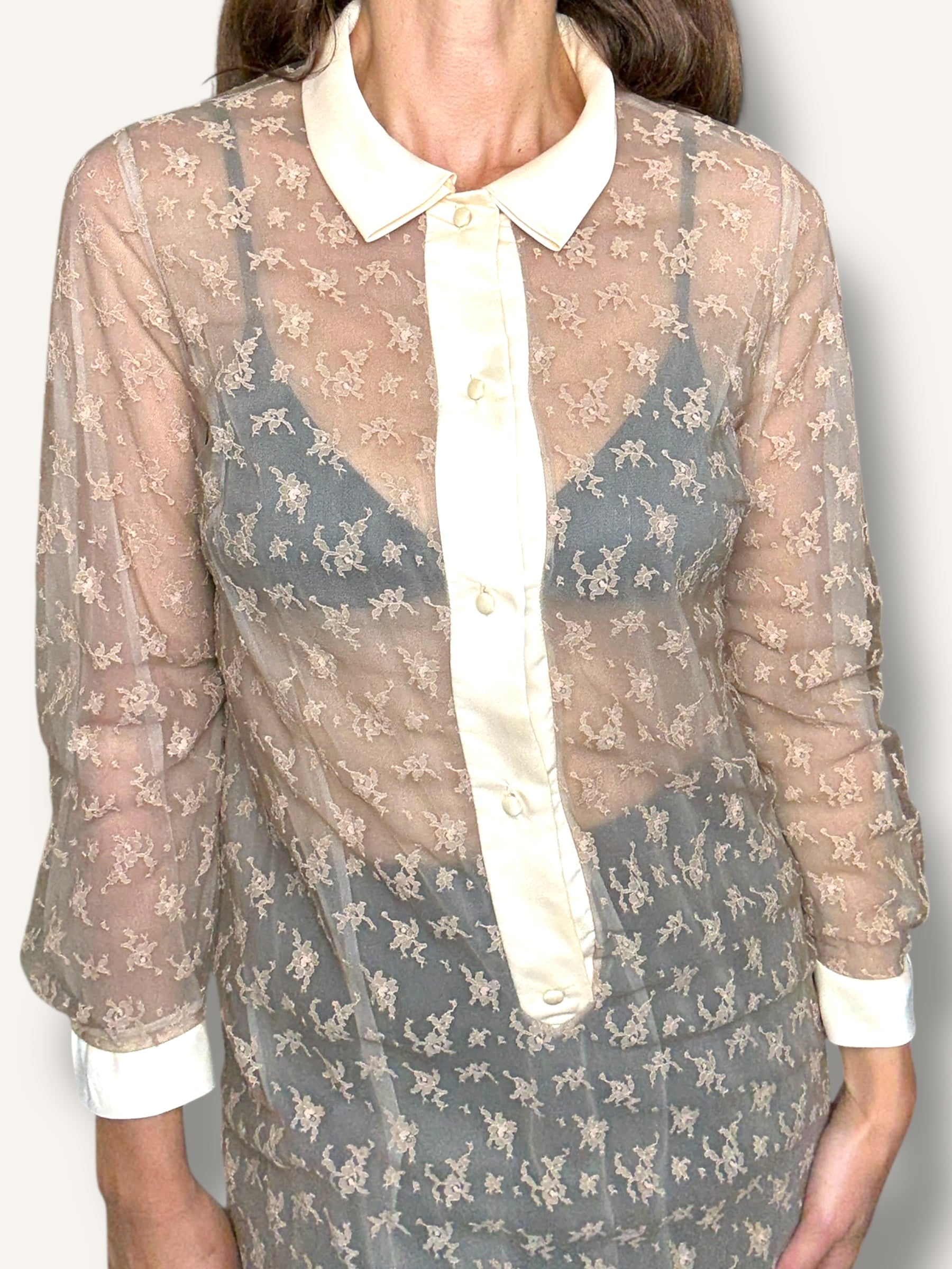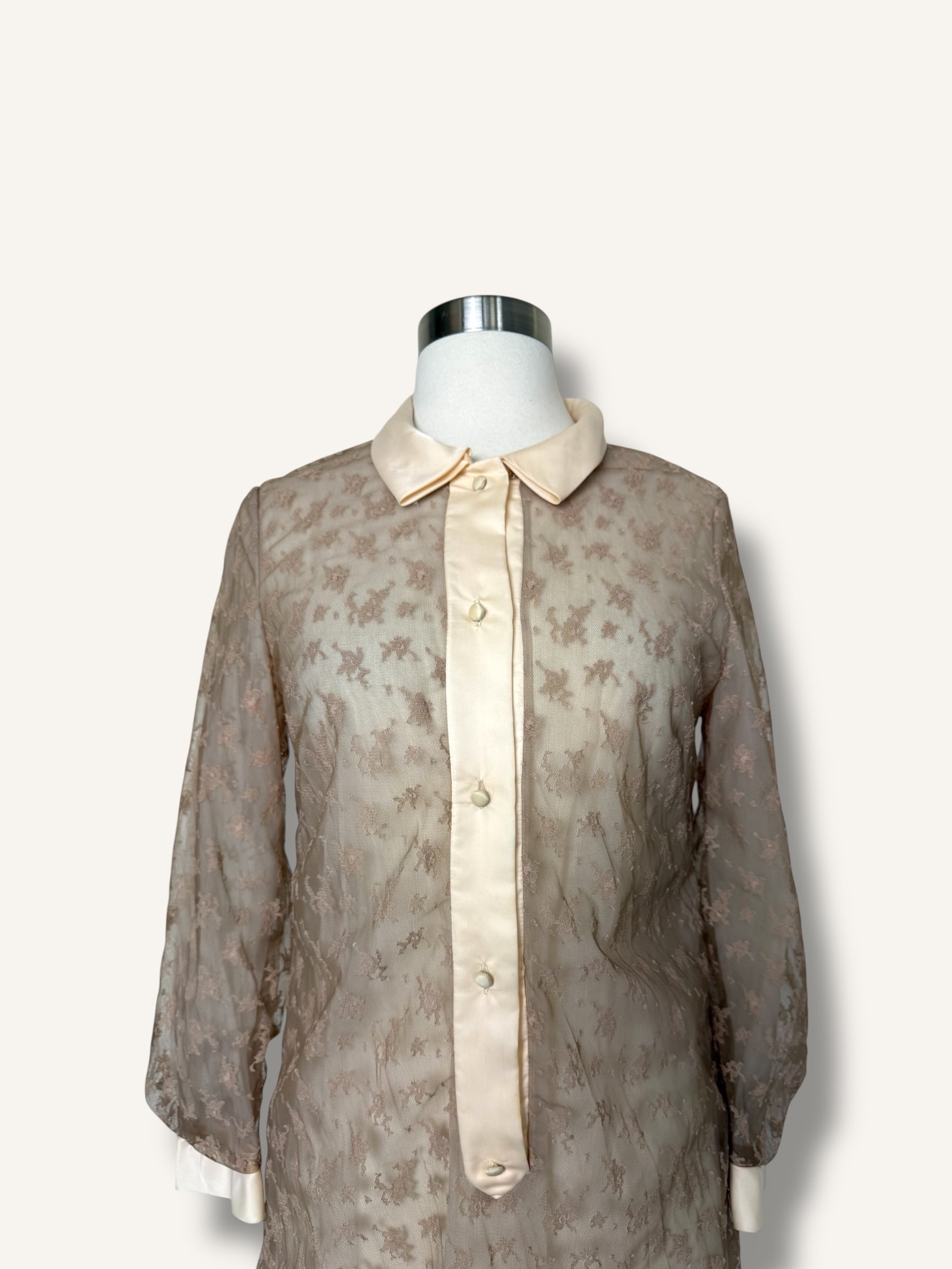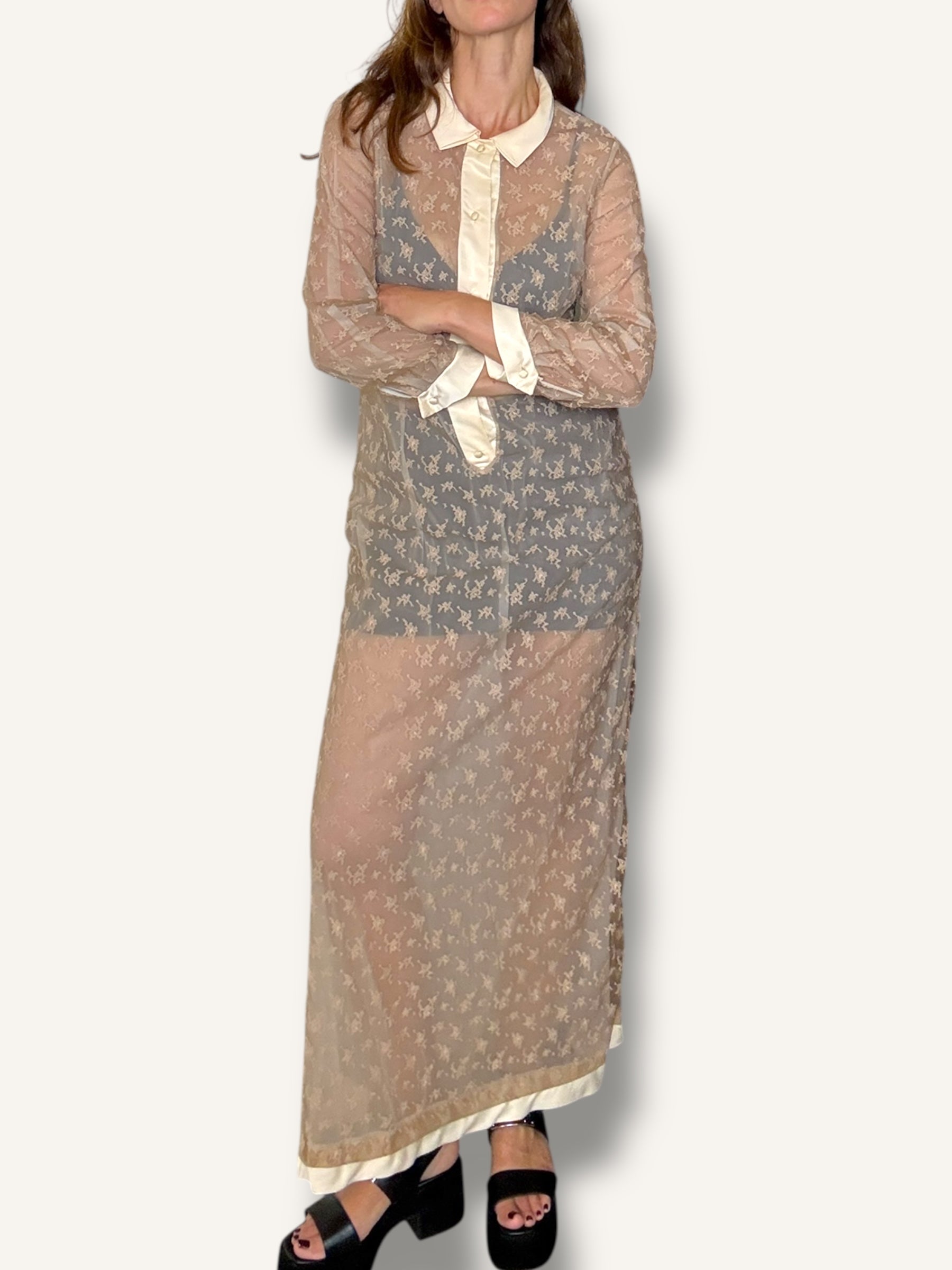 Delicate 1970s Christian Dior maxi dress in sheer blush lace with soft ivory satin trim. Features a pointed collar, button-down front, and semi-sheer silhouette. Elegant, romantic, and timeless.