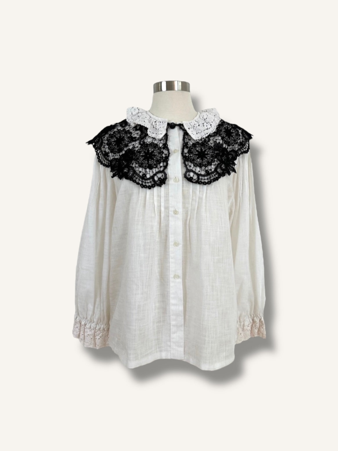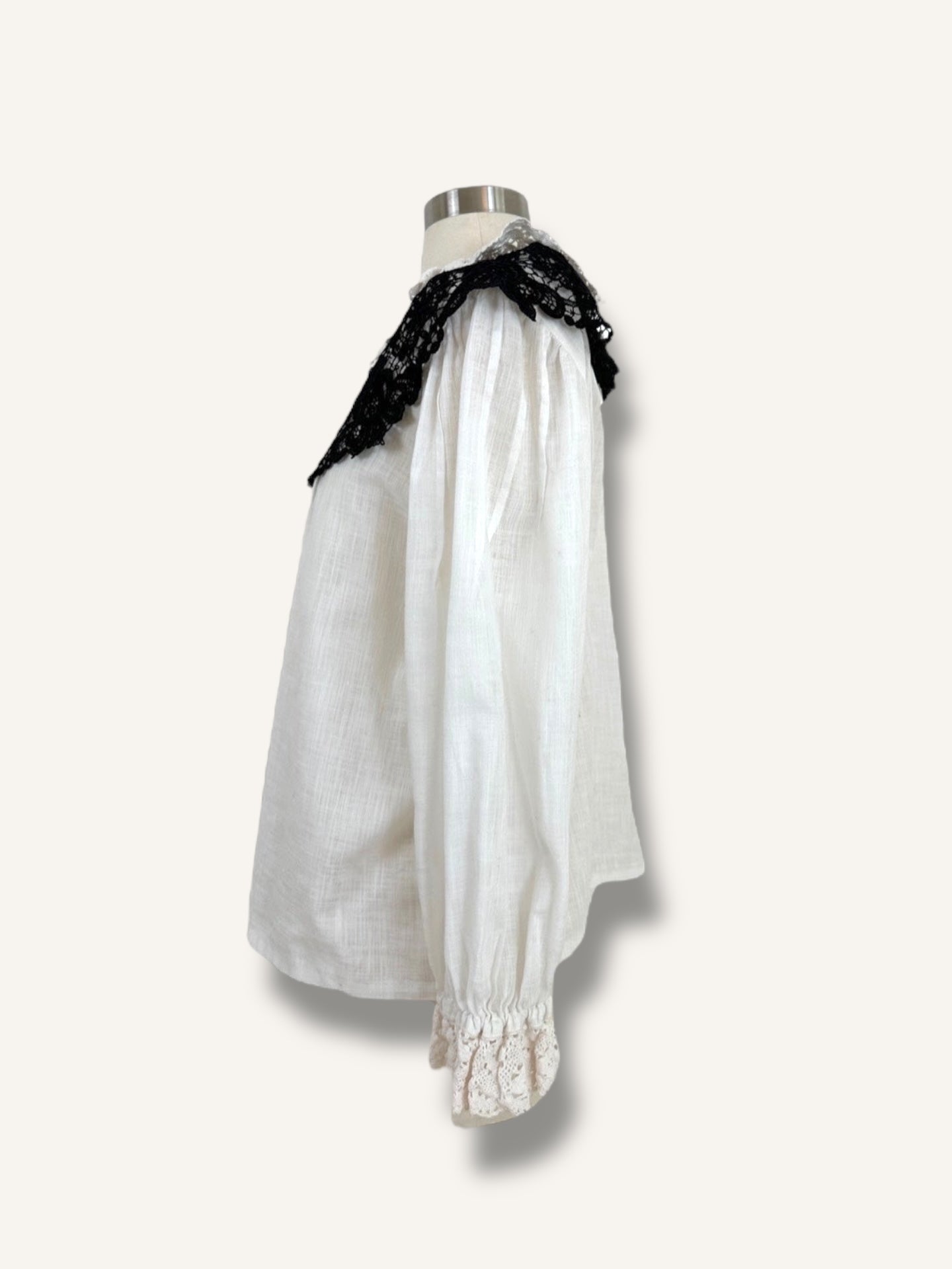 A romantic vintage blouse with a twist. This crisp white cotton piece adorned by Jen Wonders Studio features a voluminous silhouette with gathered cuffs and delicate buttons down the front. What makes it truly unique is the stunning dual-tone lace collar: originally adorned with vintage white lace, it’s been elevated with an added layer of bold black antique lace for dramatic contrast and a one-of-a-kind statement finish.