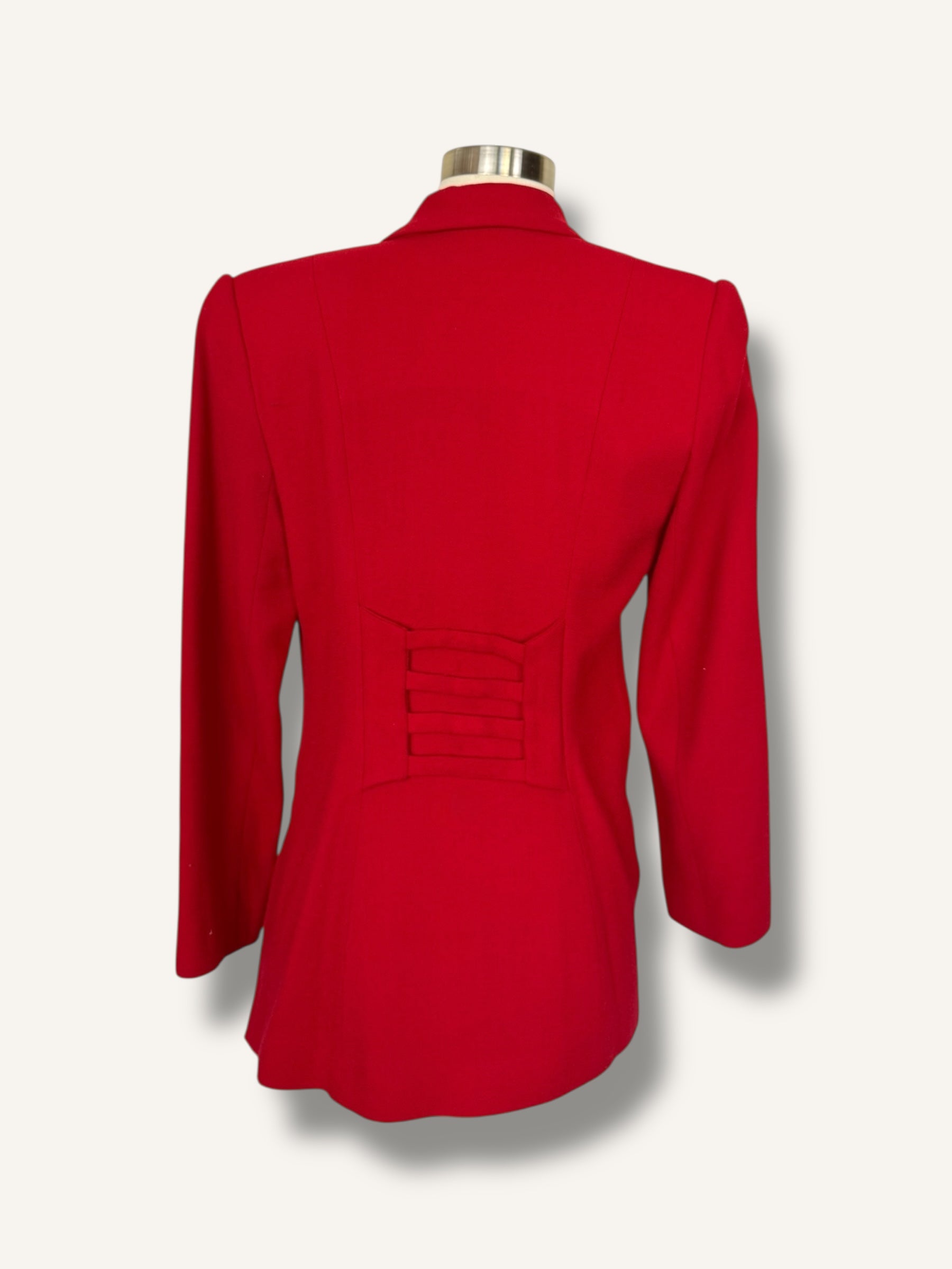 Rare vintage Alberto Malaki blazer in 100% wool. Features bold shoulders, a tailored waist, ornate gold buttons with pearl centers, and gold embroidered pocket accents. Finished with structured pleating at the back for a sharp, sculpted fit.