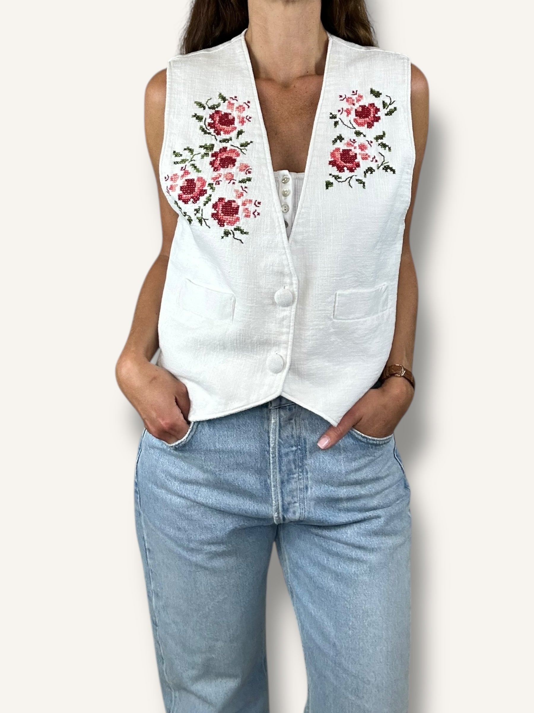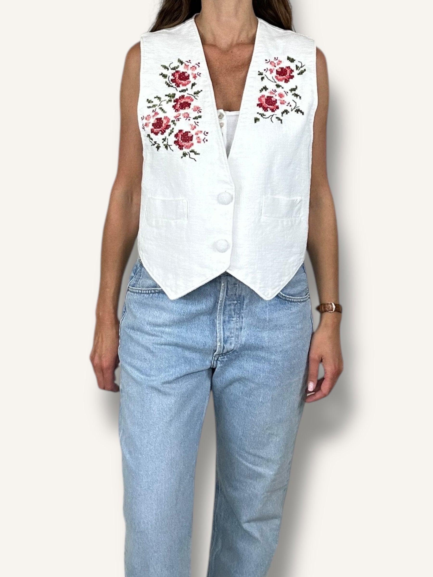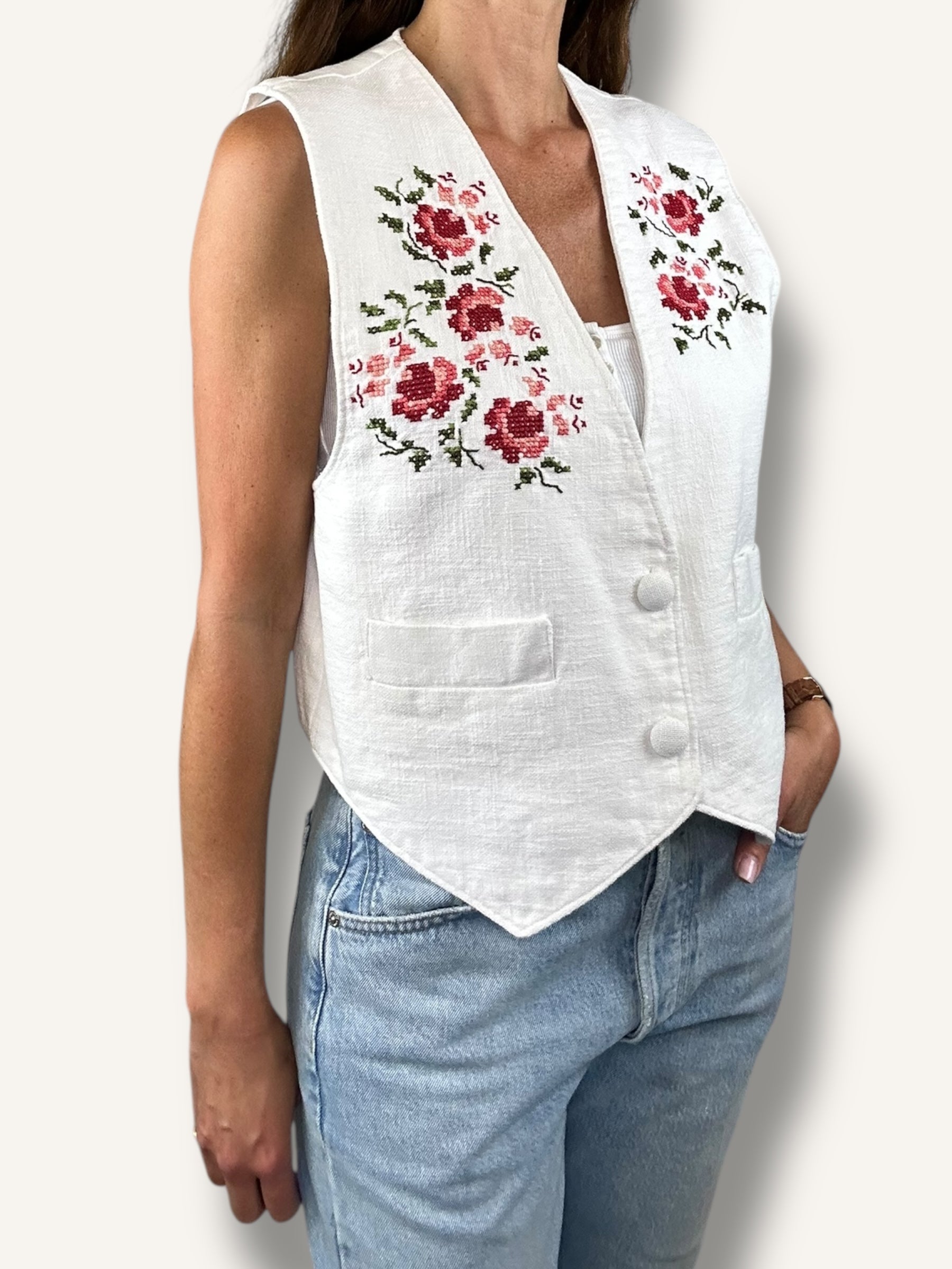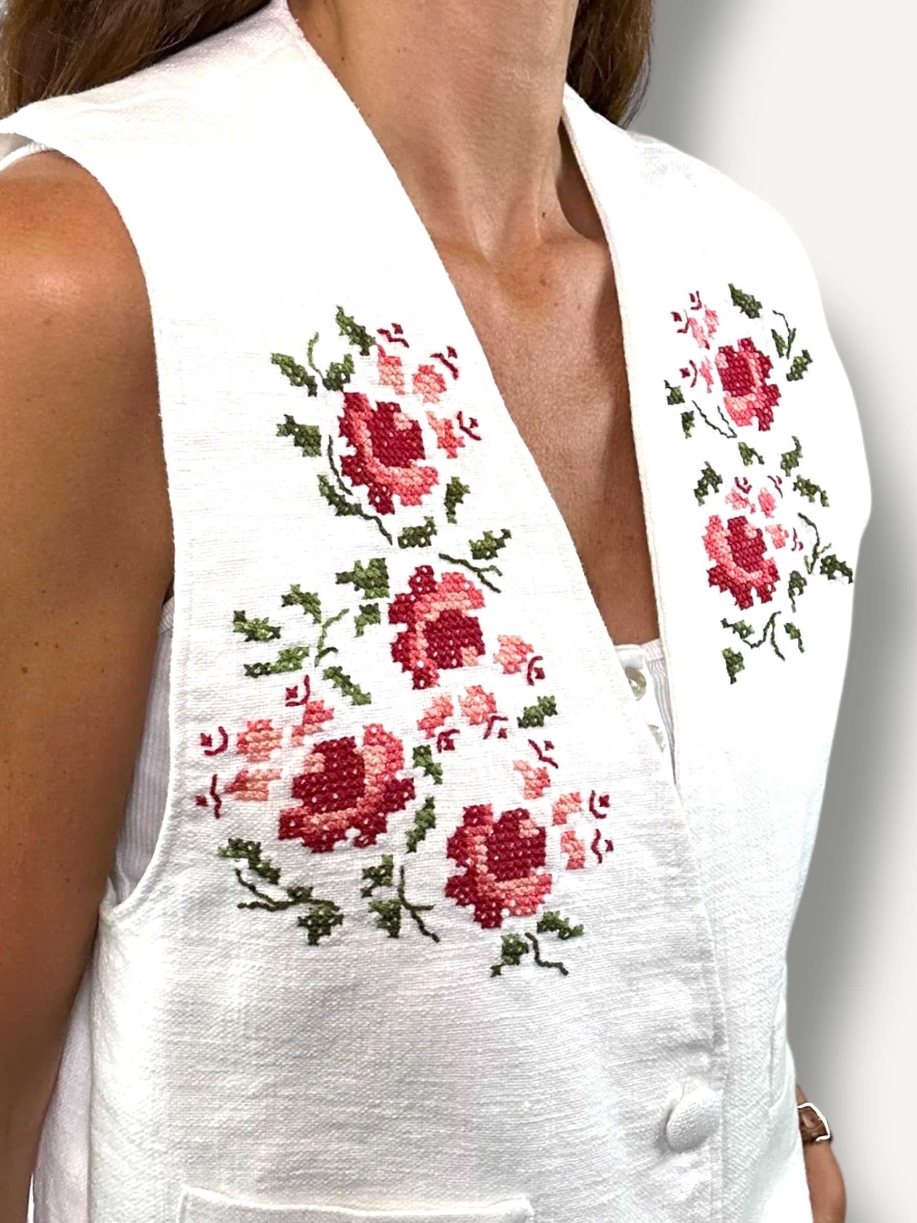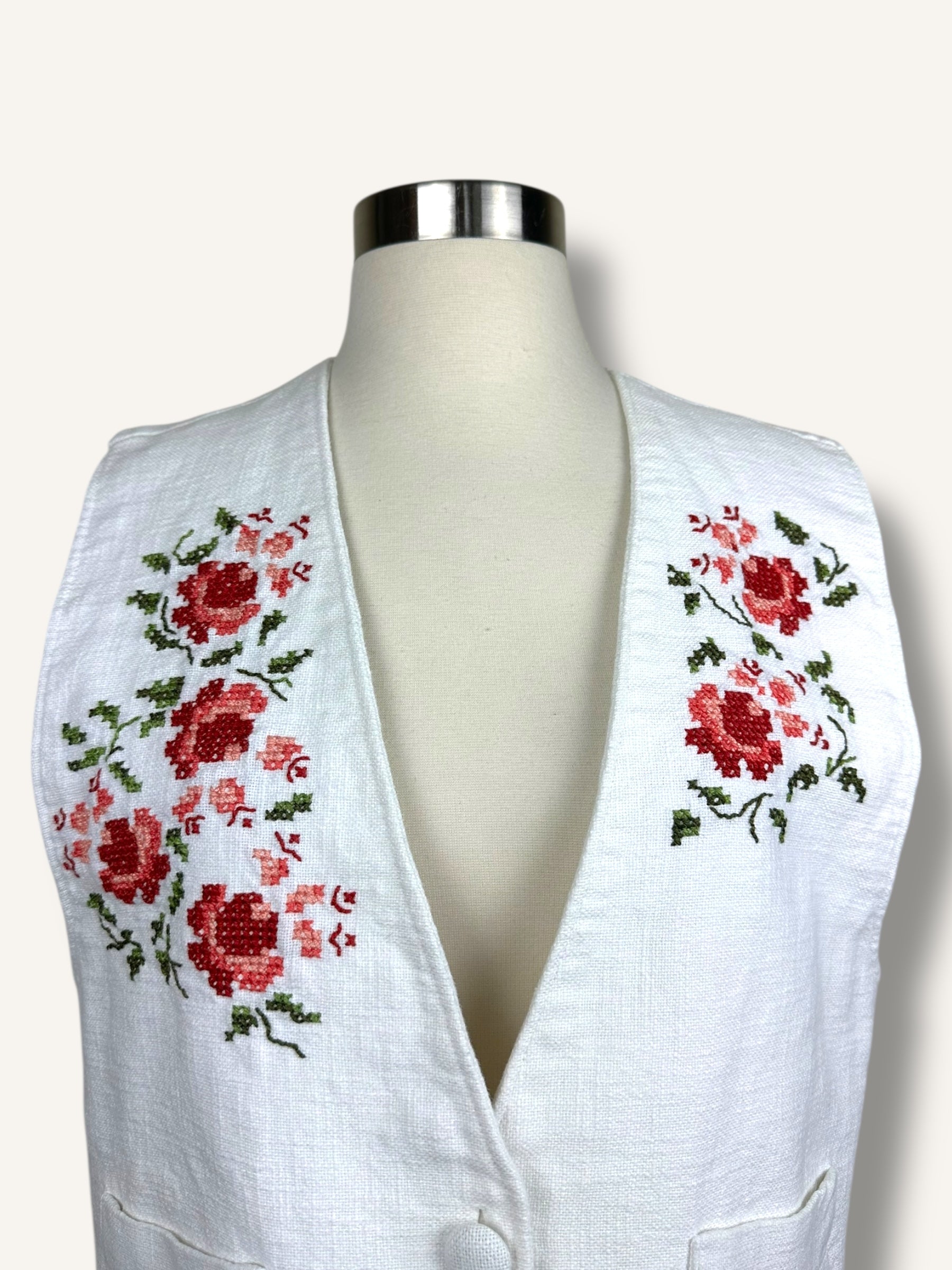 This vintage linen vest is a charming nod to folk-inspired style, featuring beautiful hand-embroidered floral motifs in shades of red and pink across the chest. Made from crisp white linen, it has a flattering V-neckline, fabric-covered buttons, and two front pockets. The pointed hem adds structure to its soft silhouette, making it perfect layered over a dress or styled with denim for a relaxed, romantic look.