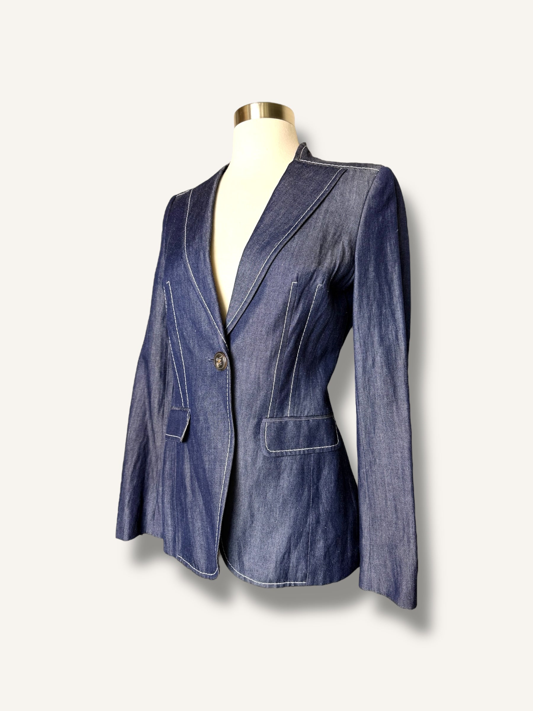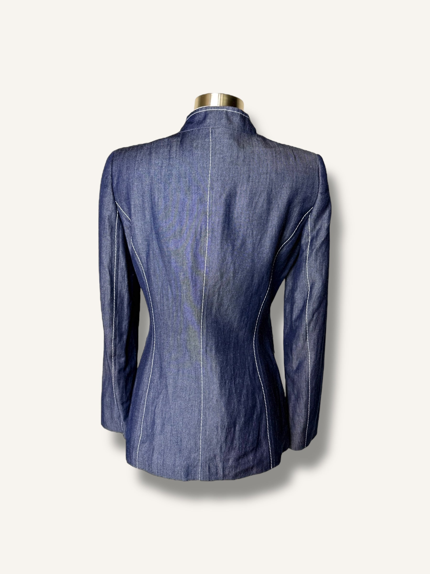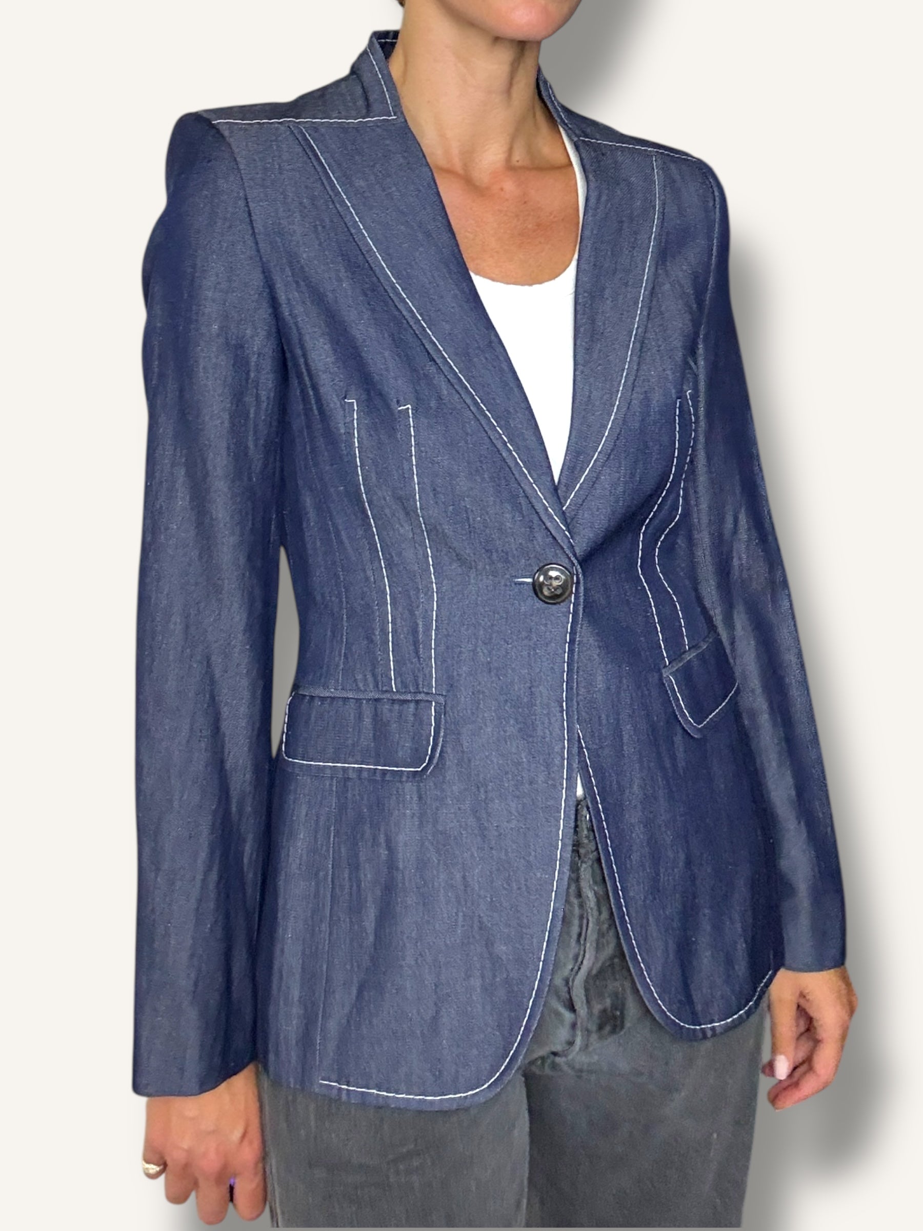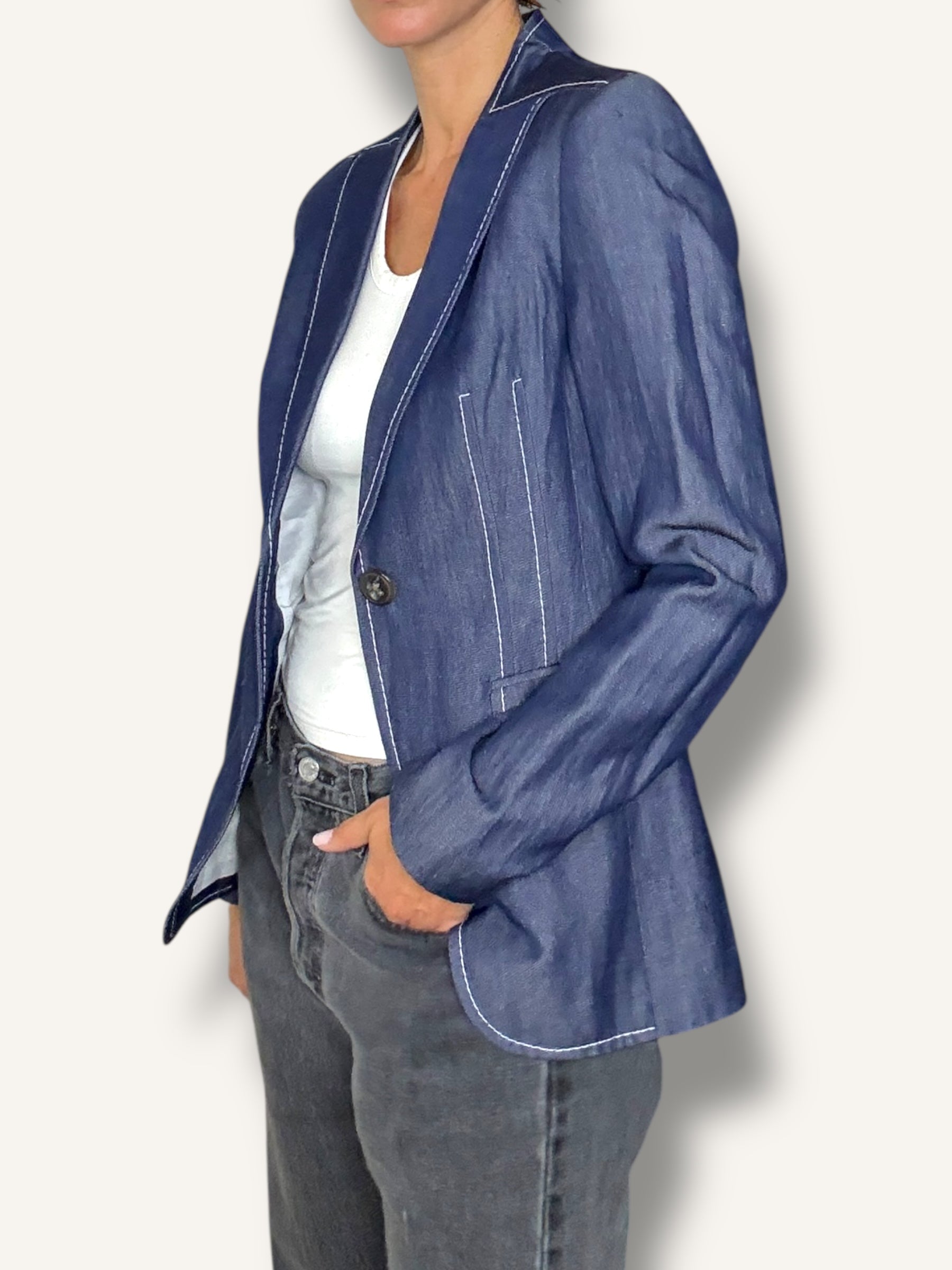 Vintage Escada tailored blazer crafted from structured indigo cotton chambray. Features sharp lapels, contrast topstitching, flap pockets, and a single-button closure. Sleek, versatile, and timelessly chic.