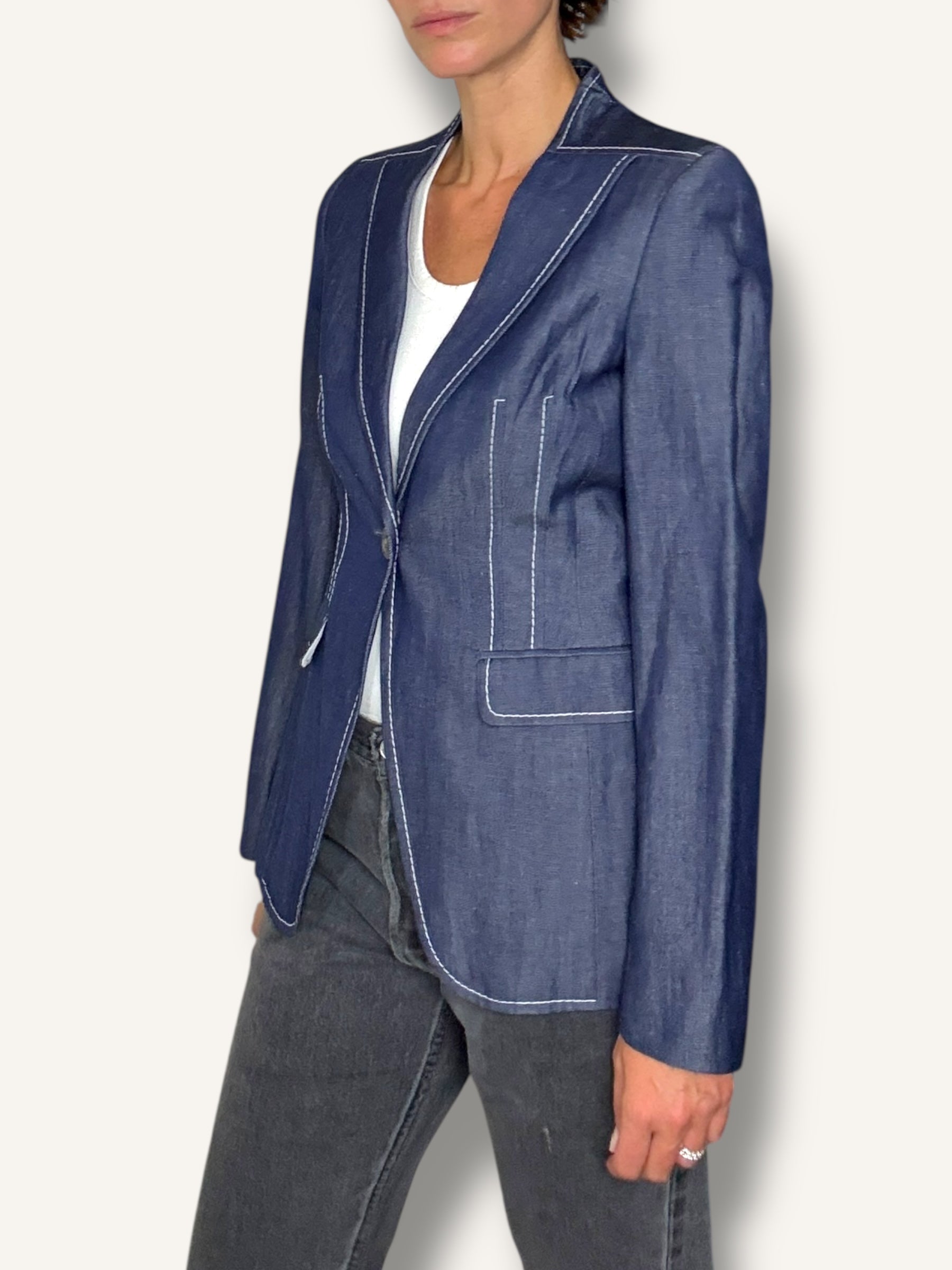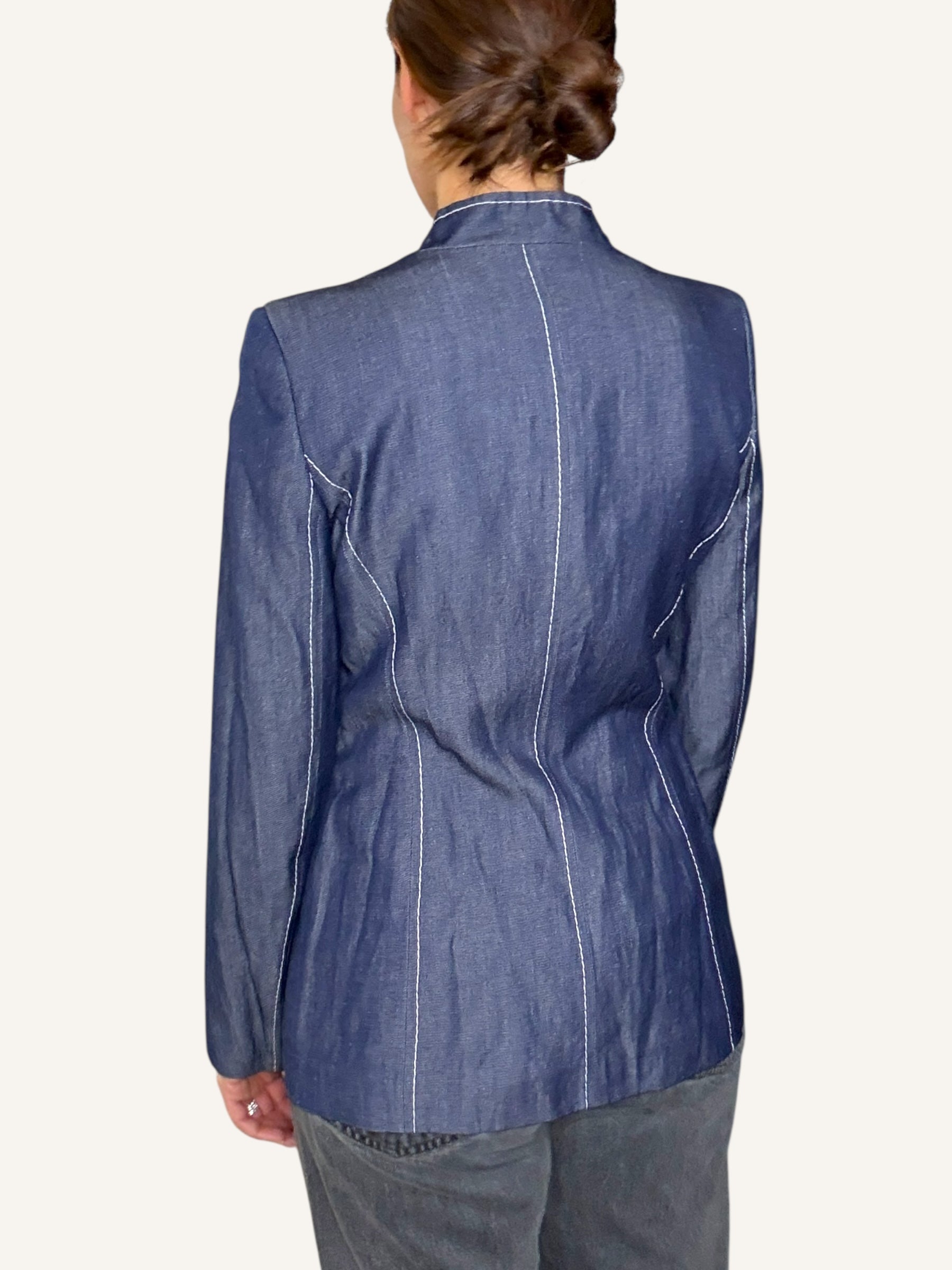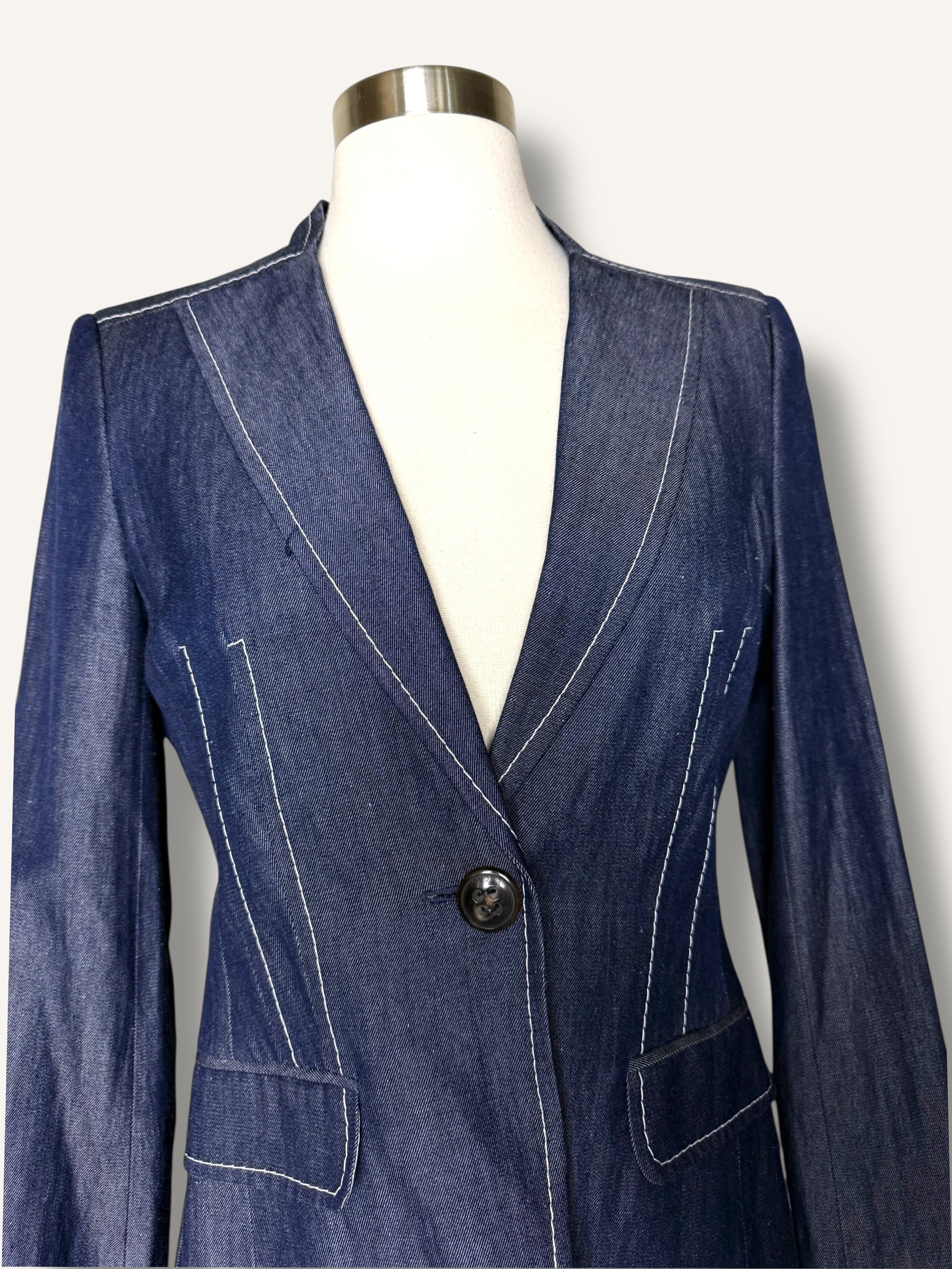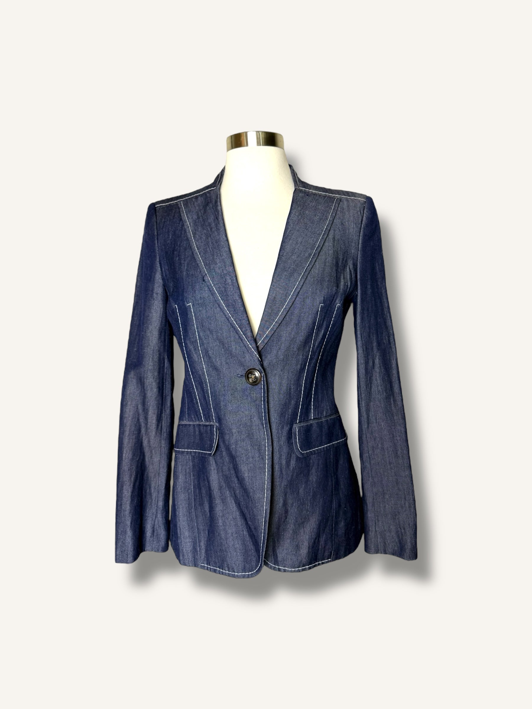Vintage Escada tailored blazer crafted from structured indigo cotton chambray. Features sharp lapels, contrast topstitching, flap pockets, and a single-button closure. Sleek, versatile, and timelessly chic.