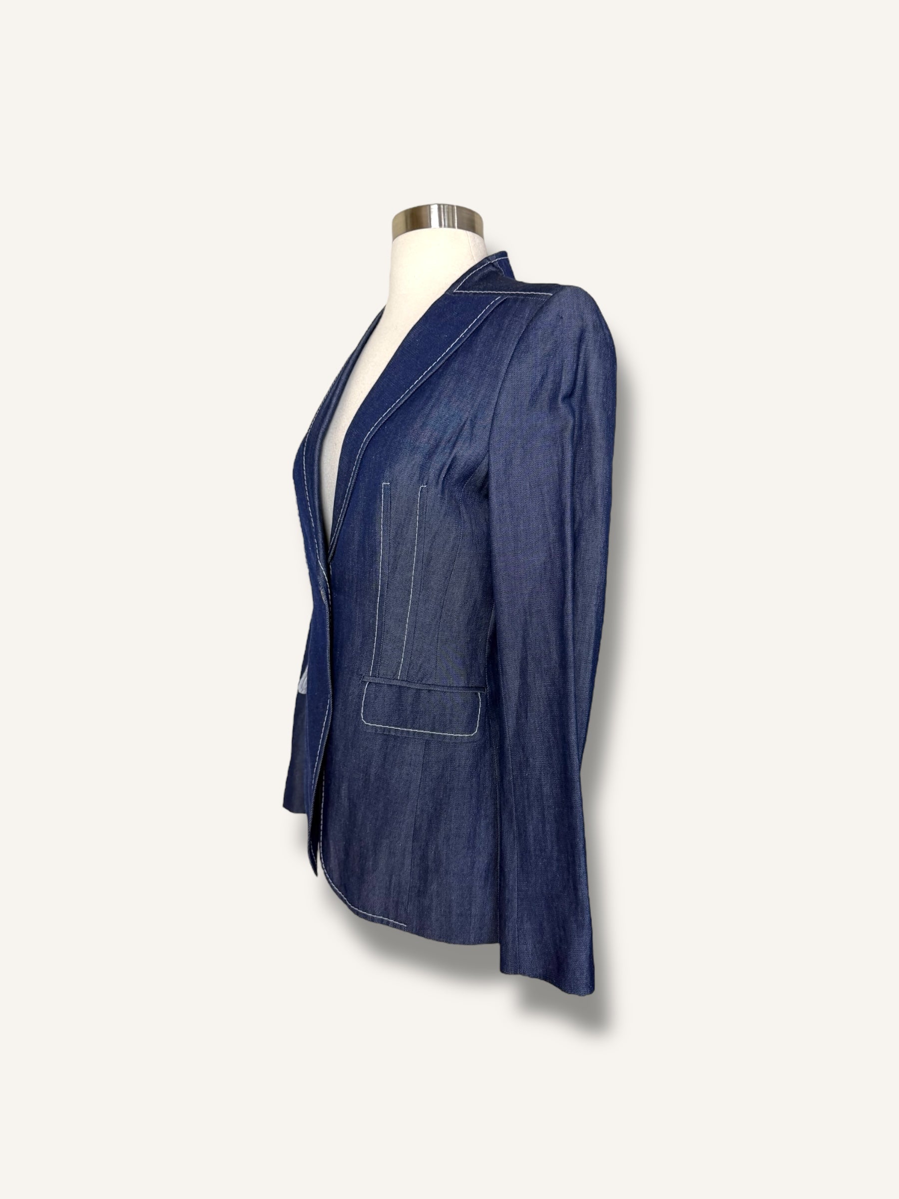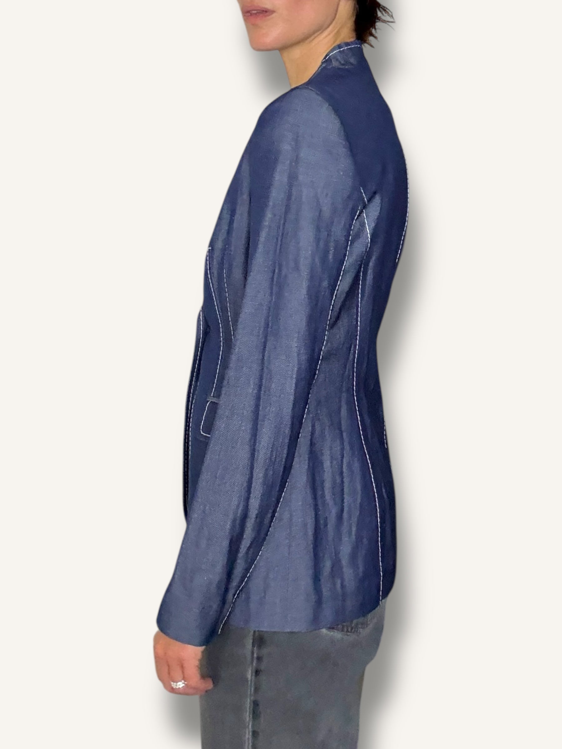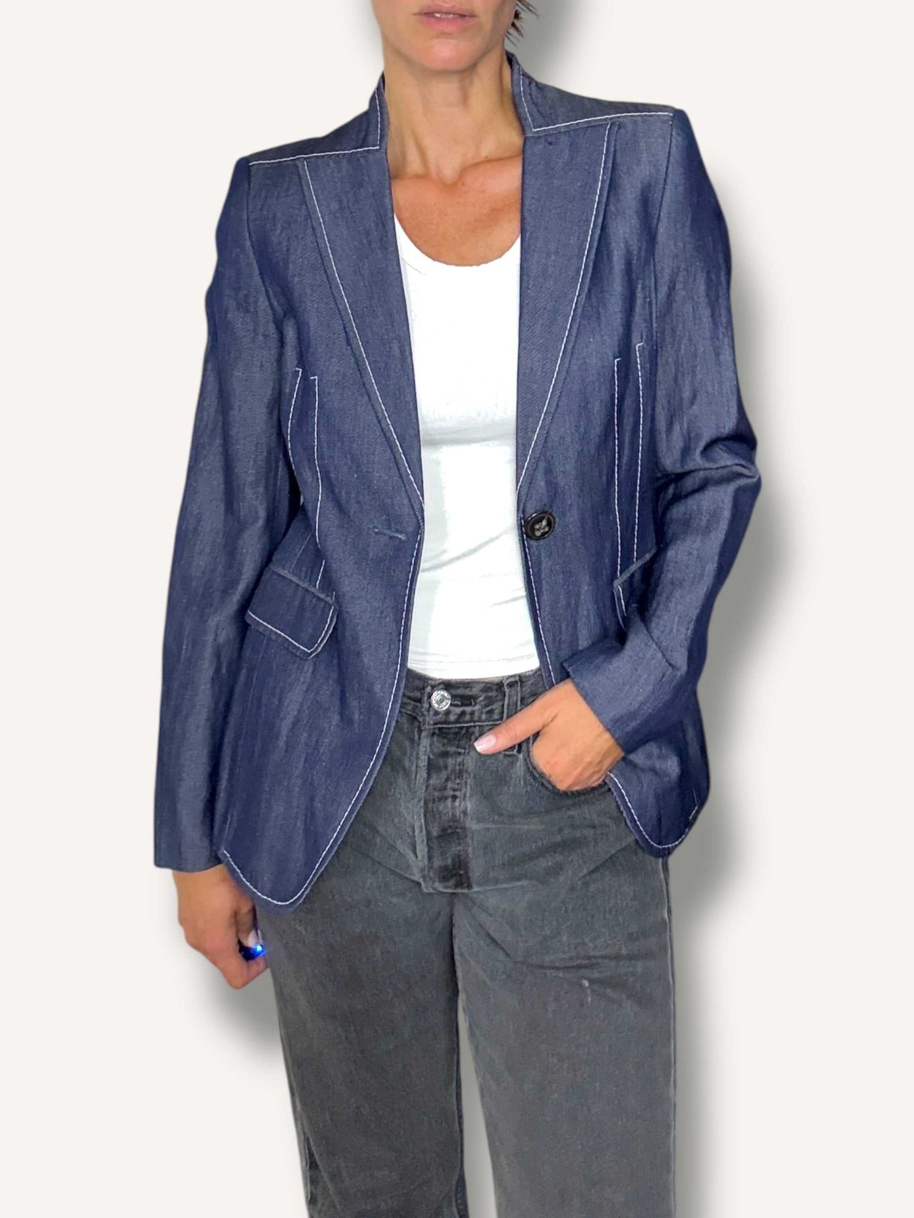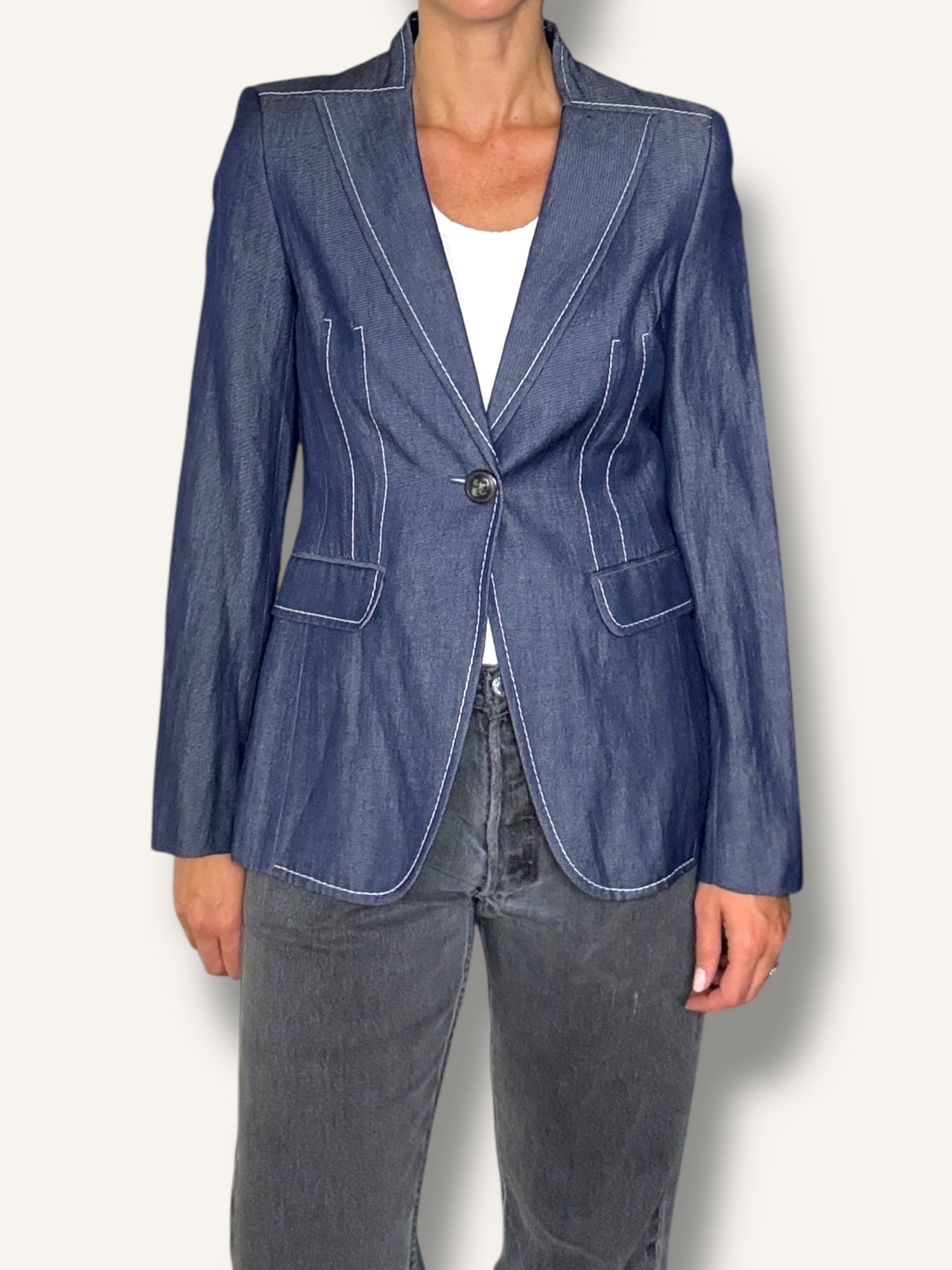 Vintage Escada tailored blazer crafted from structured indigo cotton chambray. Features sharp lapels, contrast topstitching, flap pockets, and a single-button closure. Sleek, versatile, and timelessly chic.
