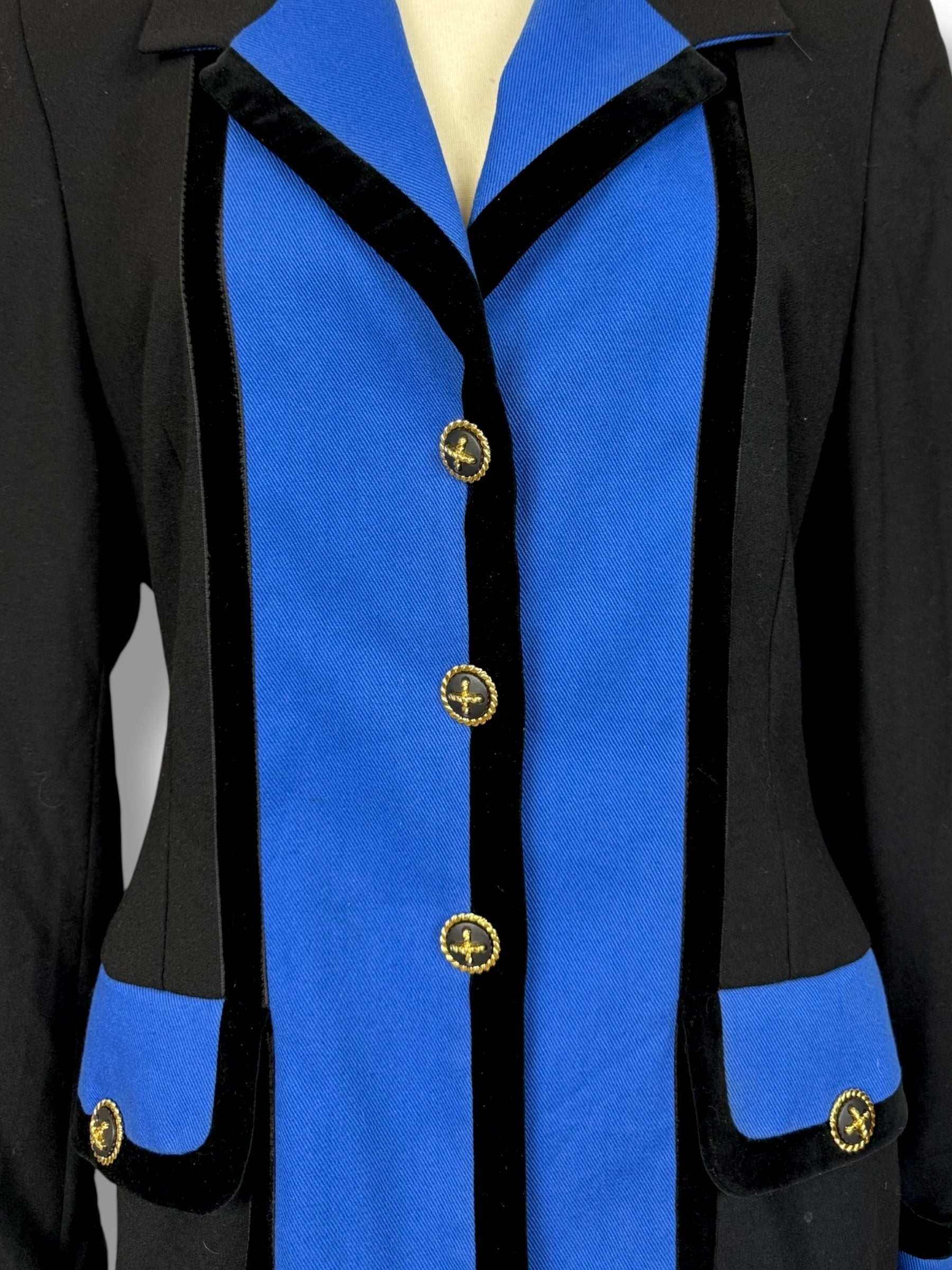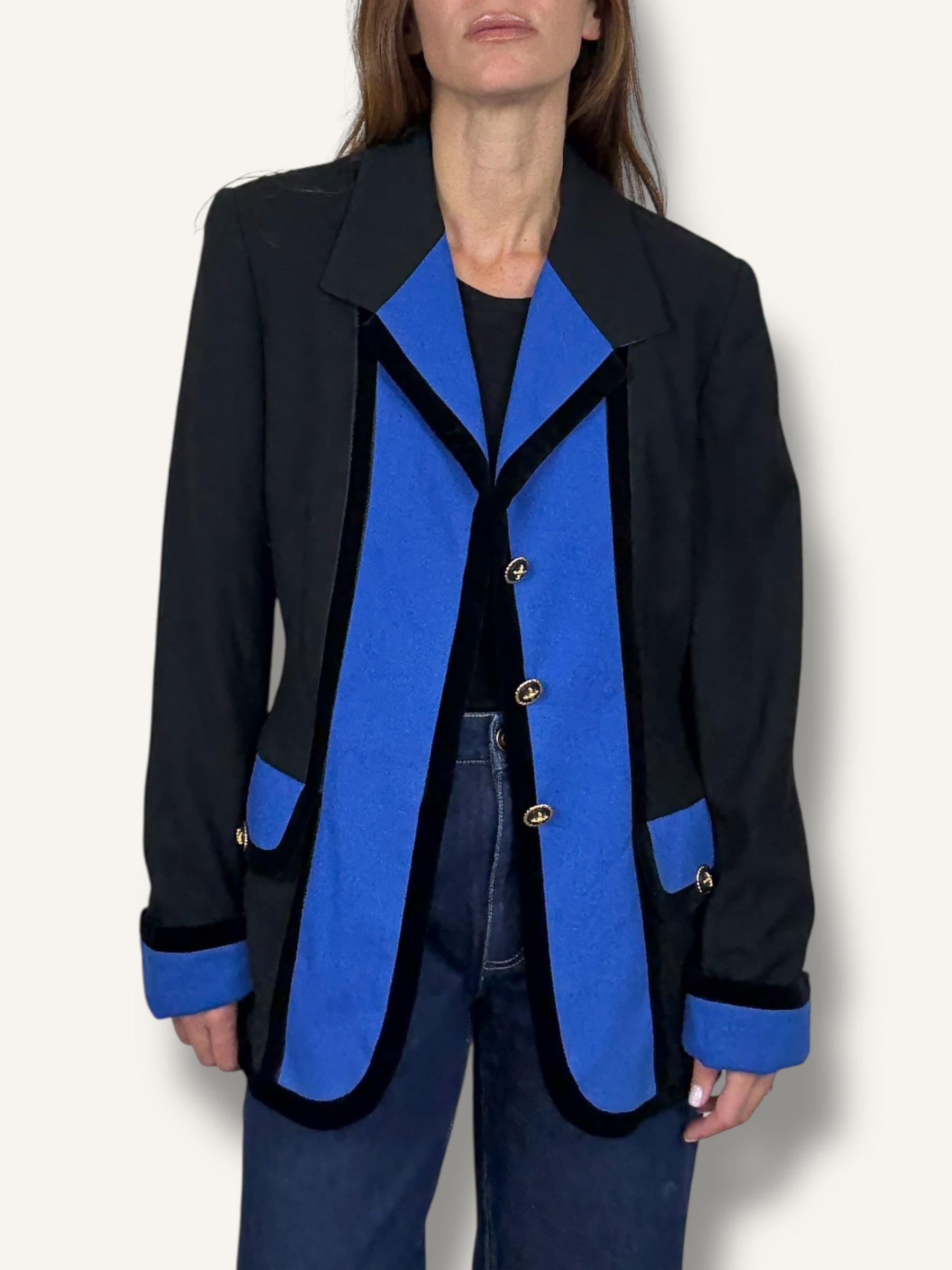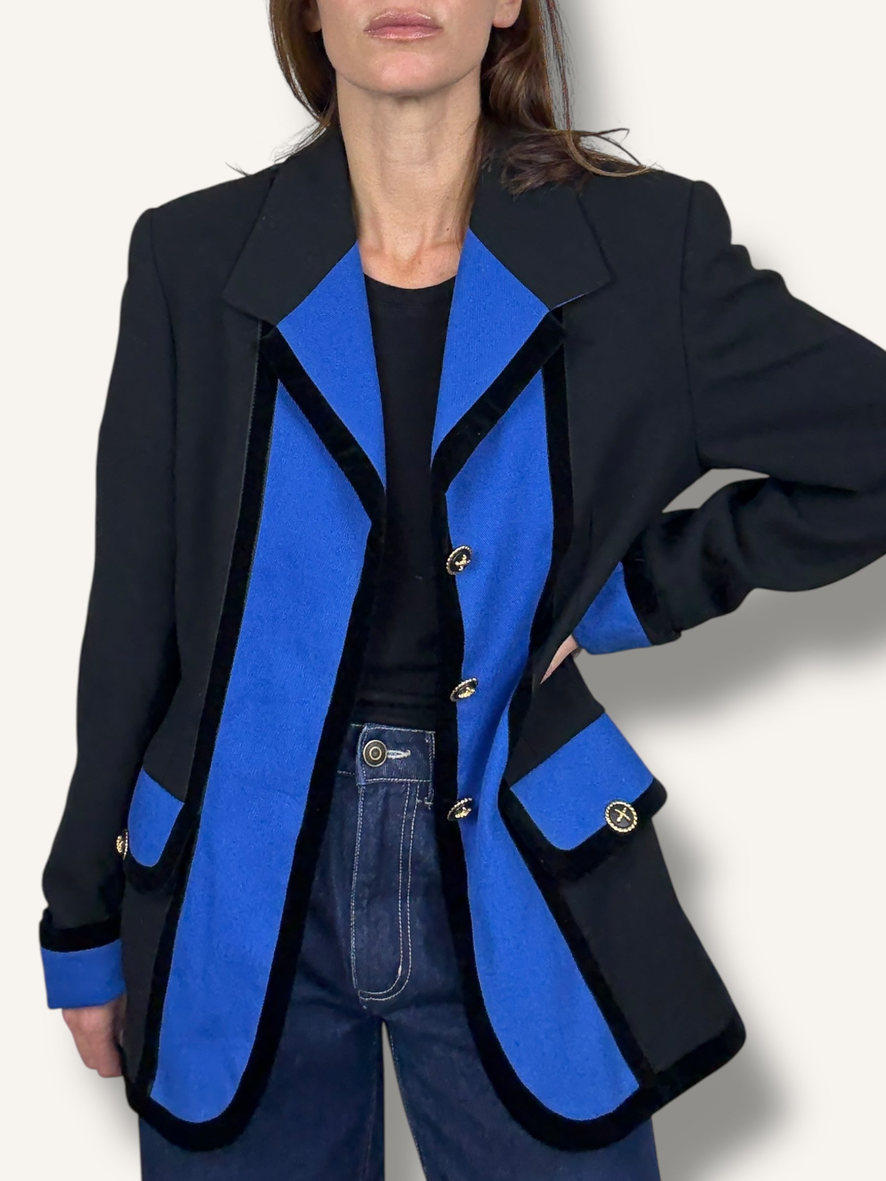 Vintage Escada wool blazer featuring a striking cobalt blue front panel framed with black velvet trim. Designed with sharp tailoring, structured shoulders, and gold crest buttons down the front and on the flap pockets. The contrast blue and black design carries through to the cuffs for a polished finish. Fully lined with a smooth interior, this piece blends bold color blocking with timeless sophistication.