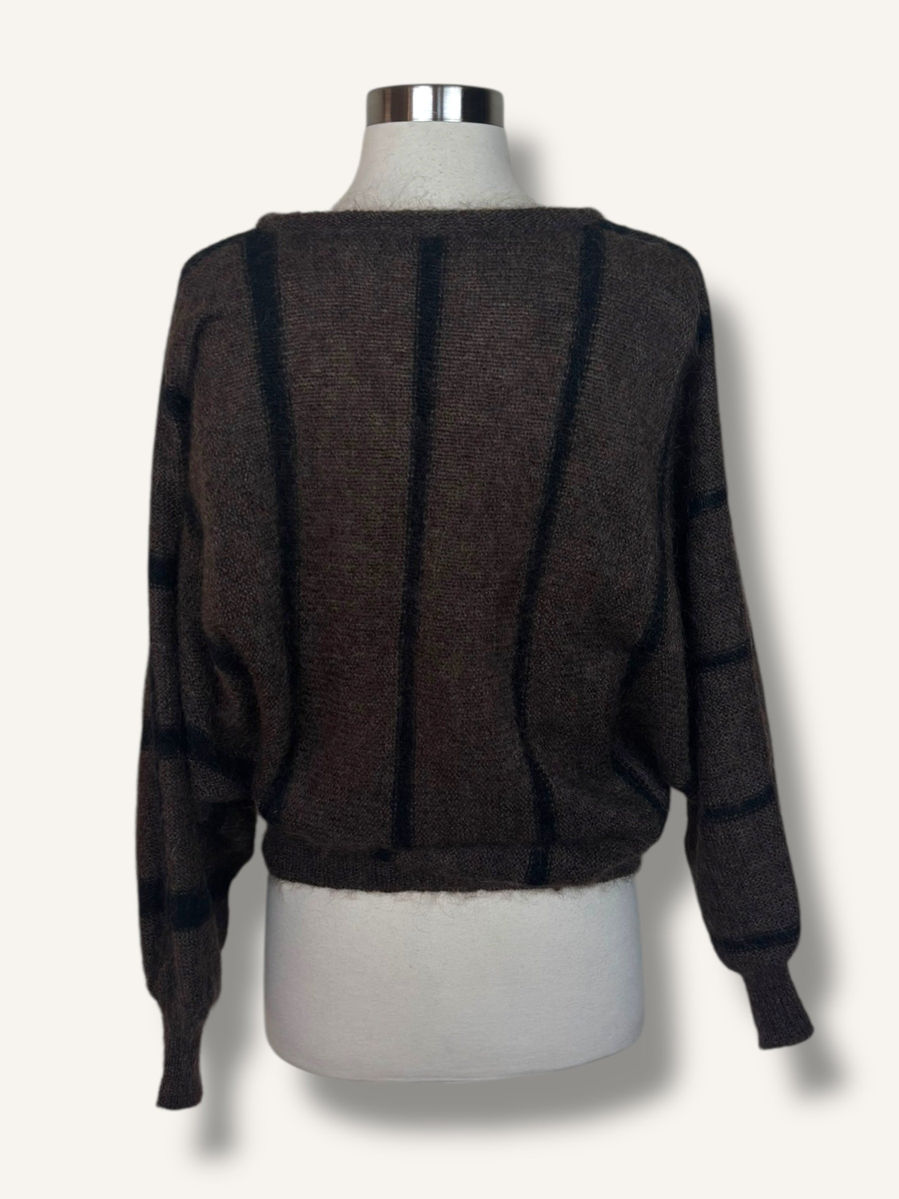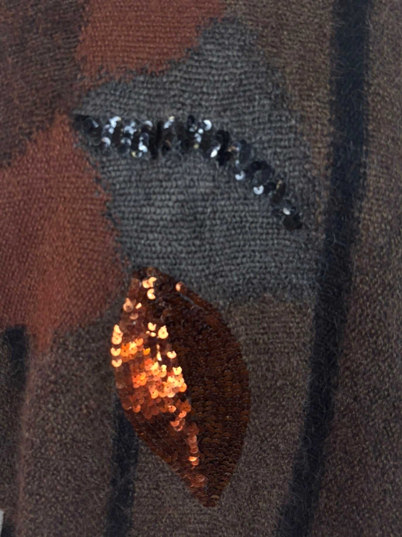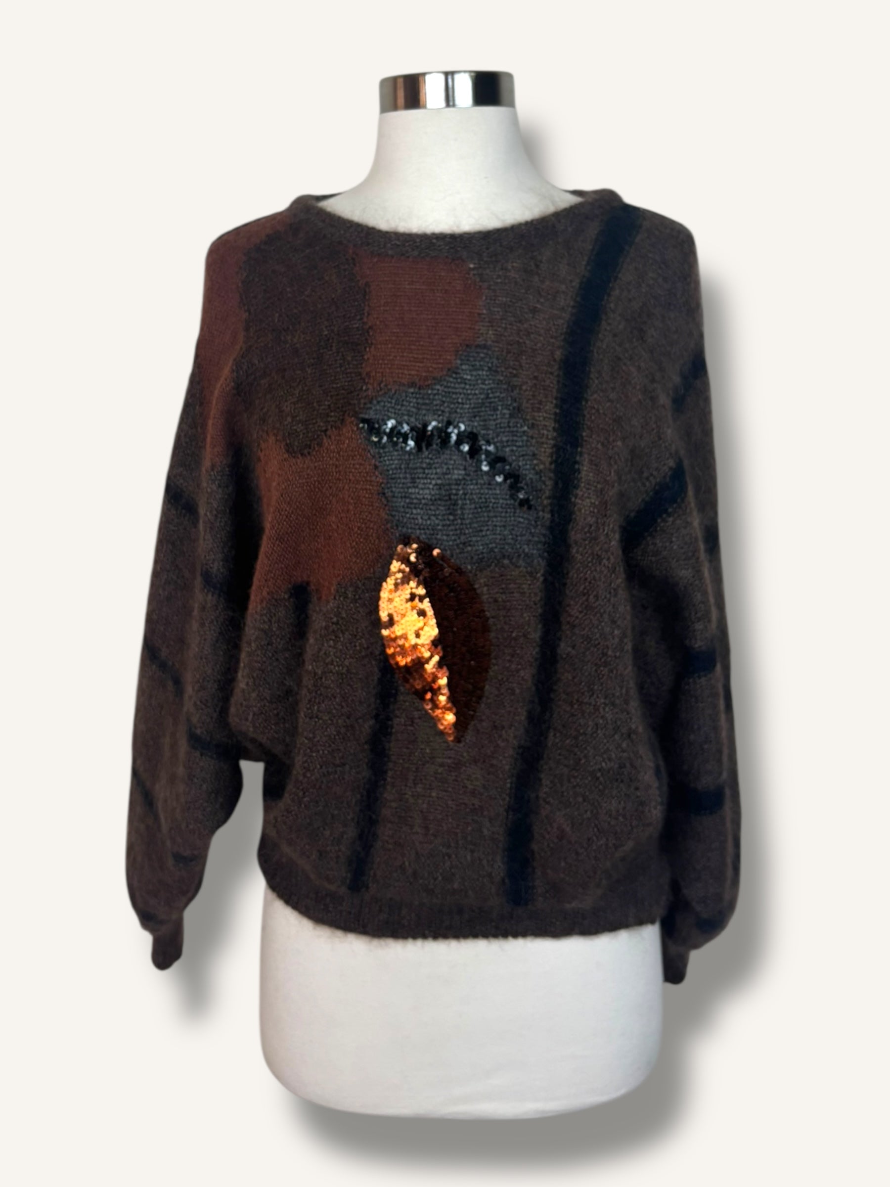 A rare Escada vintage treasure, this beautifully textured wool sweater blends warm earth tones with an abstract floral motif and hand-sewn sequin accents. The relaxed silhouette, soft dolman sleeves, and ribbed hem create an effortlessly elegant shape that drapes beautifully. Unique graphic lines add structure, while the shimmering sequins bring a subtle touch of glamour.