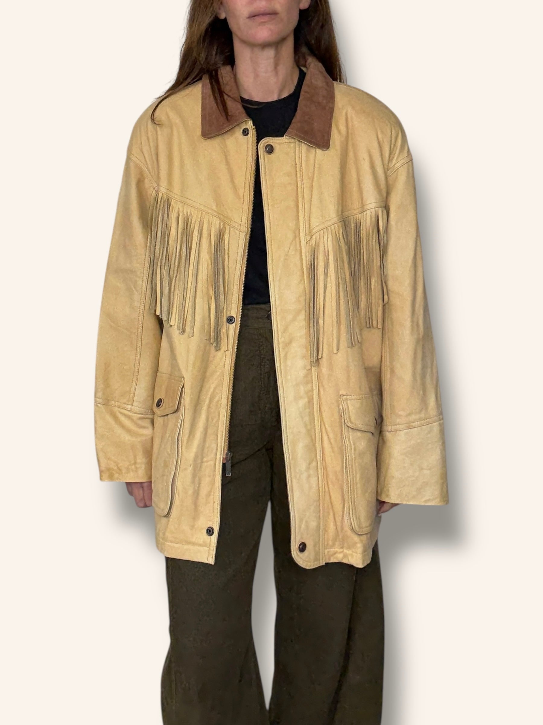 Vintage Leather Fringe Jacket. Western charm meets timeless cool in this vintage leather jacket featuring long leather fringe across the chest, back, and sleeves. Crafted from soft tan leather with a contrasting brown suede collar, it exudes a relaxed, lived-in attitude. Oversized fit with large front pockets , the perfect throw-on piece for effortless, rugged style.