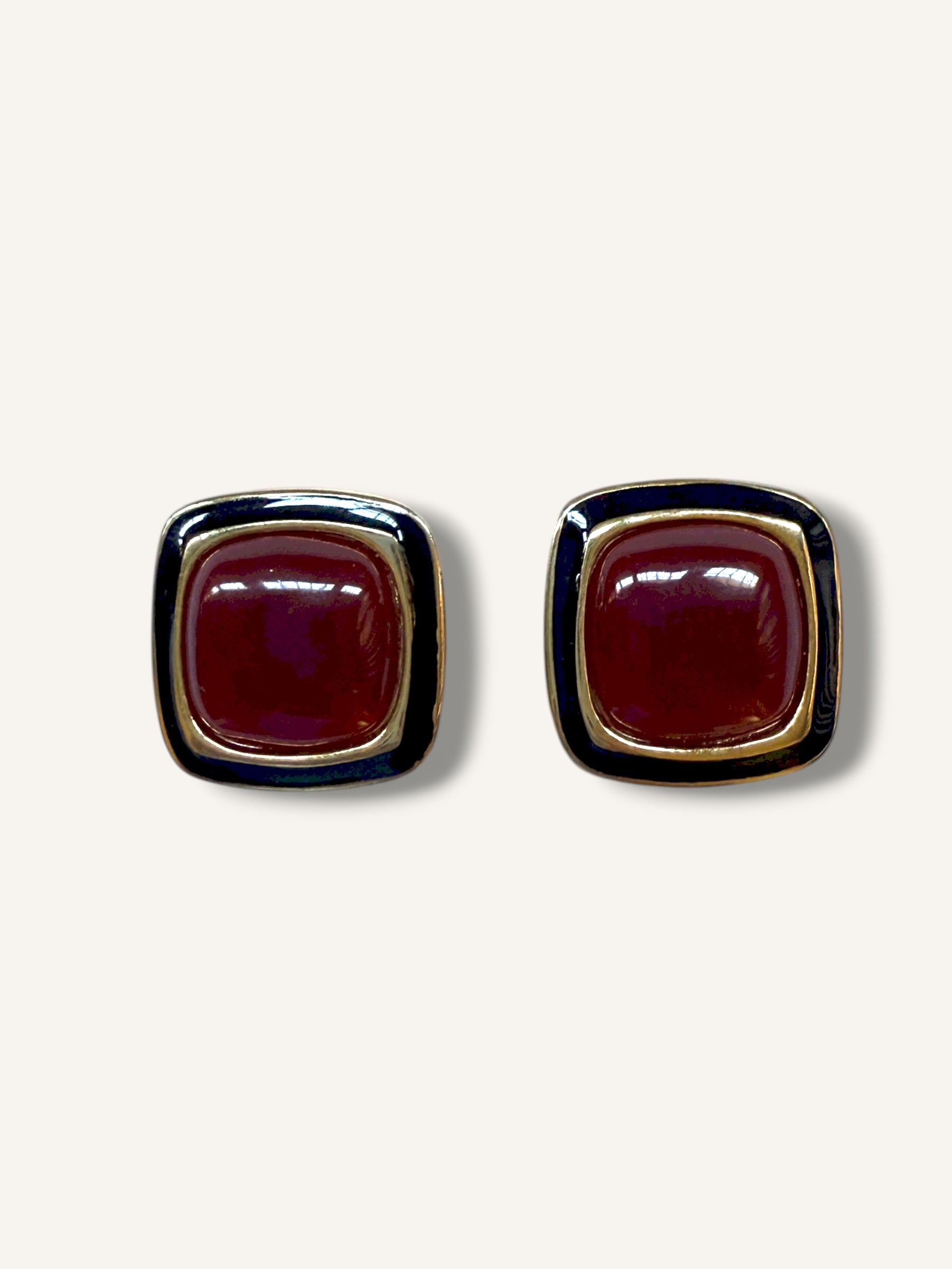 Vintage 1980s Clip-On Earrings — Deep Garnet Enamel + Gold Trim. Chic and minimal with that unmistakable 80s glamour. These square clip-on earrings feature a rich garnet-red enamel cabochon framed in glossy black and gold-tone metal — a sleek, architectural silhouette that feels both modern and timeless. Comfortable clip backs make them effortless to wear day or night. The perfect pop of color for a polished, vintage-lux look.