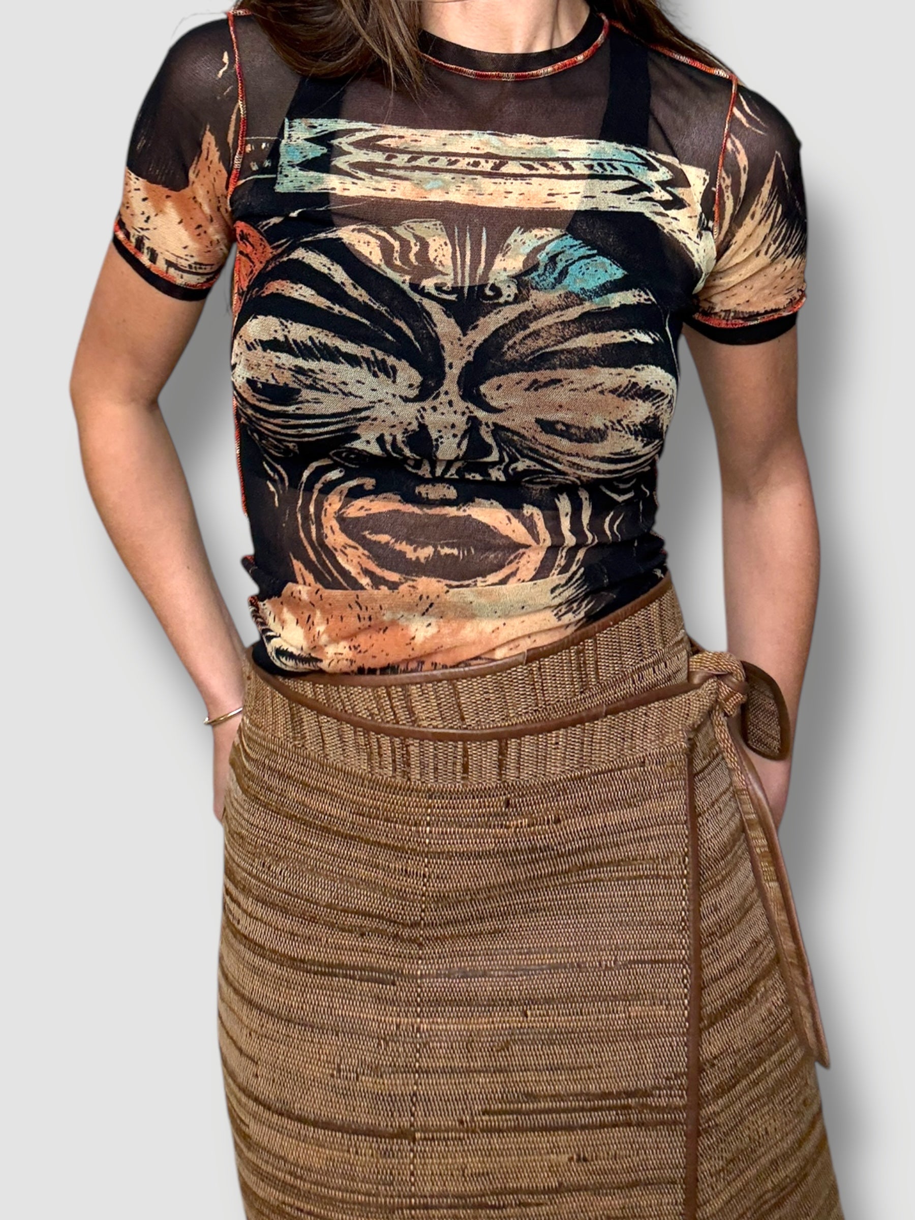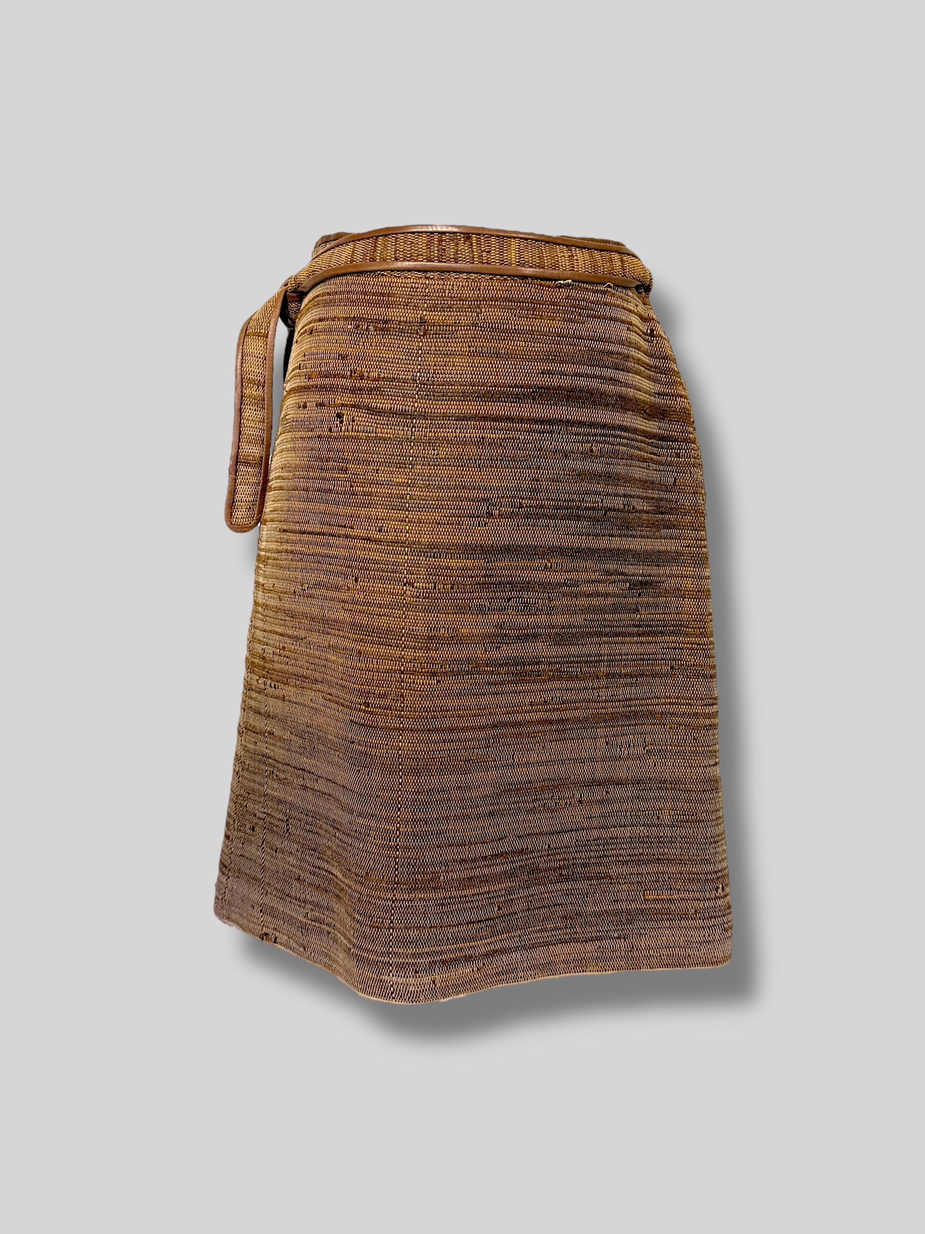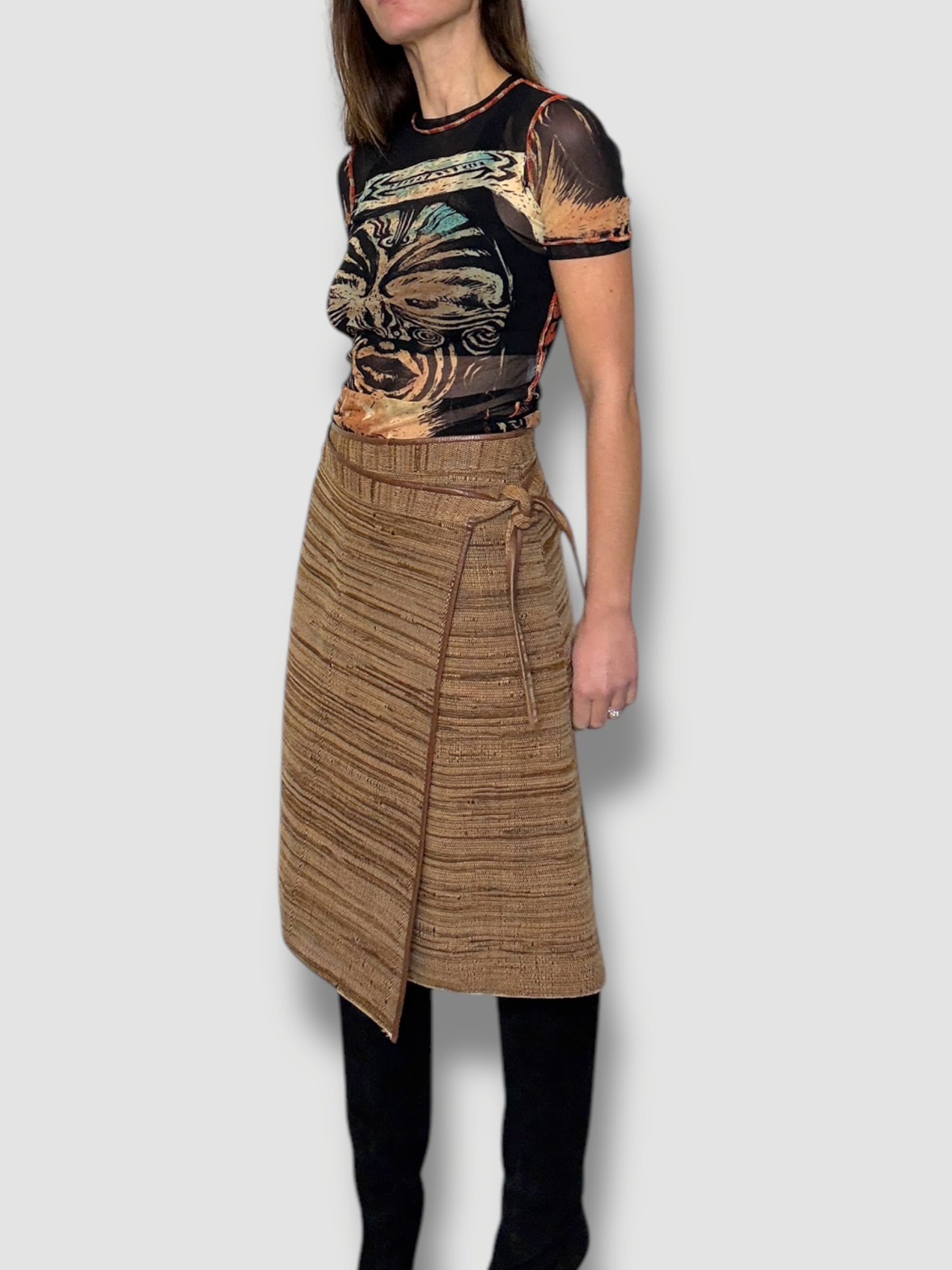 This vintage Givenchy wrap skirt is an exceptional piece of fashion history, blending the luxurious craftsmanship of the house of Givenchy with an organic, textural elegance. Crafted from intricately woven fabric, the skirt showcases earthy, tonal hues that create a natural, raw yet refined aesthetic.