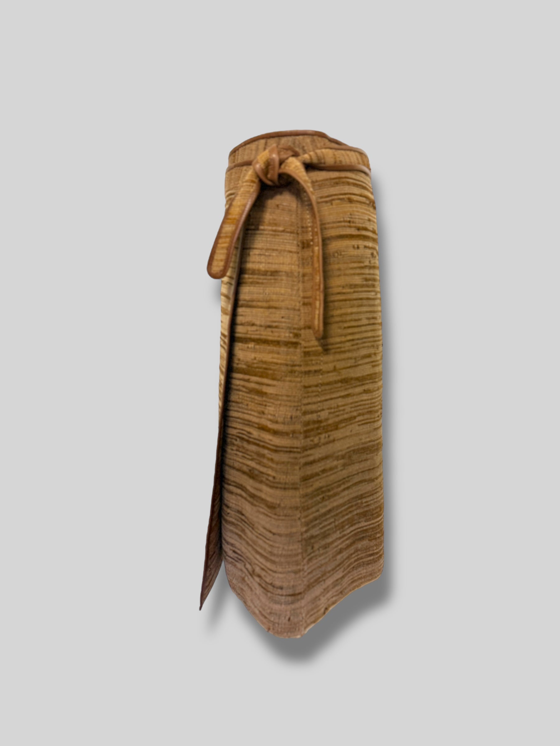 The wrap silhouette is accentuated with buttery leather trim, adding structure and contrast while highlighting the skirt’s couture-level details. A leather tie closure ensures a customizable fit, while the rich texture and impeccable construction make this a true collector’s item.