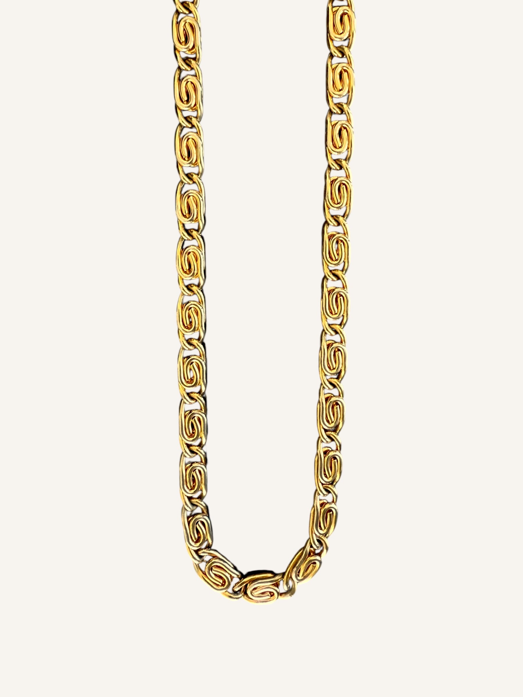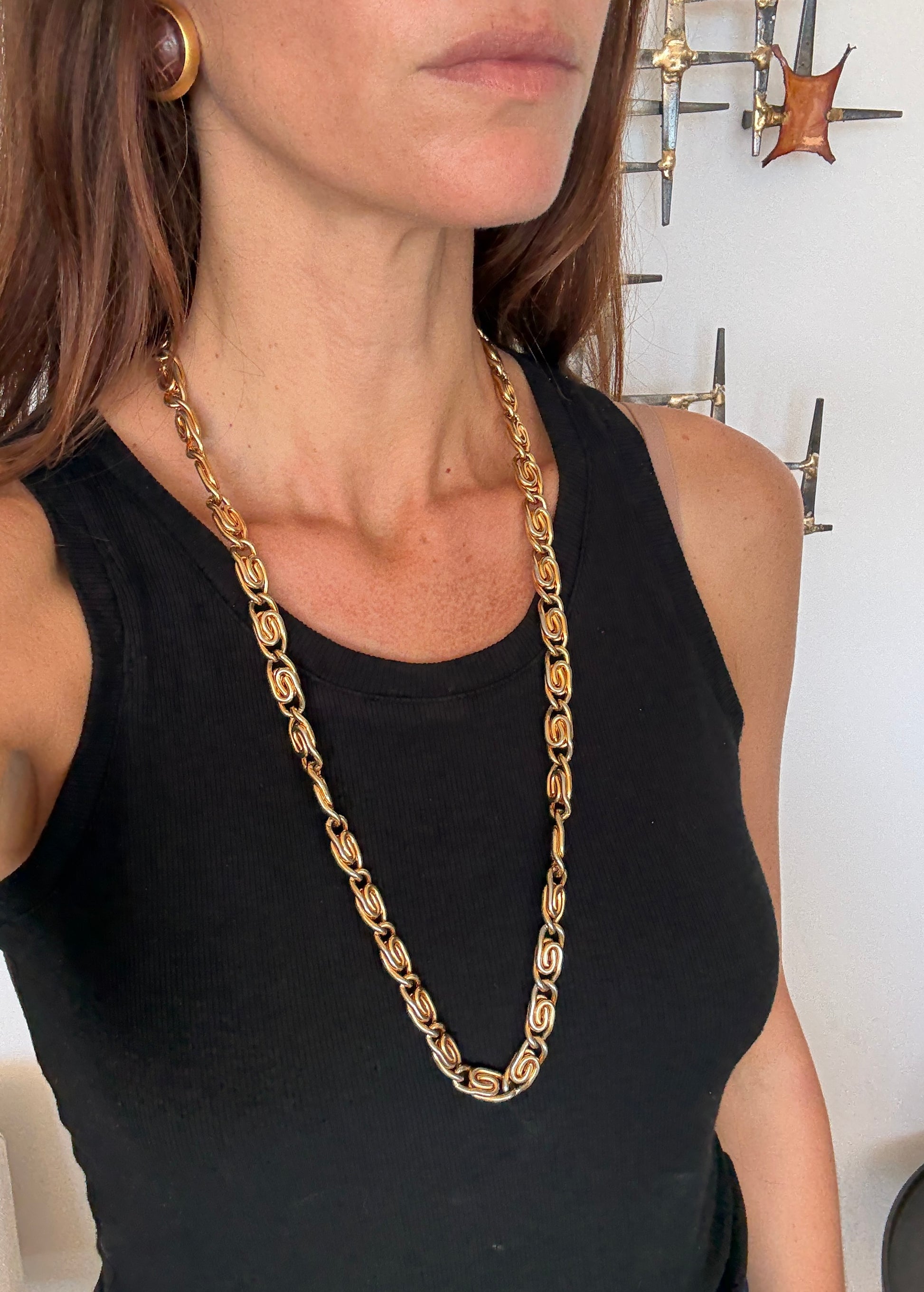 Bold vintage Erwin Pearl gold-tone chain necklace featuring a textured looped-link design. The substantial weight and intricate pattern give it a striking, sculptural feel, making it an easy statement piece. Double it or leave it long. Finished with a secure clasp closure, it layers effortlessly or stands out on its own.