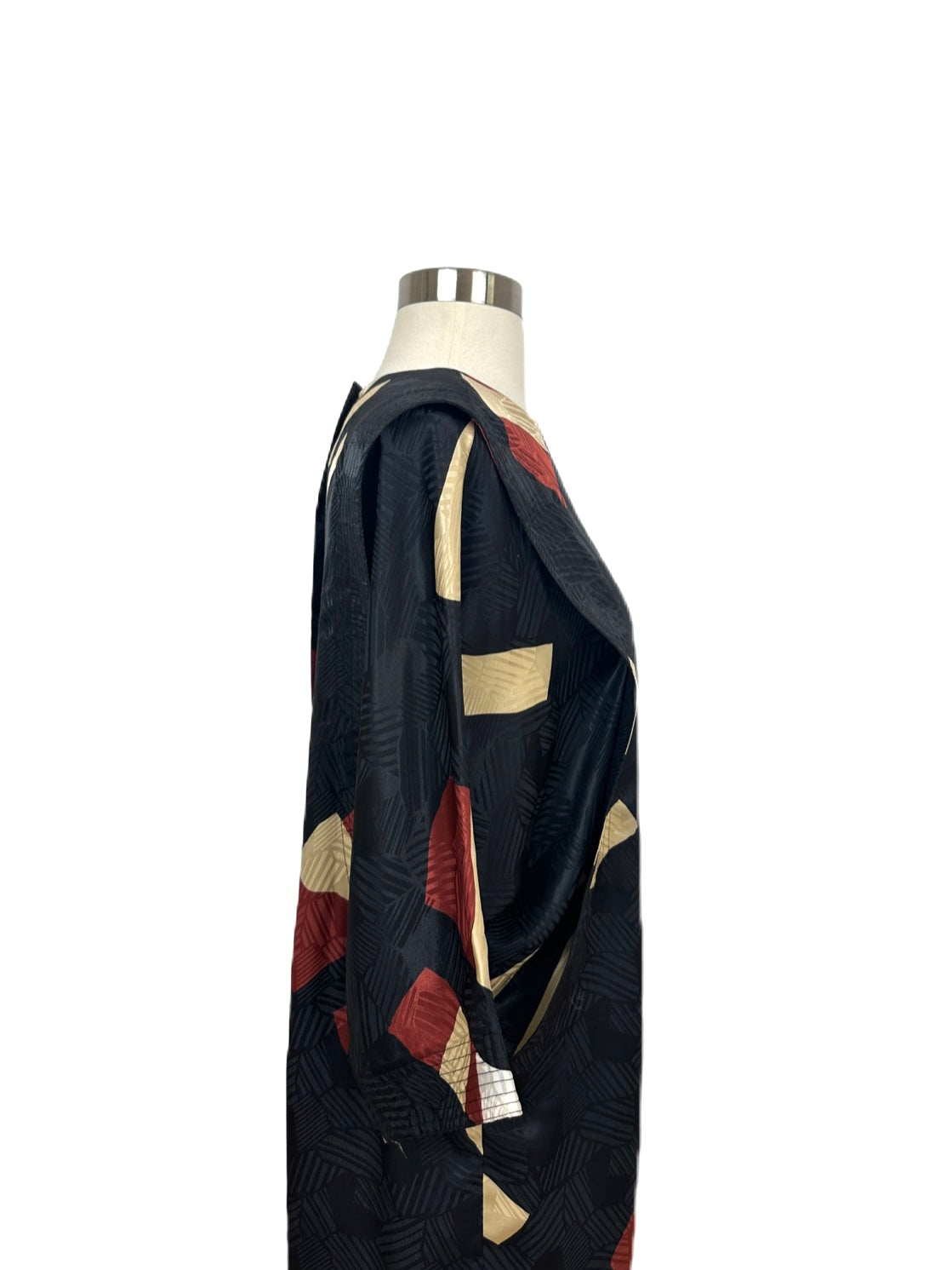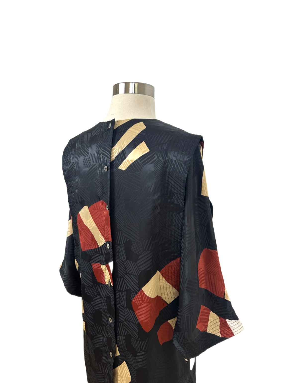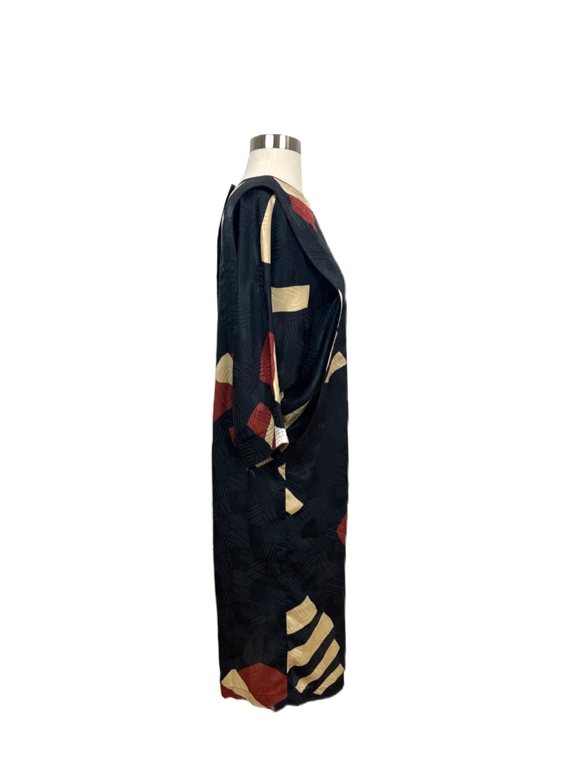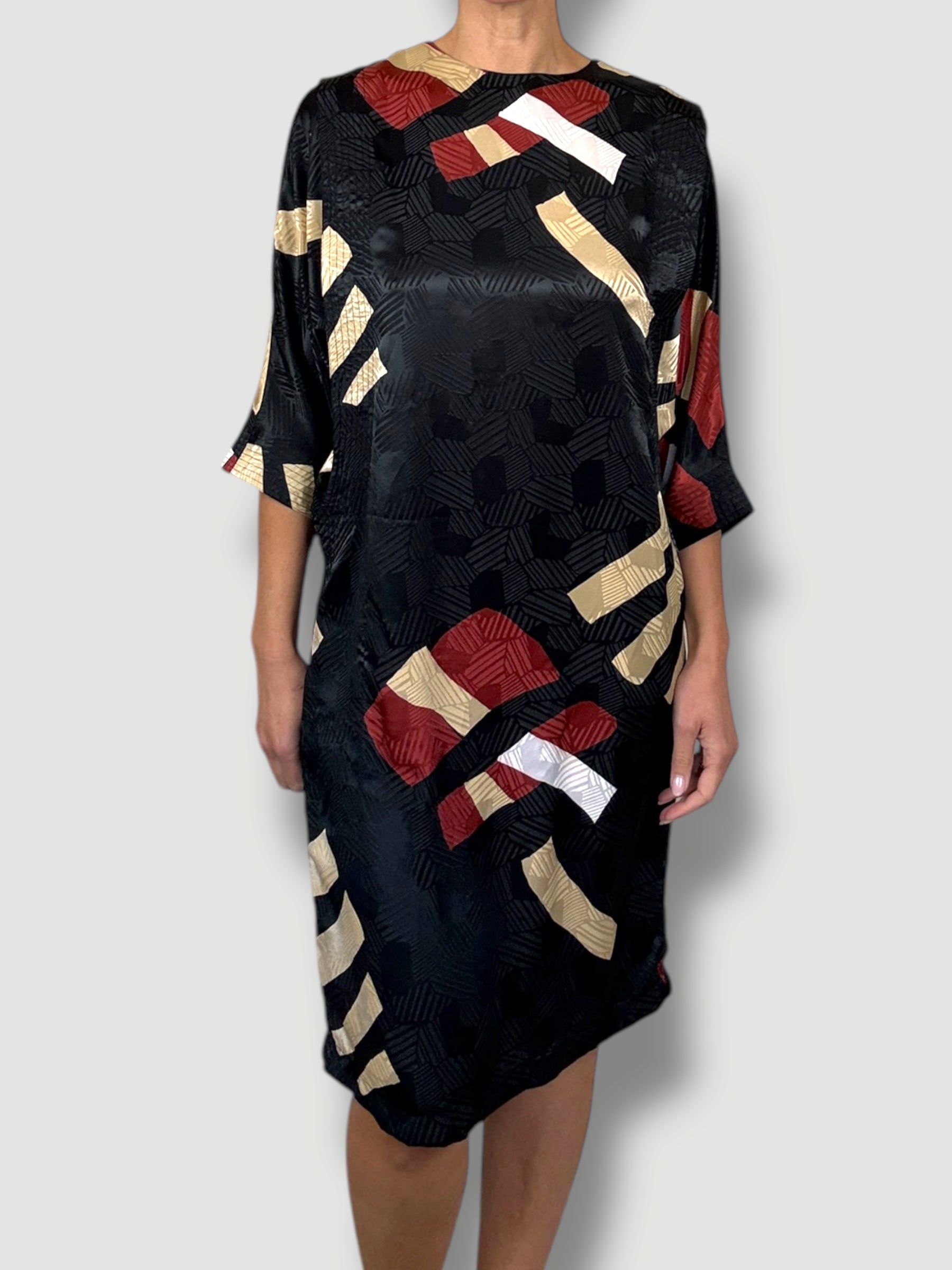 Vintage dress in a silky jacquard fabric with geometric abstract patterns in gold, red, and ivory over a black tonal textured base. Designed with a relaxed, draped silhouette, elbow-length sleeves, and hidden side pockets, it blends bold design with easy elegance.