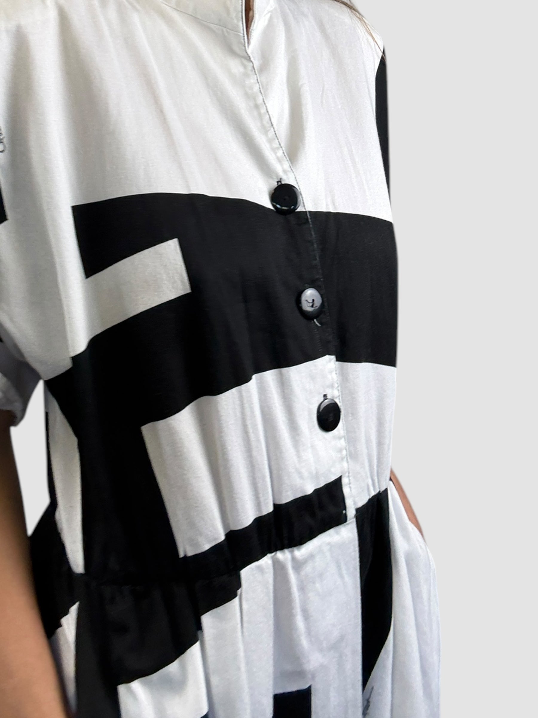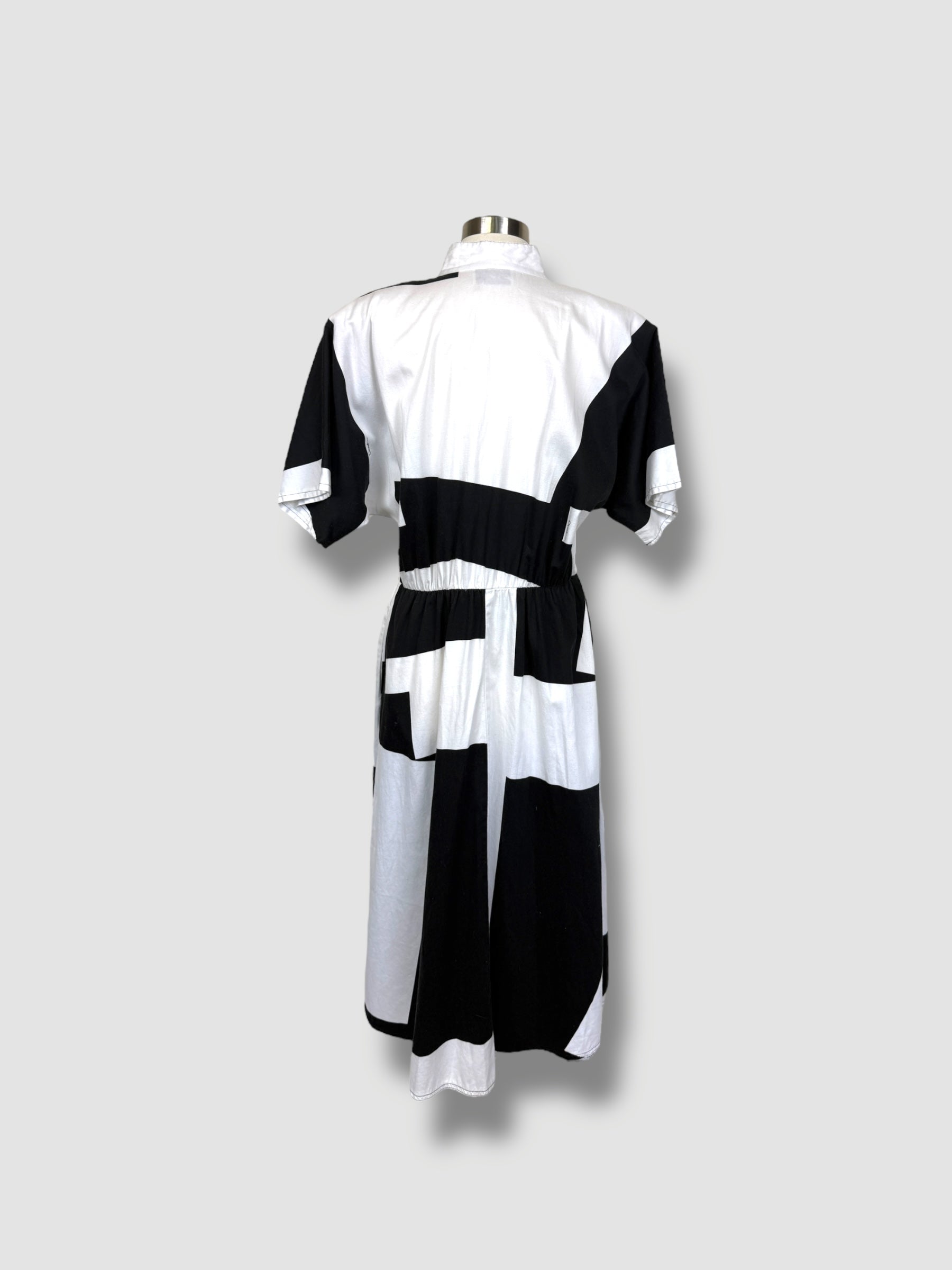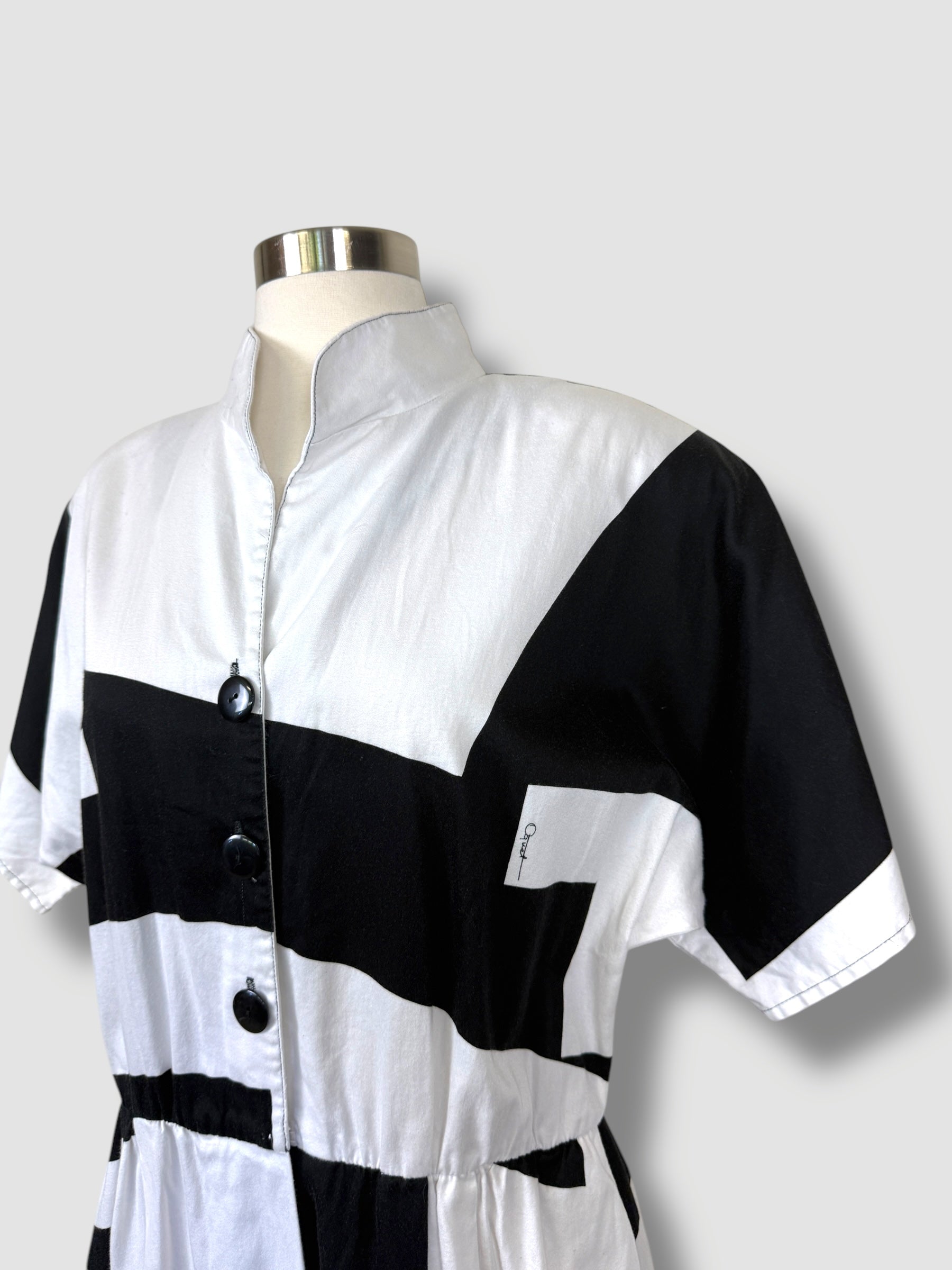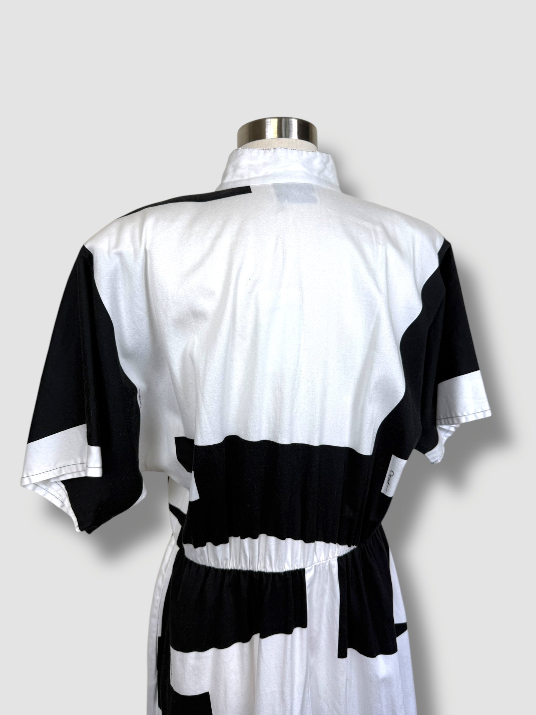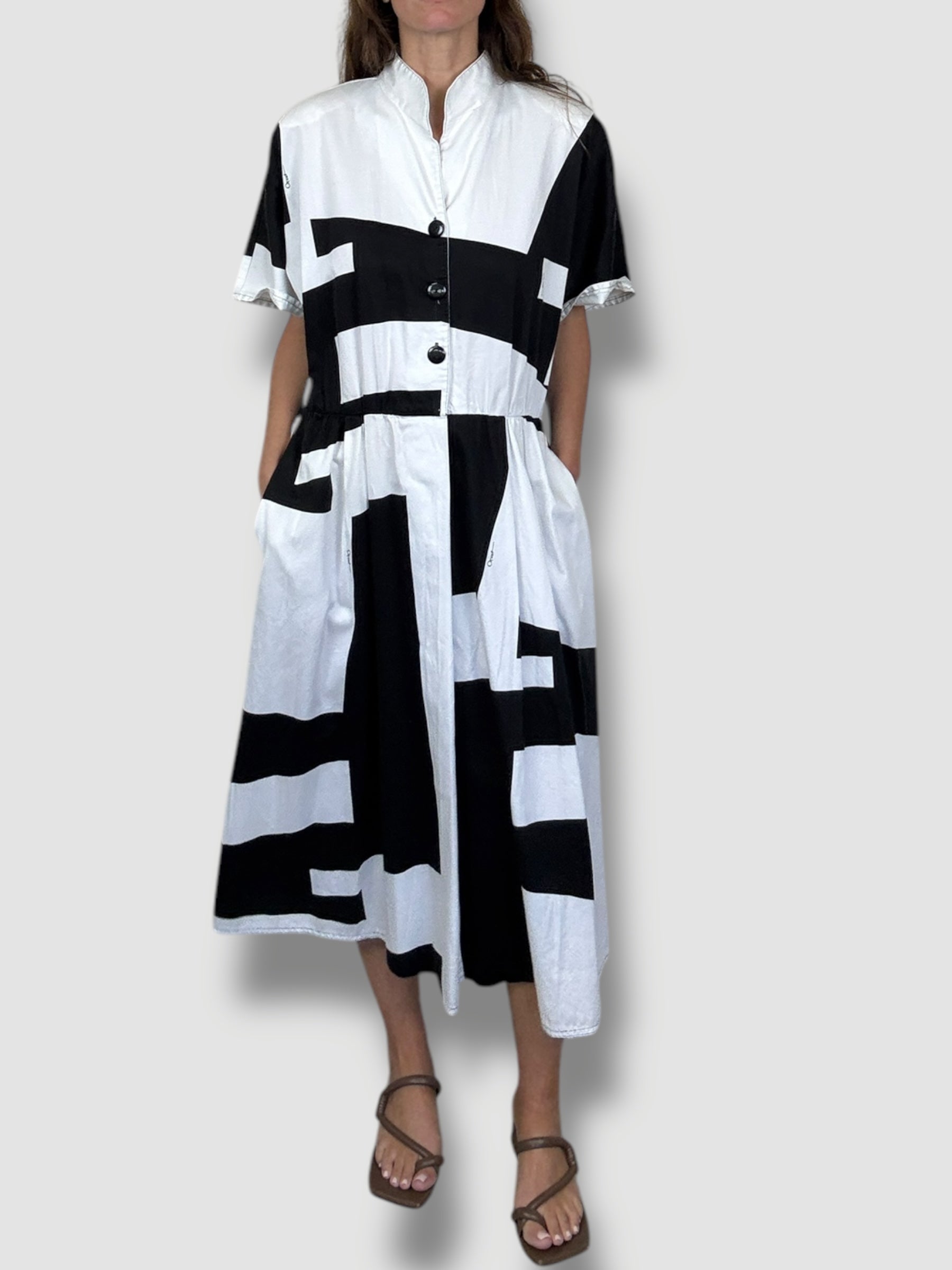 A graphic showstopper, this vintage midi dress features a bold black-and-white abstract print with architectural edge. The structured stand collar, short sleeves, and gathered waist create a flattering silhouette, while front buttons and side pockets add a touch of utility. Crafted from lightweight cotton, it’s an easy statement piece that’s as comfortable as it is striking.