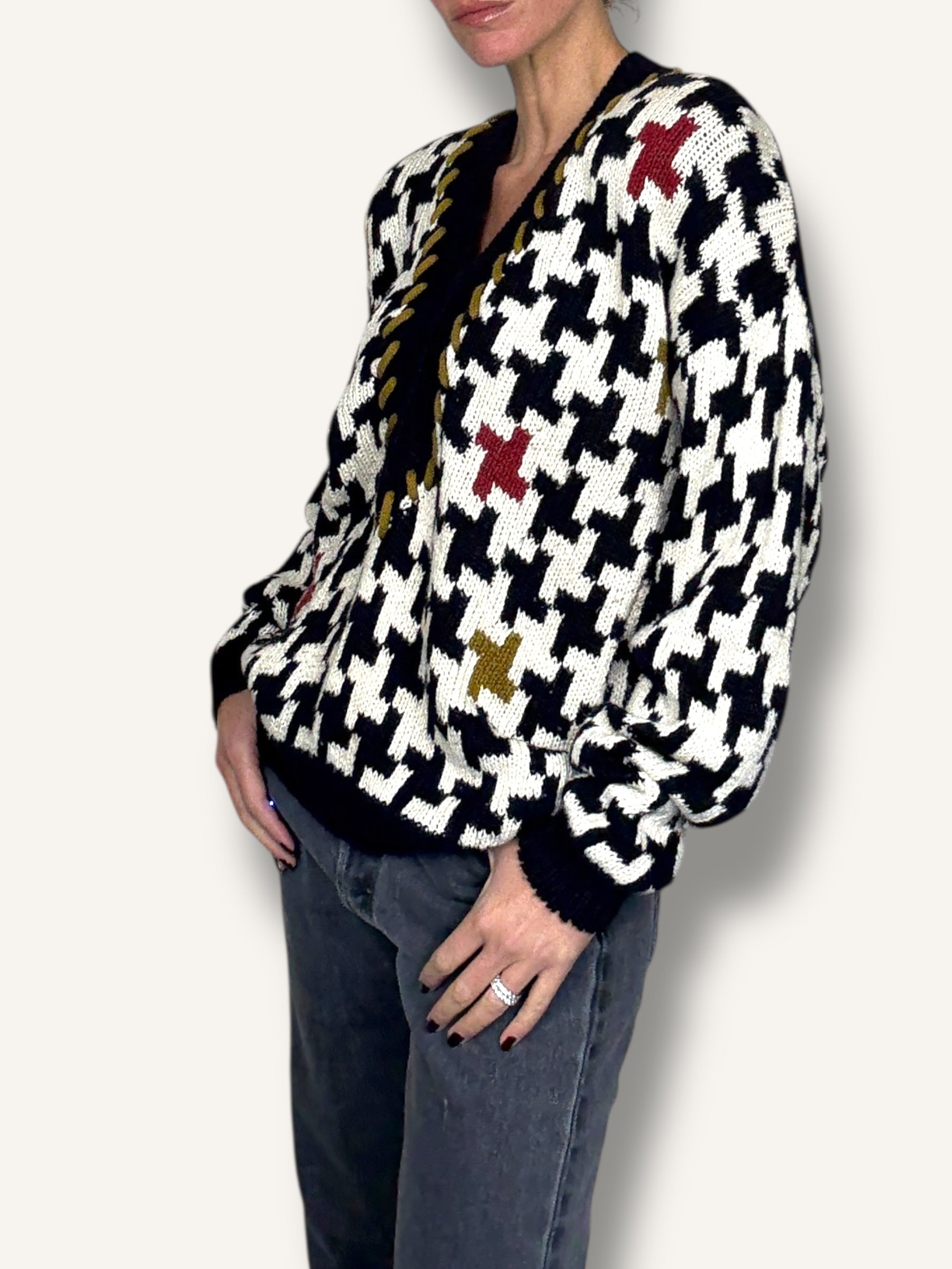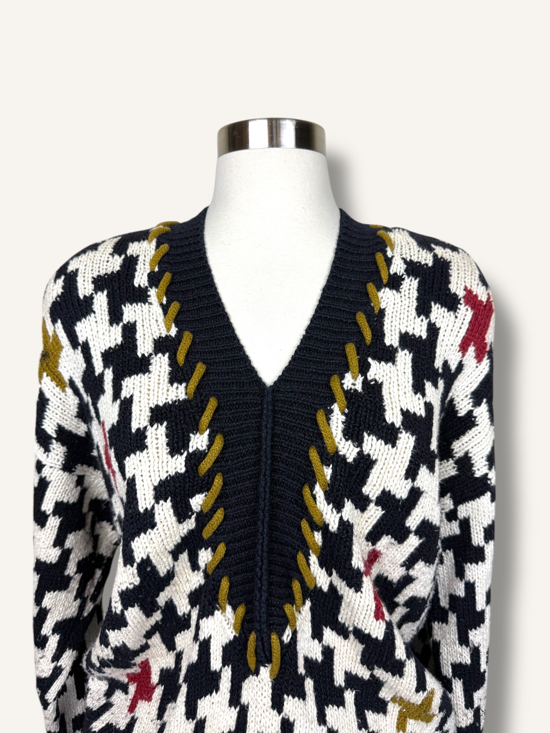 A standout vintage knit with graphic charm, this sweater blends bold houndstooth patterning with unique hand-stitched detailing along the deep V-neckline. Accented with touches of mustard and red for a subtle pop of color, it brings personality to a timeless silhouette. Cozy, relaxed, and effortlessly chic, it’s the perfect statement knit to elevate your everyday denim or layer over tailored pieces for a more polished look.
