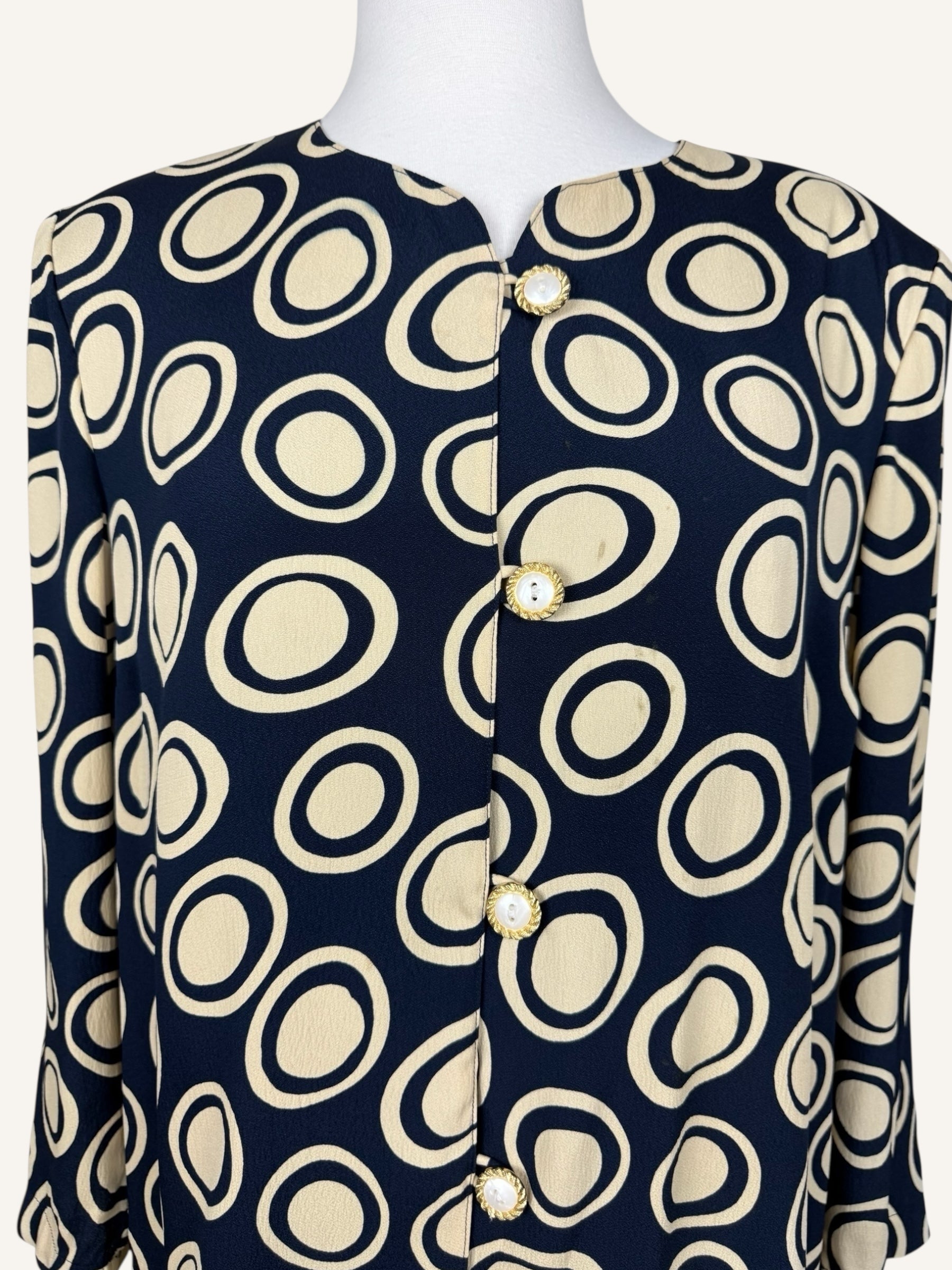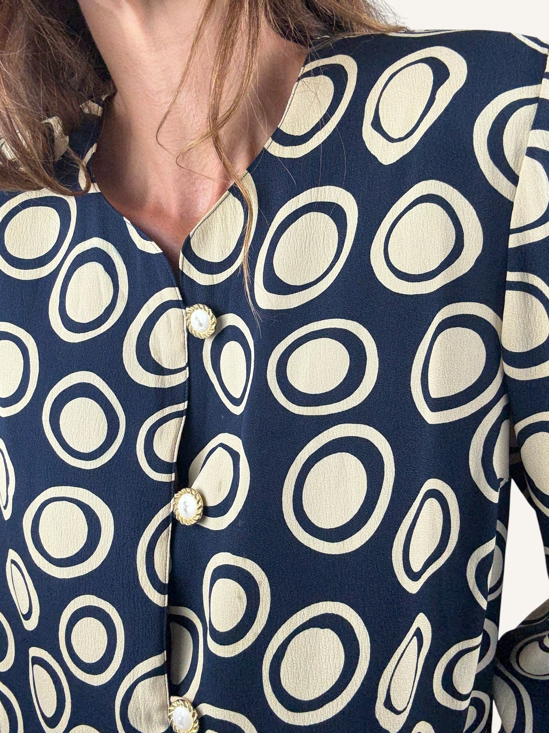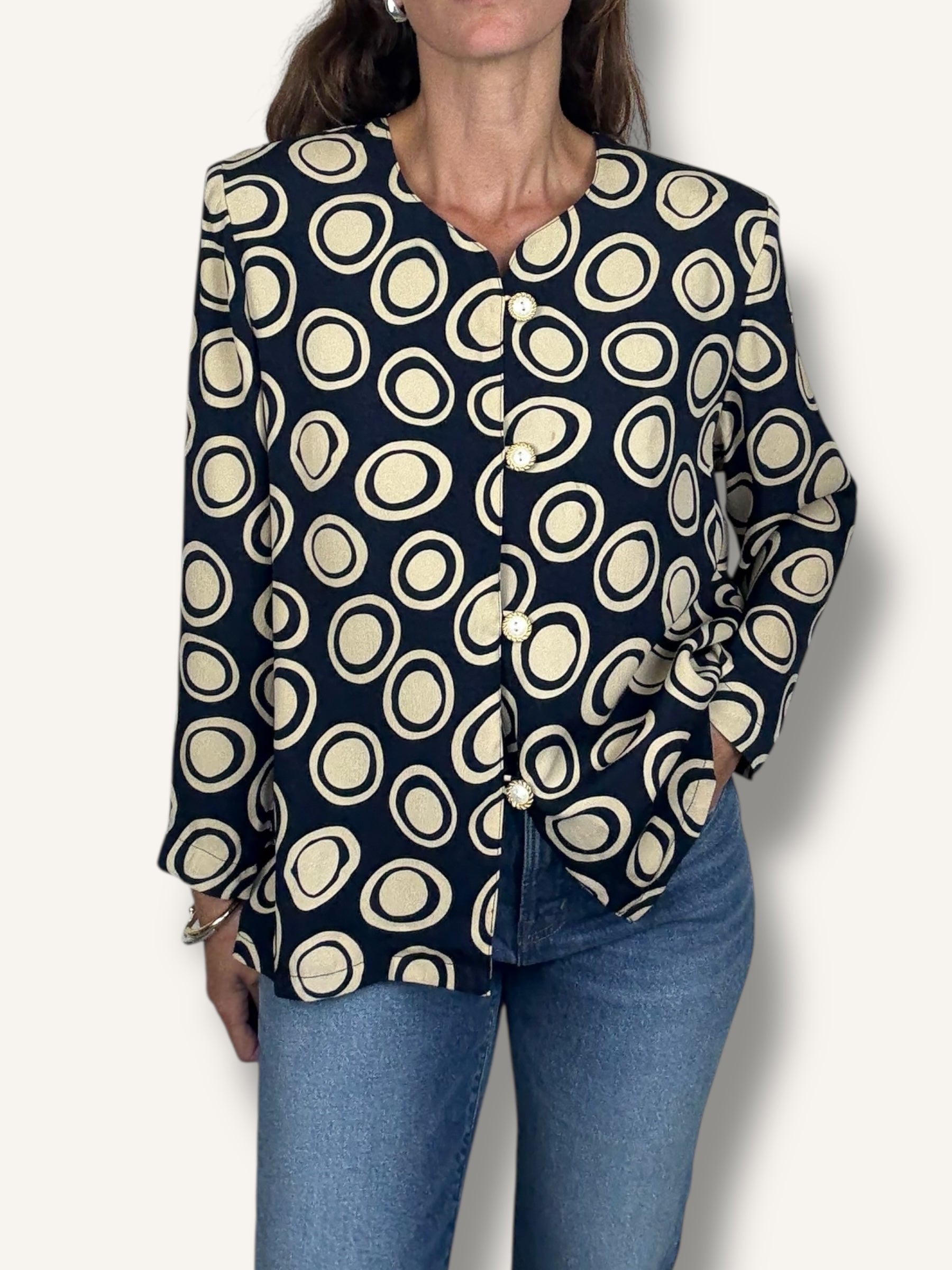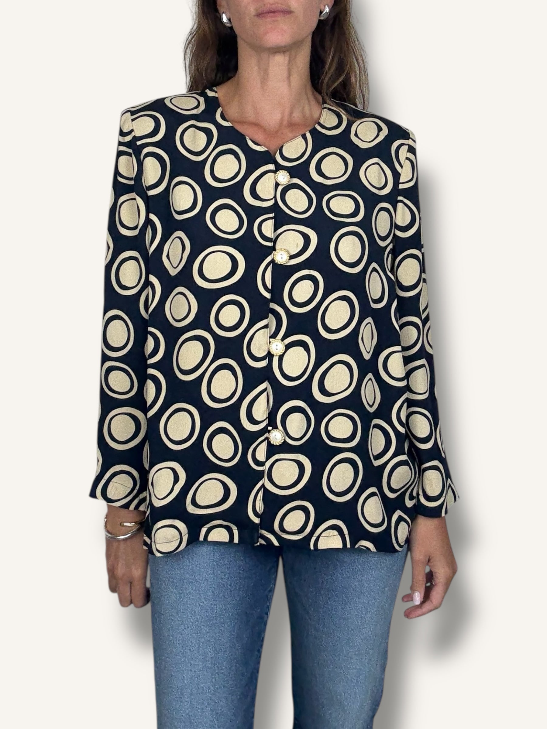 Cut from a fluid silk blend, this vintage 90's structured button-up shirt features an allover cream and black circle print. Light shoulder pads add definition, balanced by a collarless neckline and a clean, tailored silhouette. Fastens with four gold-tone buttons down the front.