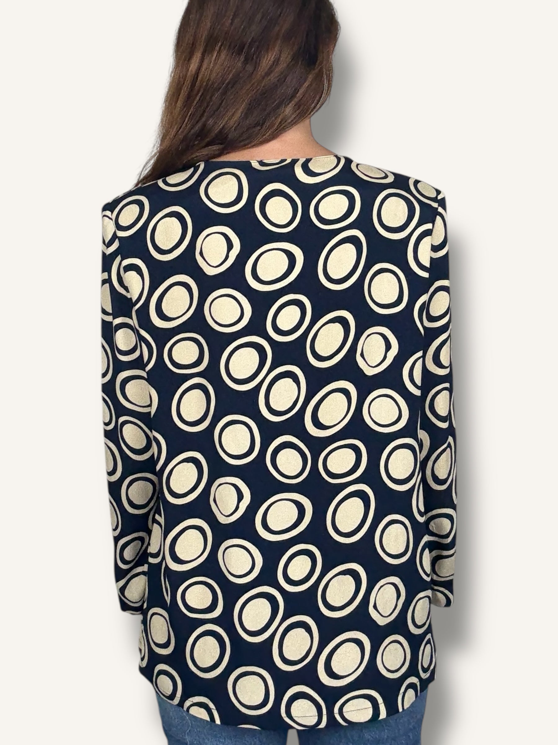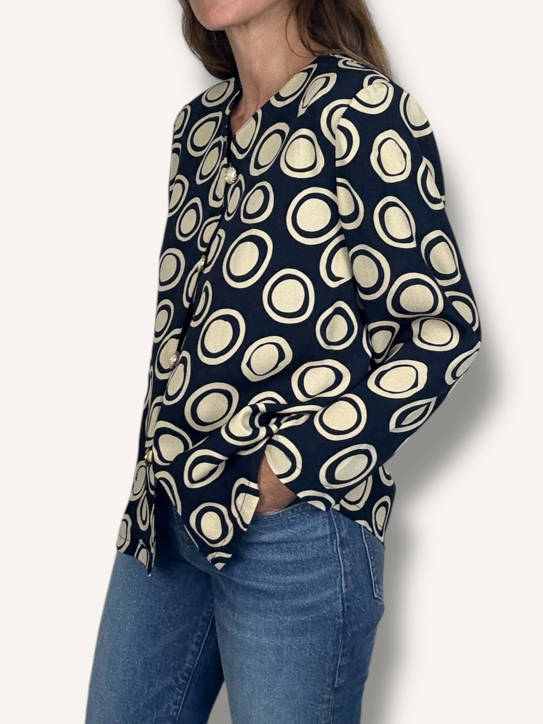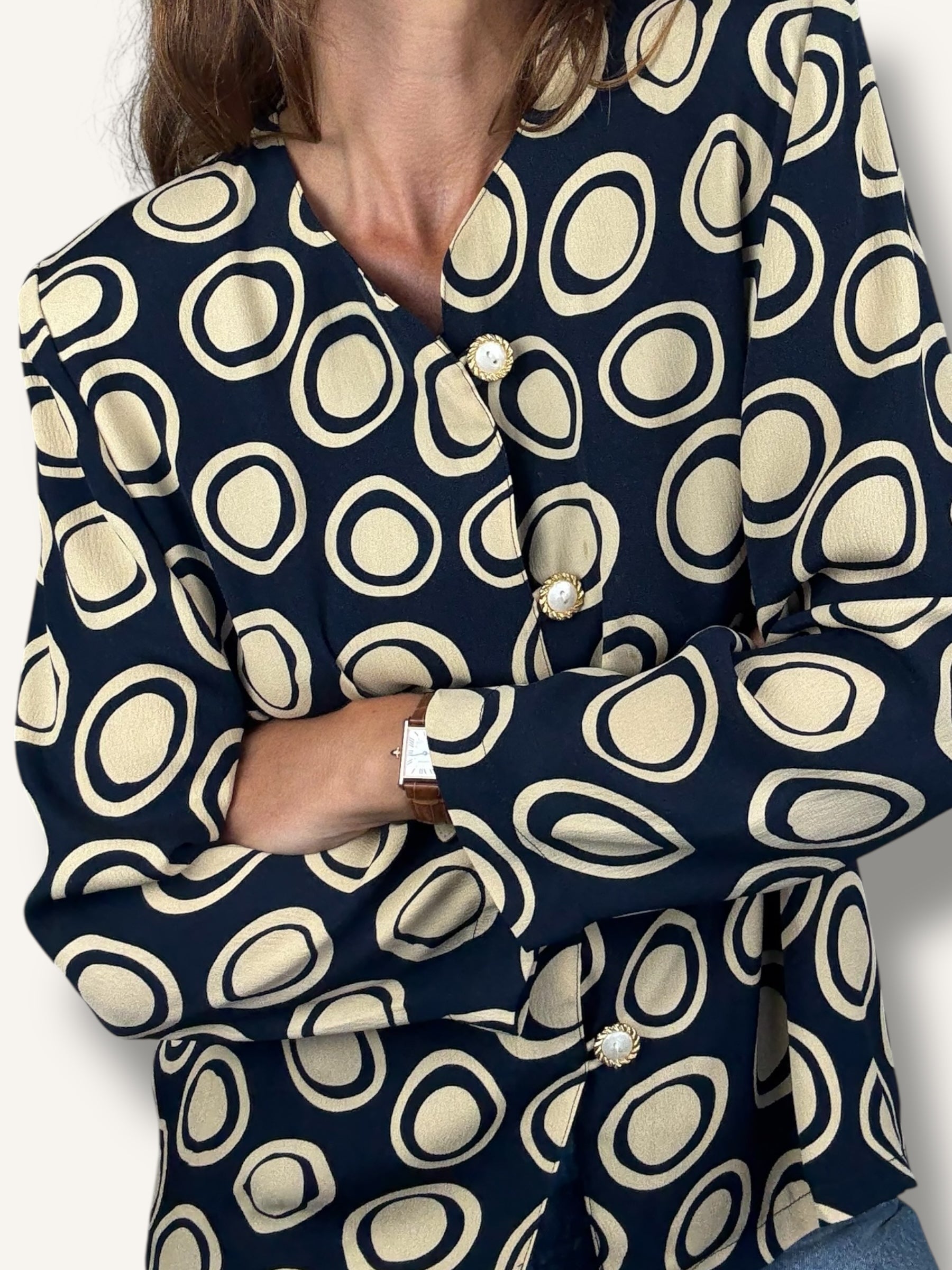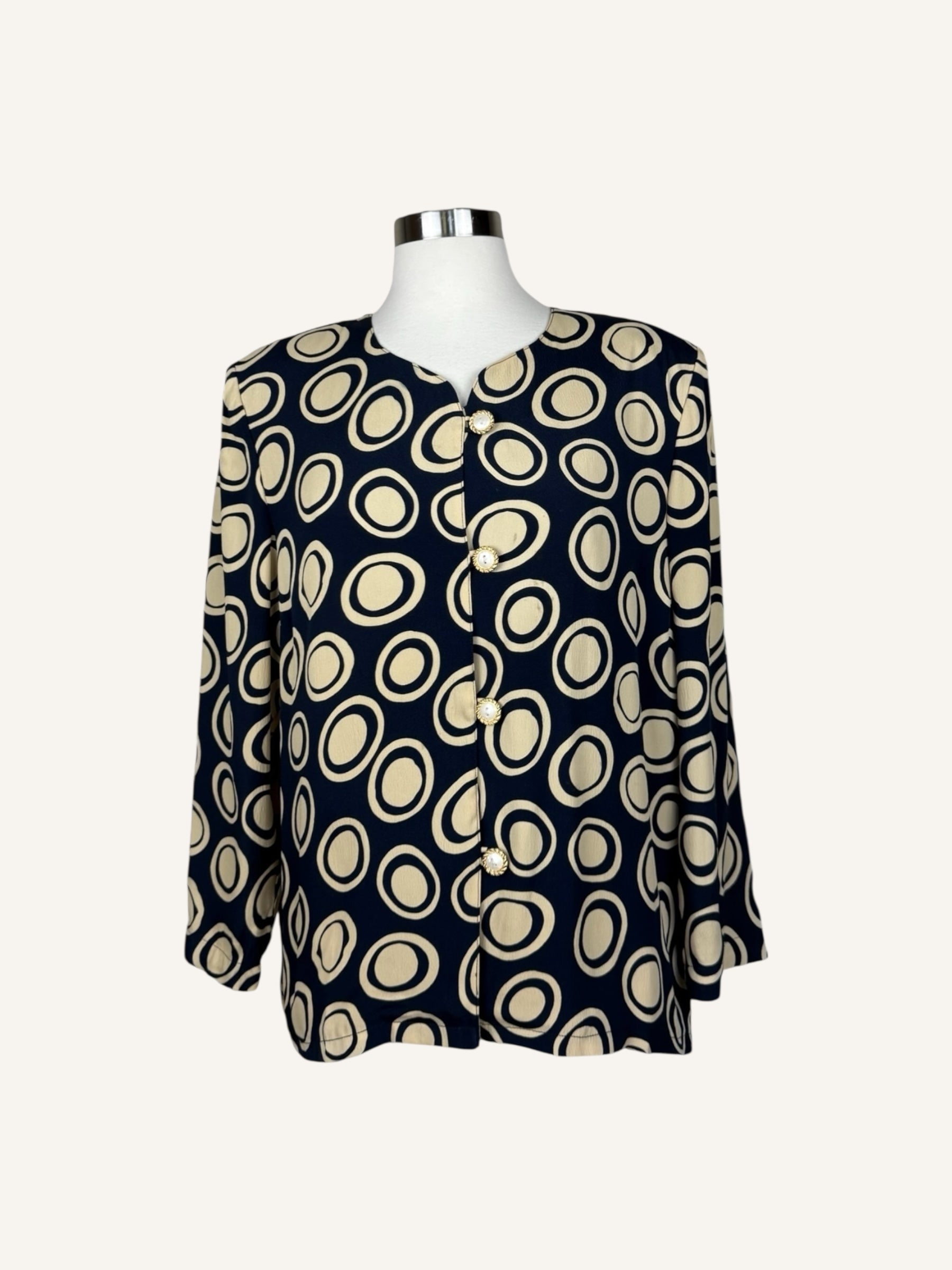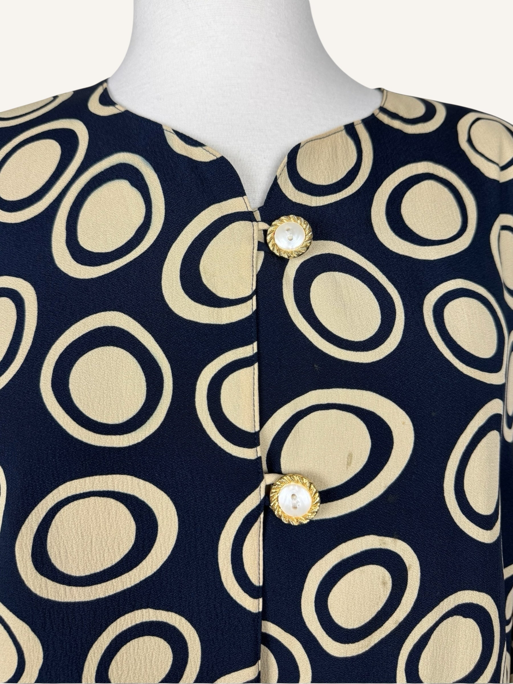 Cut from a fluid silk blend, this vintage 90's structured button-up shirt features an allover cream and black circle print. Light shoulder pads add definition, balanced by a collarless neckline and a clean, tailored silhouette. Fastens with four gold-tone buttons down the front.