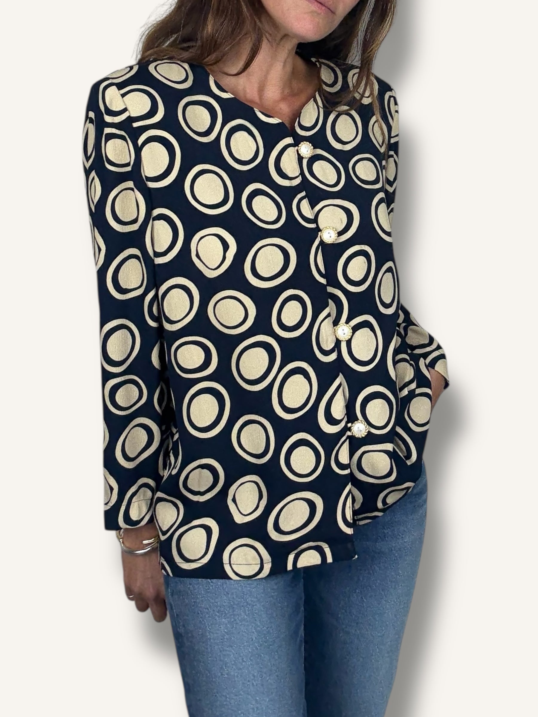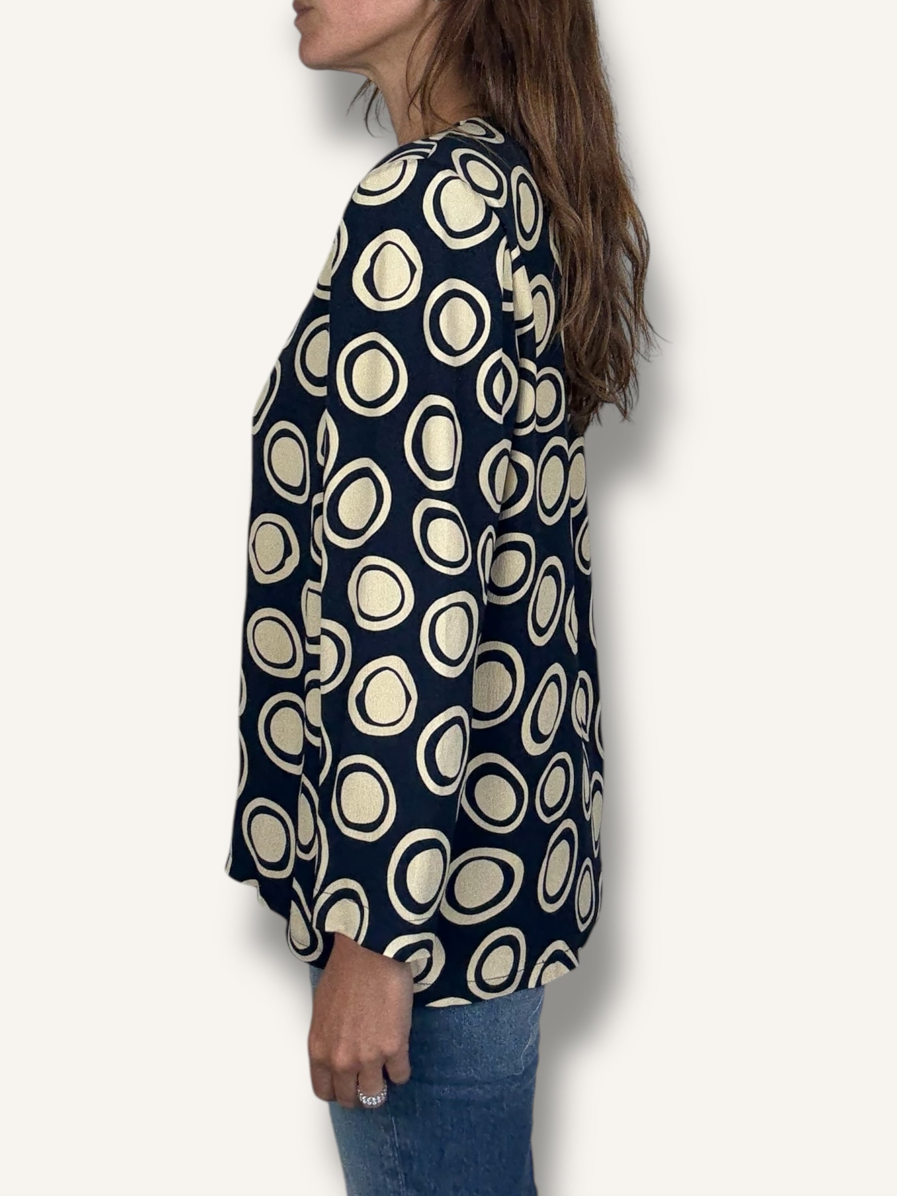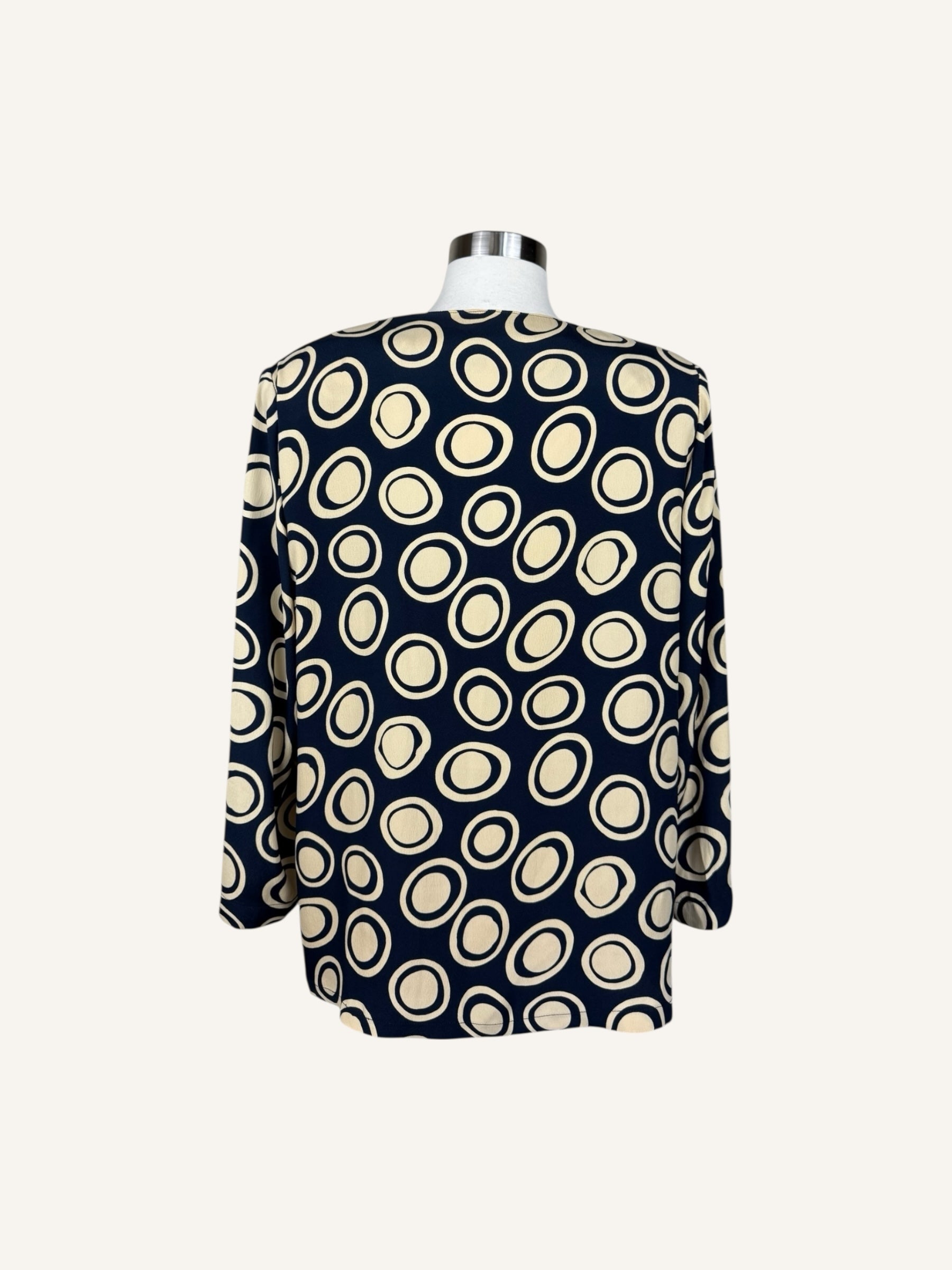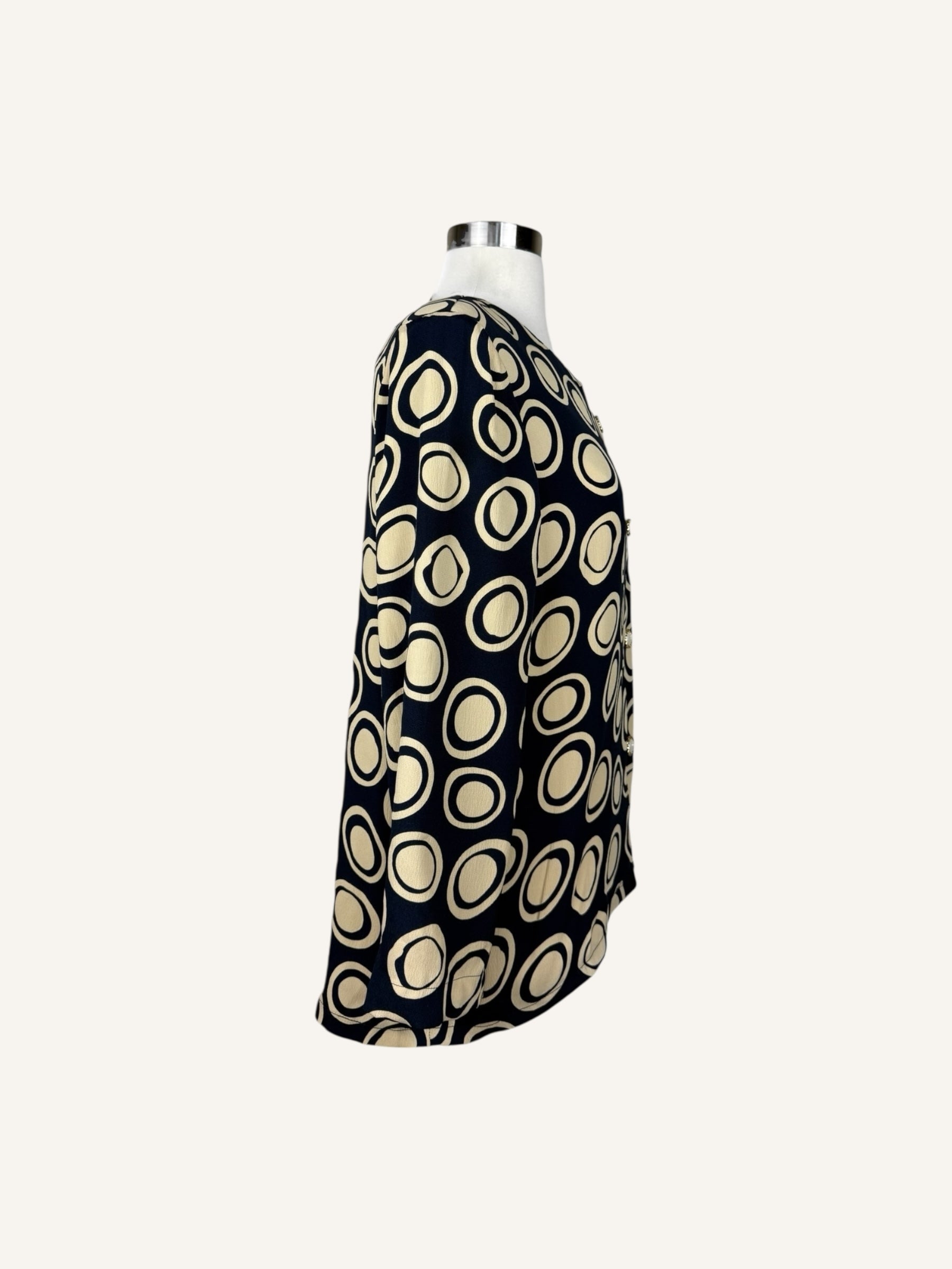 Cut from a fluid silk blend, this vintage 90's structured button-up shirt features an allover cream and black circle print. Light shoulder pads add definition, balanced by a collarless neckline and a clean, tailored silhouette. Fastens with four gold-tone buttons down the front.