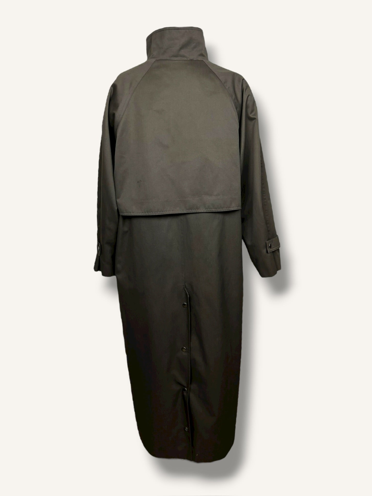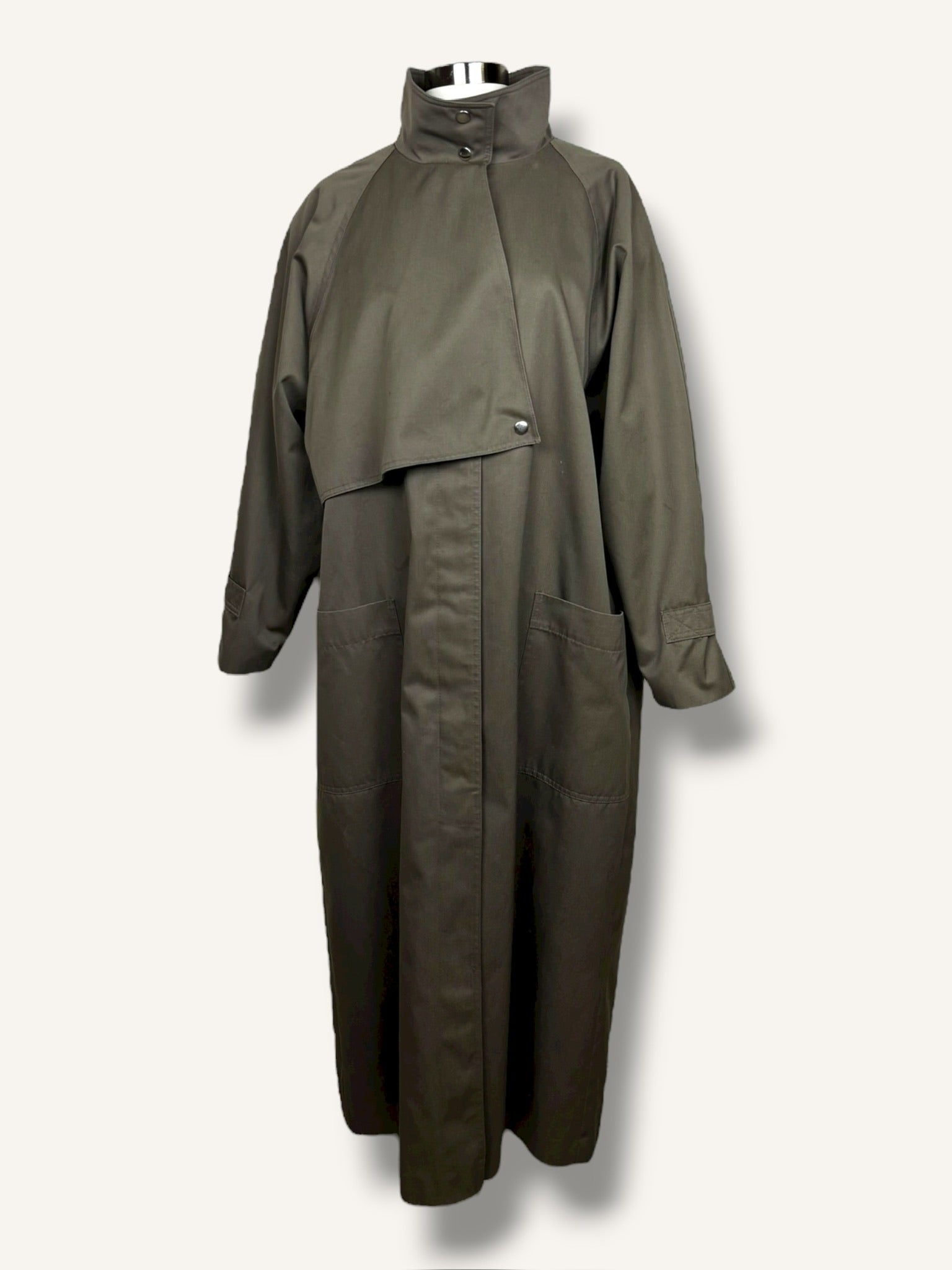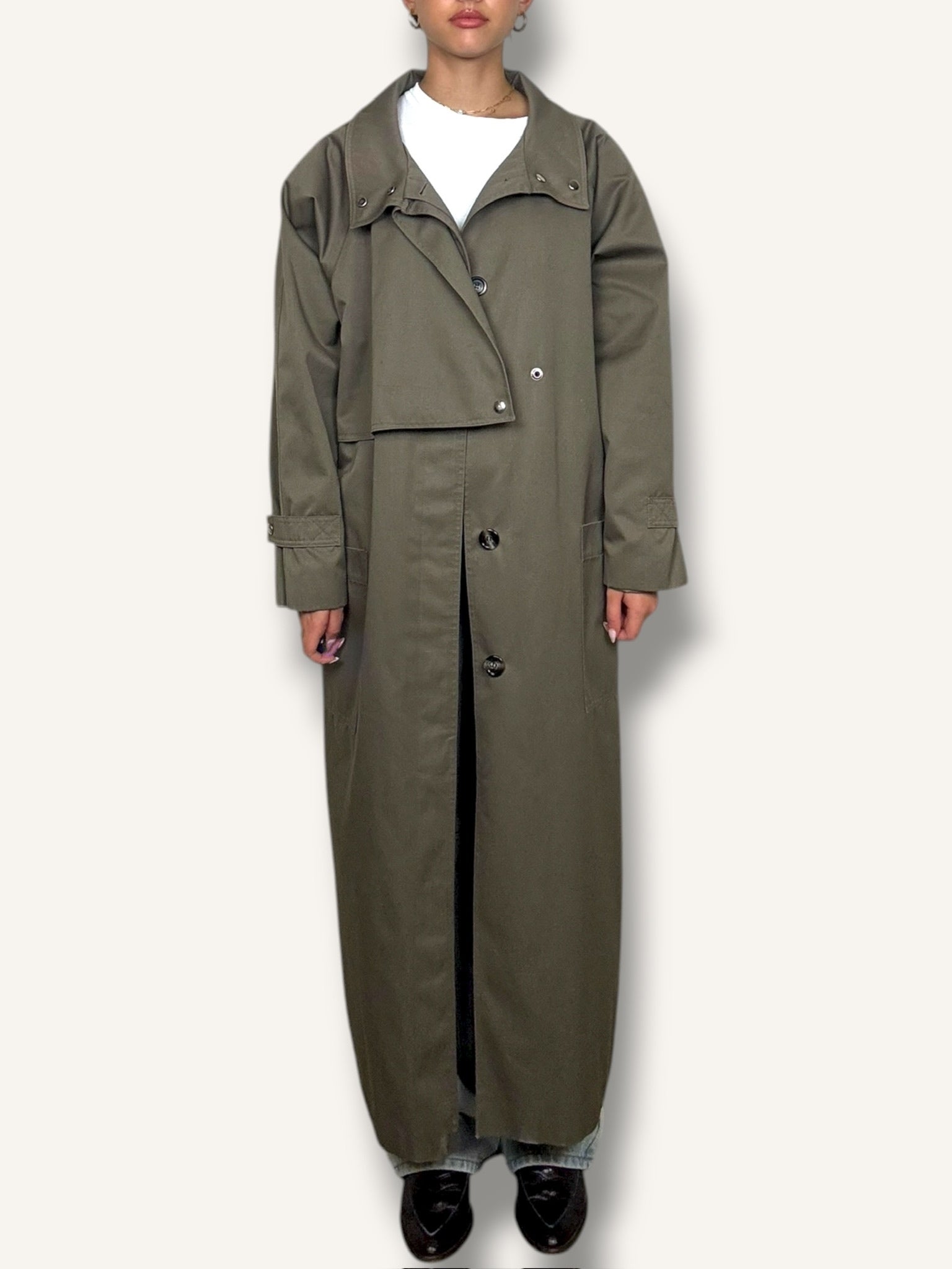 Vintage Gunmetal Green Trench Coat. This vintage trench coat in gunmetal green features a structured, oversized silhouette with utilitarian detailing. Designed with a high stand collar, storm flap front and back, and snap-button closures, it captures a refined yet functional aesthetic. Deep front pockets and adjustable cuffs add practicality, while the long length creates an effortlessly dramatic shape. Crafted from a durable cotton-blend fabric, this timeless piece brings an understated edge to any look—perfect layered over denim or tailoring for a minimalist, city-ready finish.