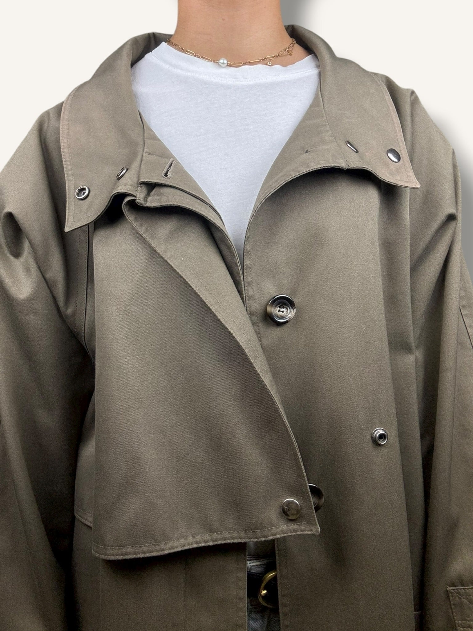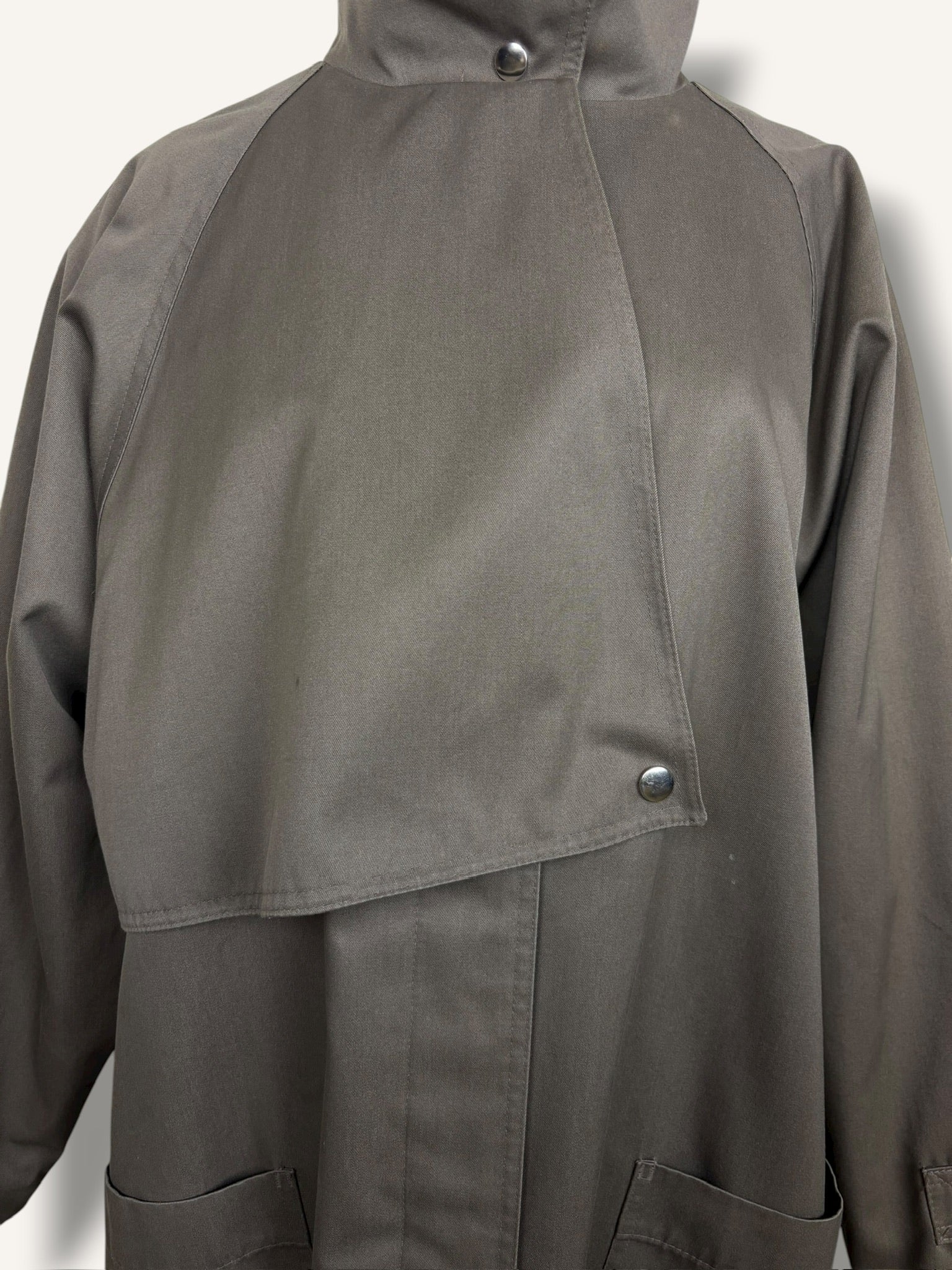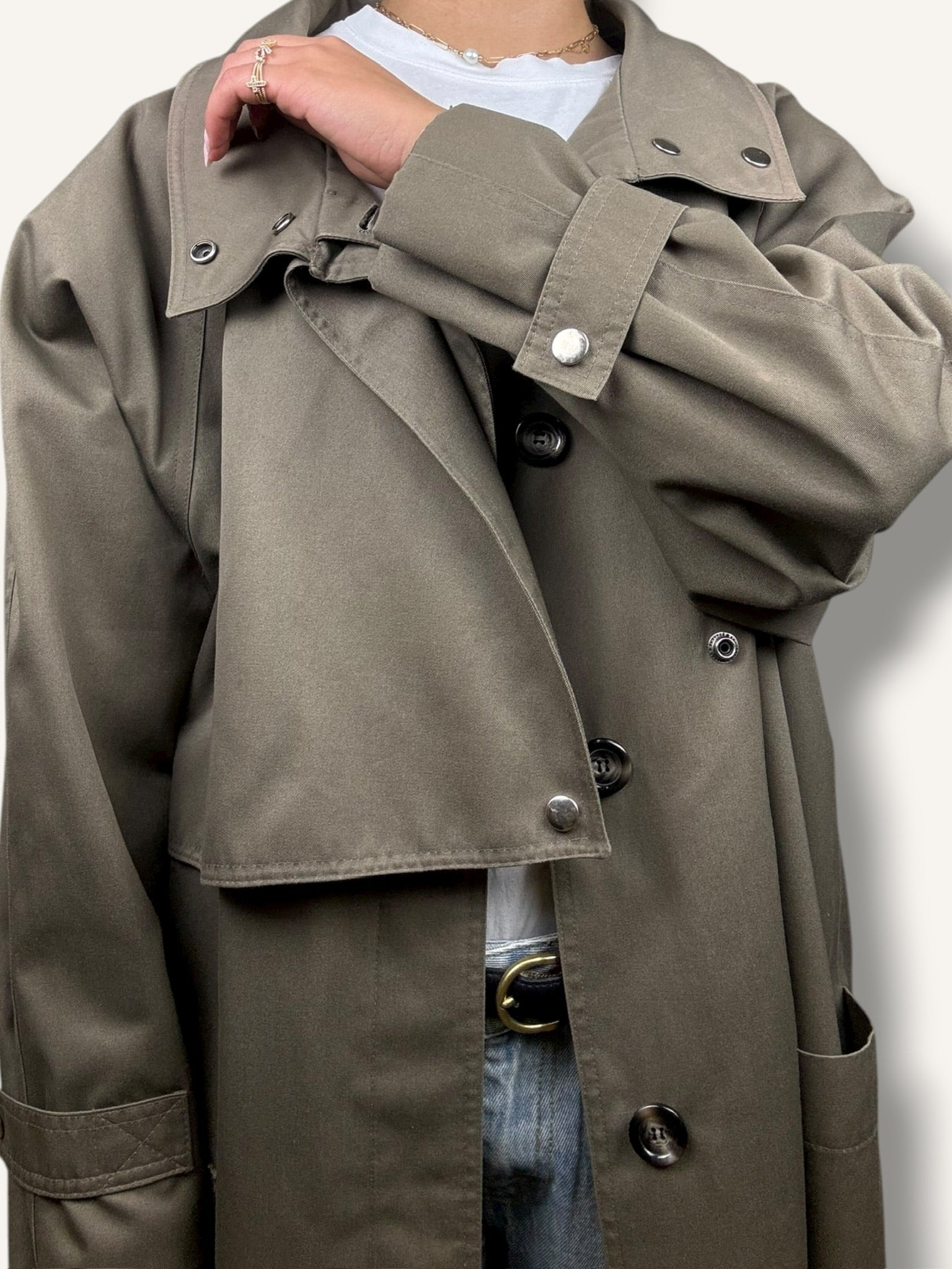 Vintage Gunmetal Green Trench Coat. This vintage trench coat in gunmetal green features a structured, oversized silhouette with utilitarian detailing. Designed with a high stand collar, storm flap front and back, and snap-button closures, it captures a refined yet functional aesthetic. Deep front pockets and adjustable cuffs add practicality, while the long length creates an effortlessly dramatic shape. Crafted from a durable cotton-blend fabric, this timeless piece brings an understated edge to any look—perfect layered over denim or tailoring for a minimalist, city-ready finish.