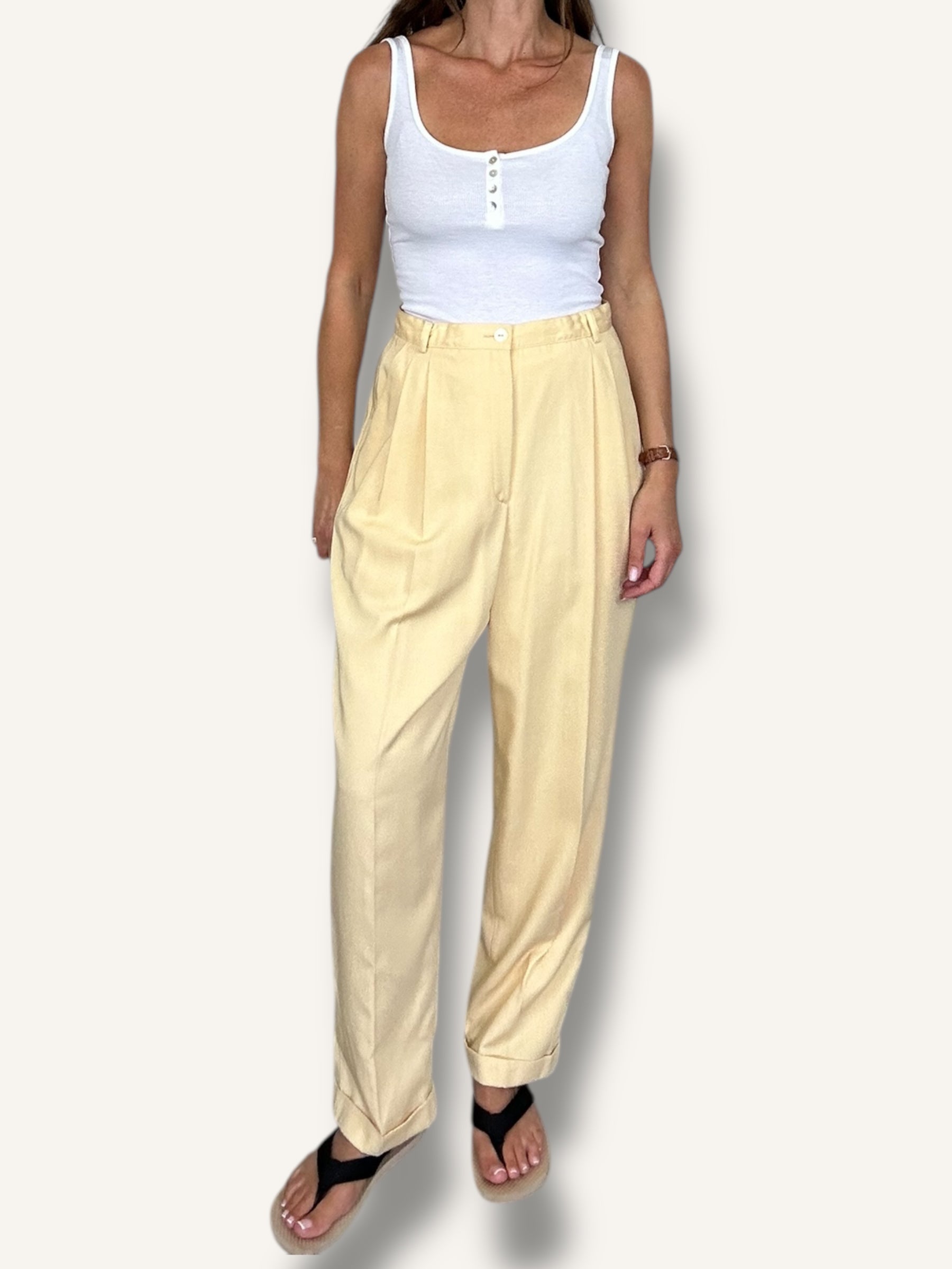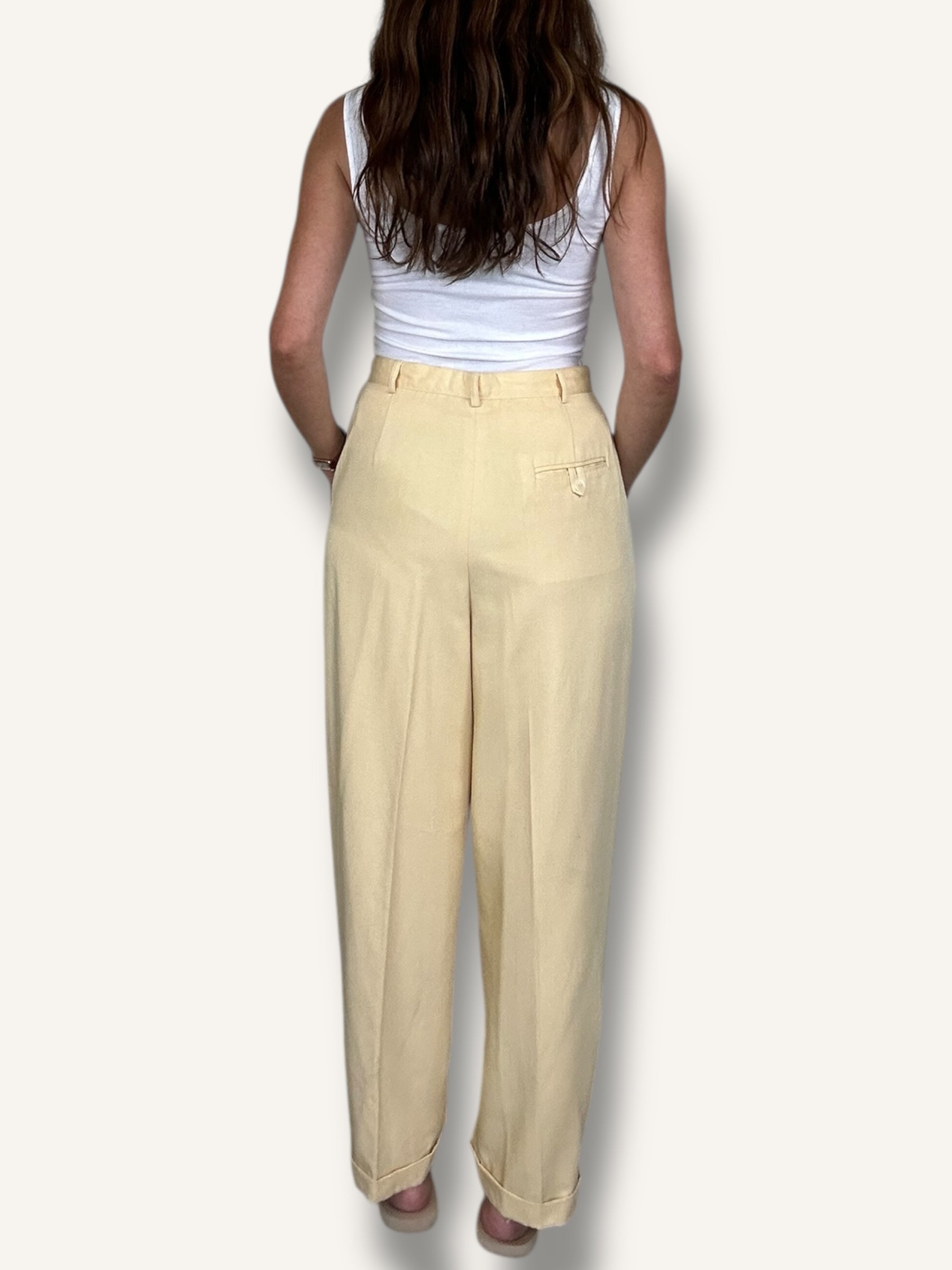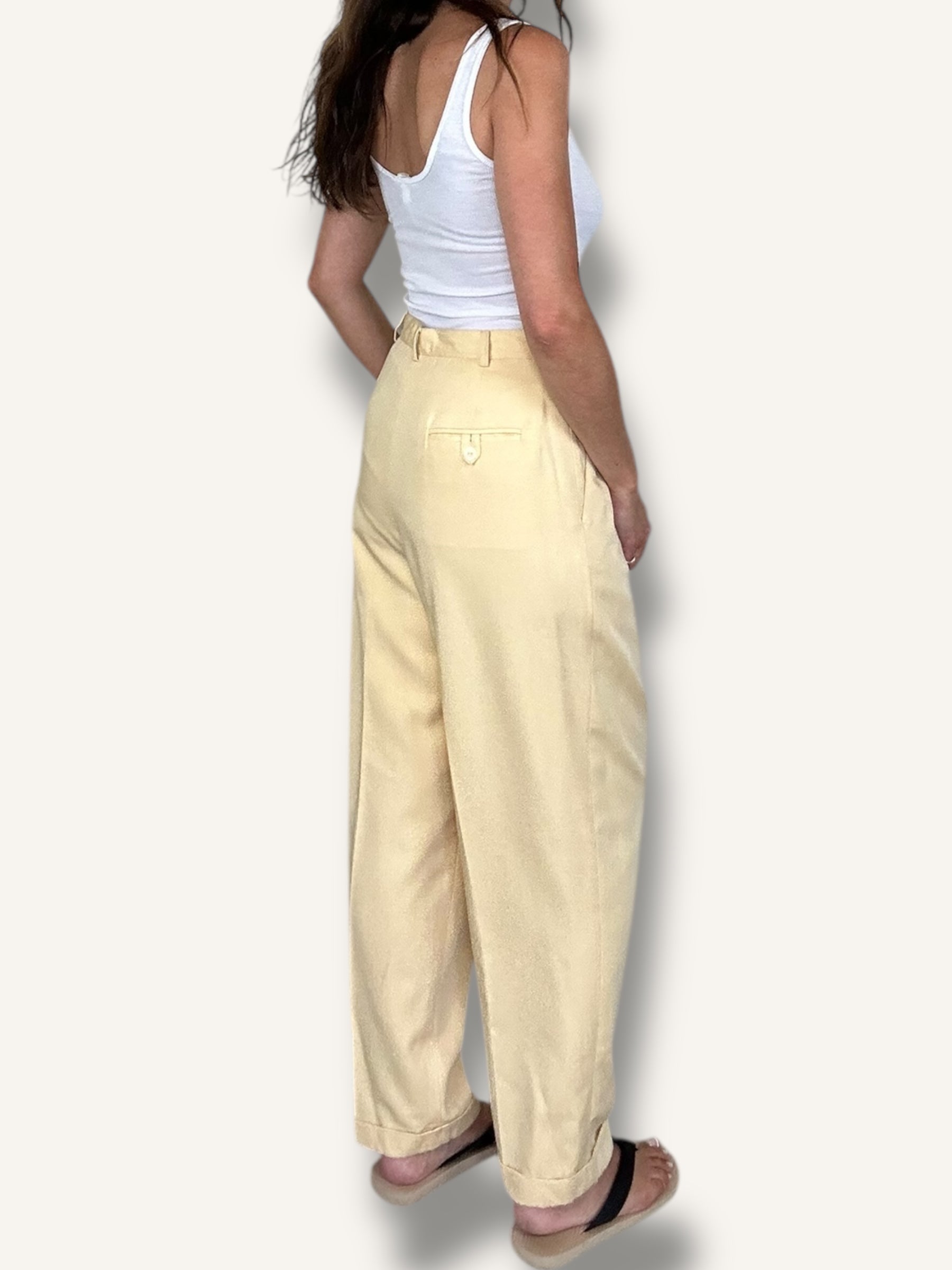 These vintage Liz Claiborne high-waisted trousers in a soft, buttery yellow bring classic tailoring to modern ease. Featuring a gently tapered leg with cuffed hems, subtle pleating at the front, and a structured waistband with belt loops, they offer a flattering drape and just the right amount of volume. Crafted from a smooth, lightweight fabric with a hint of sheen, they’re finished with side pockets, a button-tab closure, and a single back pocket with a button flap. Whether styled with a tucked-in blouse or a cropped tank, they strike the perfect balance between relaxed and refined. Best fits sizes S–M depending on desired fit.