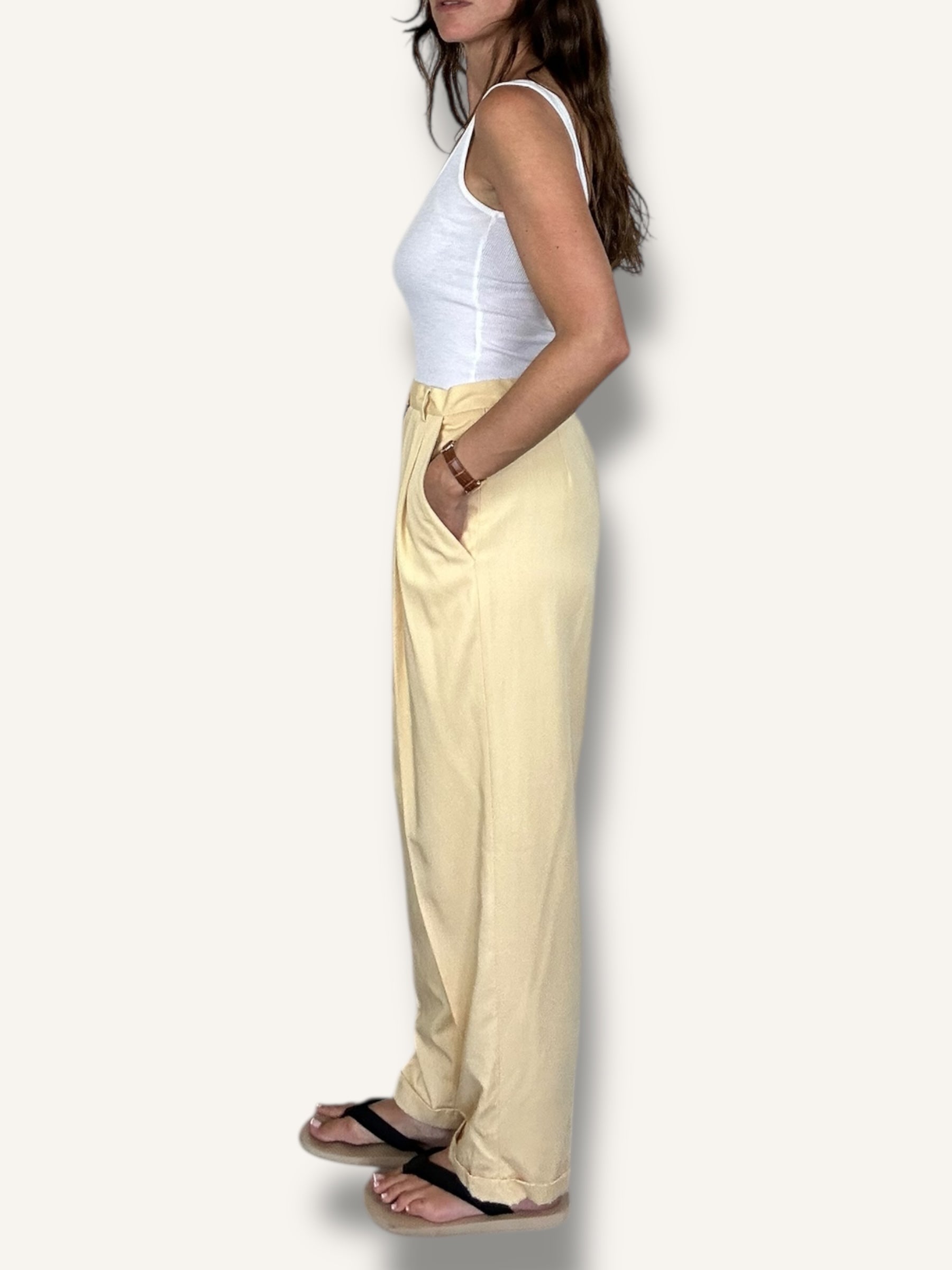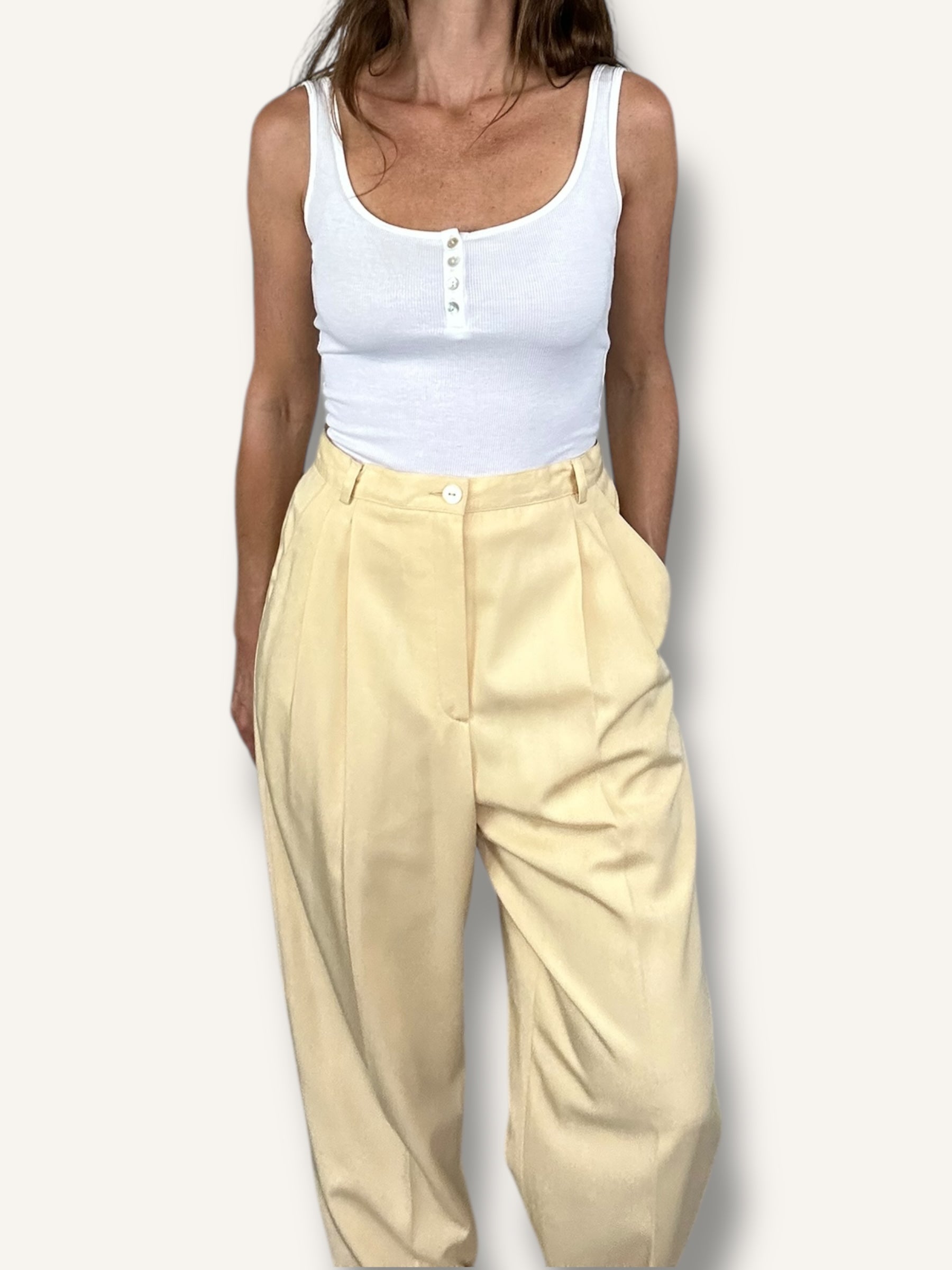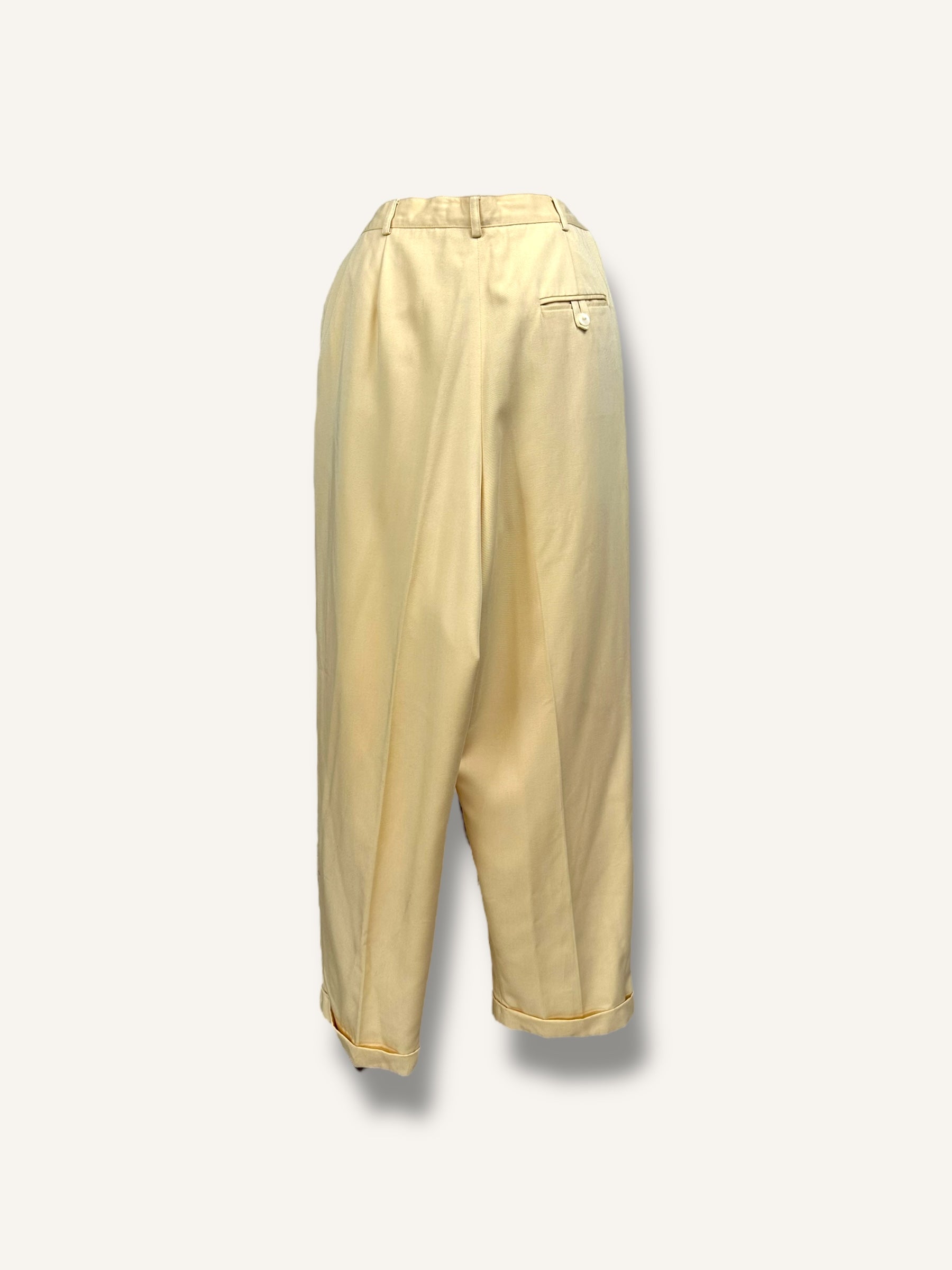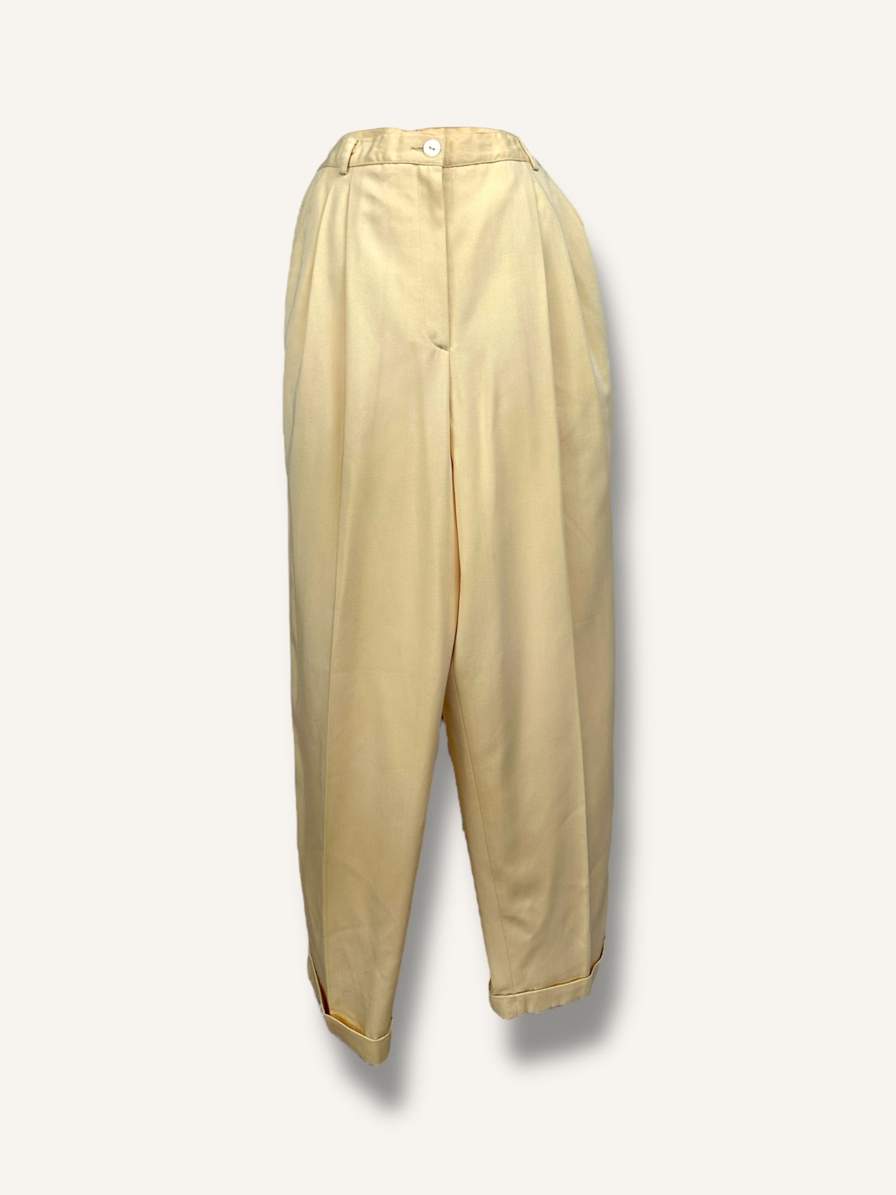 These vintage Liz Claiborne high-waisted trousers in a soft, buttery yellow bring classic tailoring to modern ease. Featuring a gently tapered leg with cuffed hems, subtle pleating at the front, and a structured waistband with belt loops, they offer a flattering drape and just the right amount of volume. Crafted from a smooth, lightweight fabric with a hint of sheen, they’re finished with side pockets, a button-tab closure, and a single back pocket with a button flap. Whether styled with a tucked-in blouse or a cropped tank, they strike the perfect balance between relaxed and refined. Best fits sizes S–M depending on desired fit.
