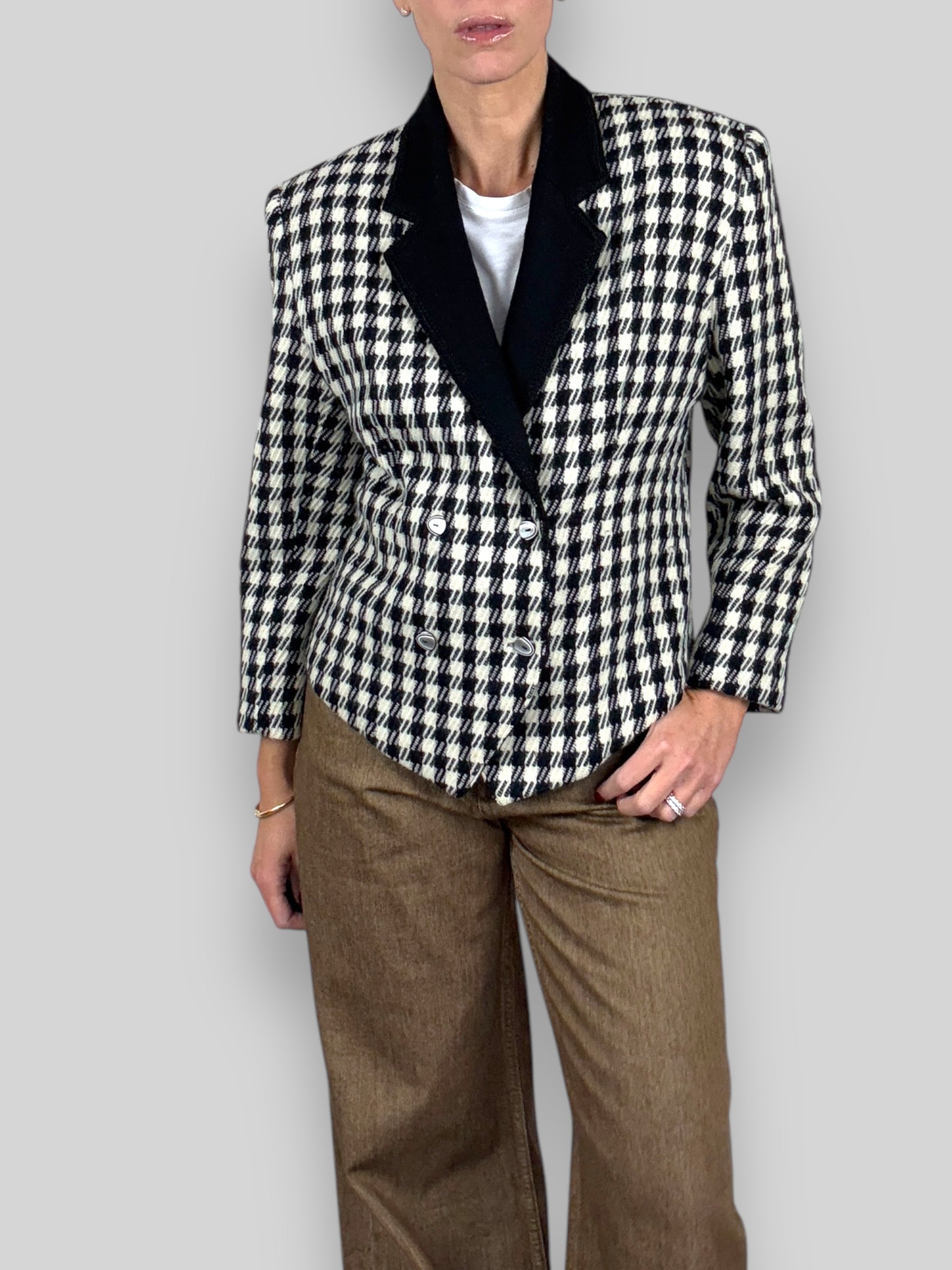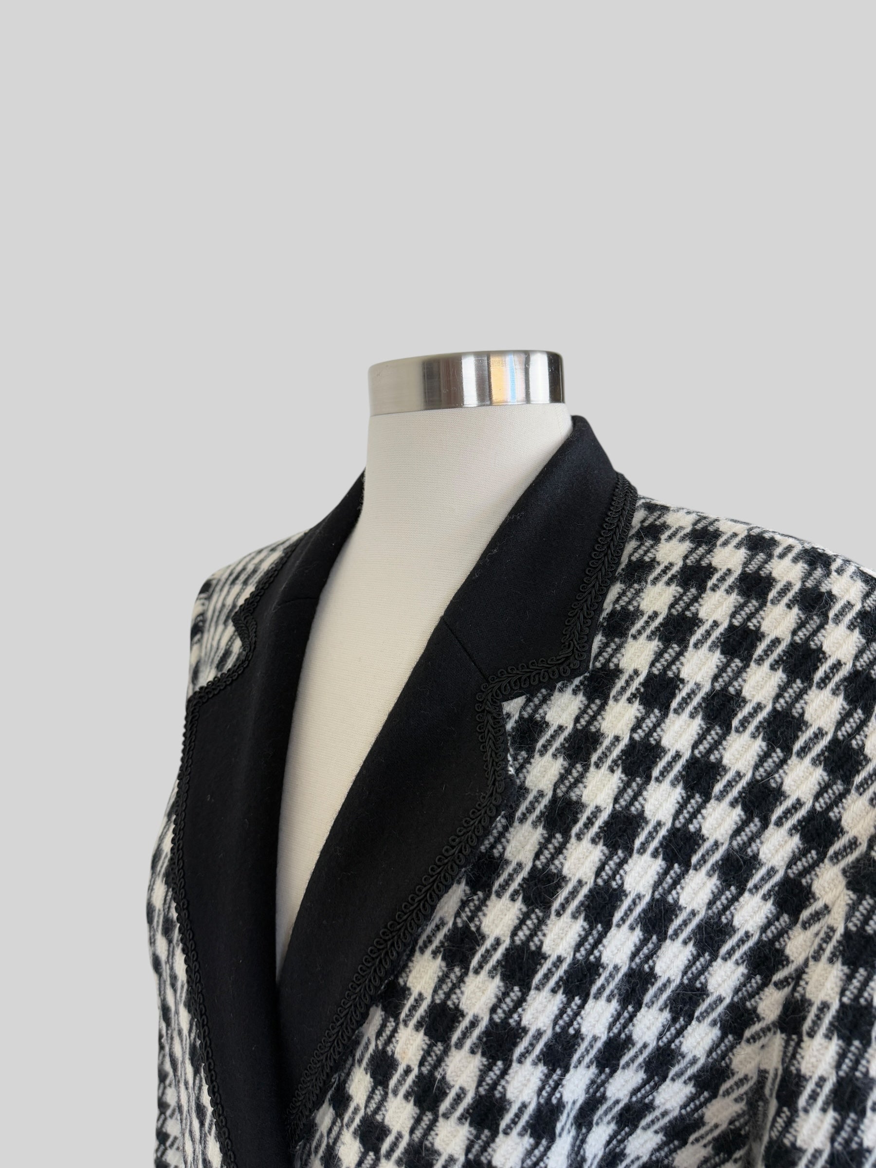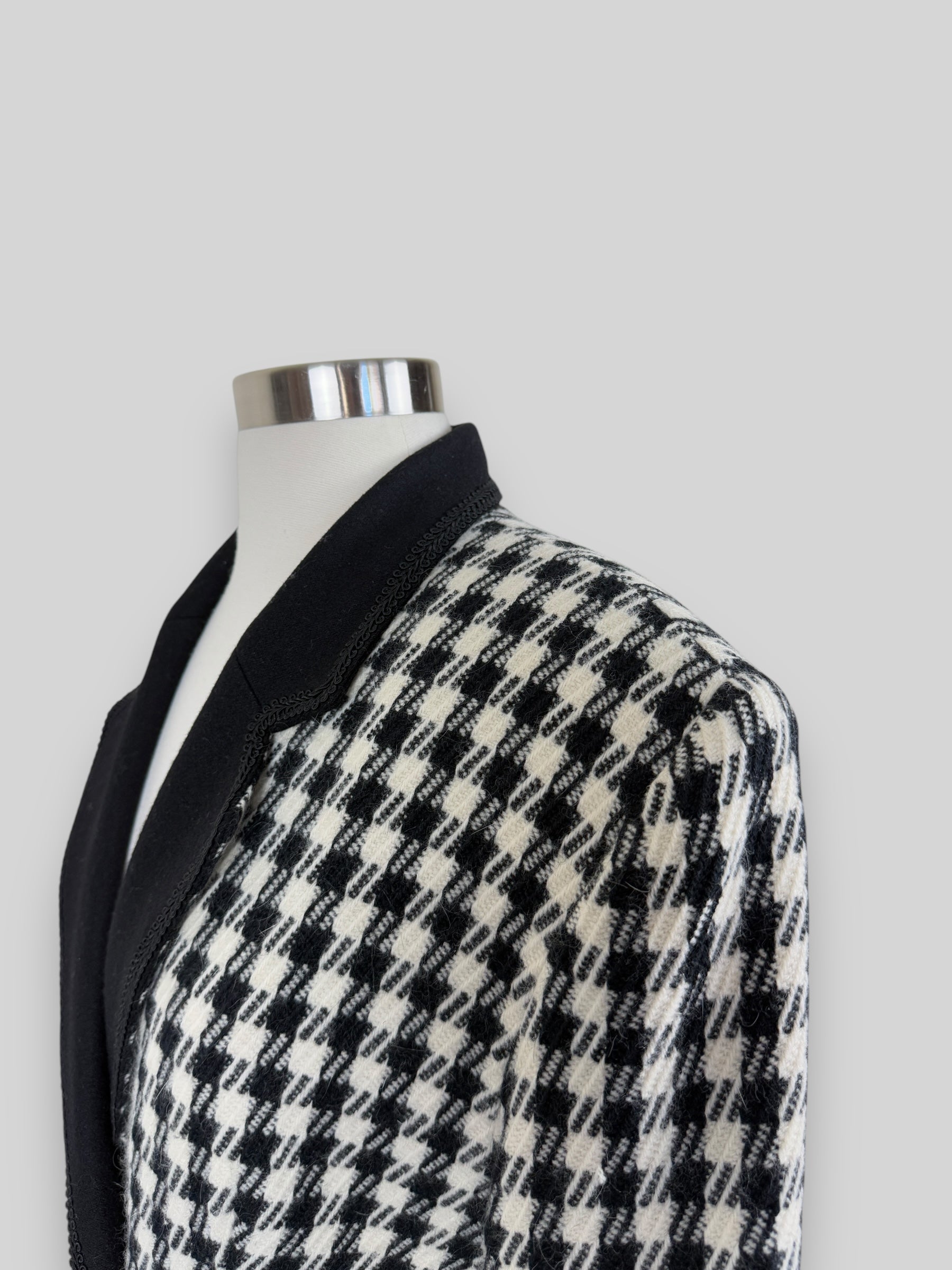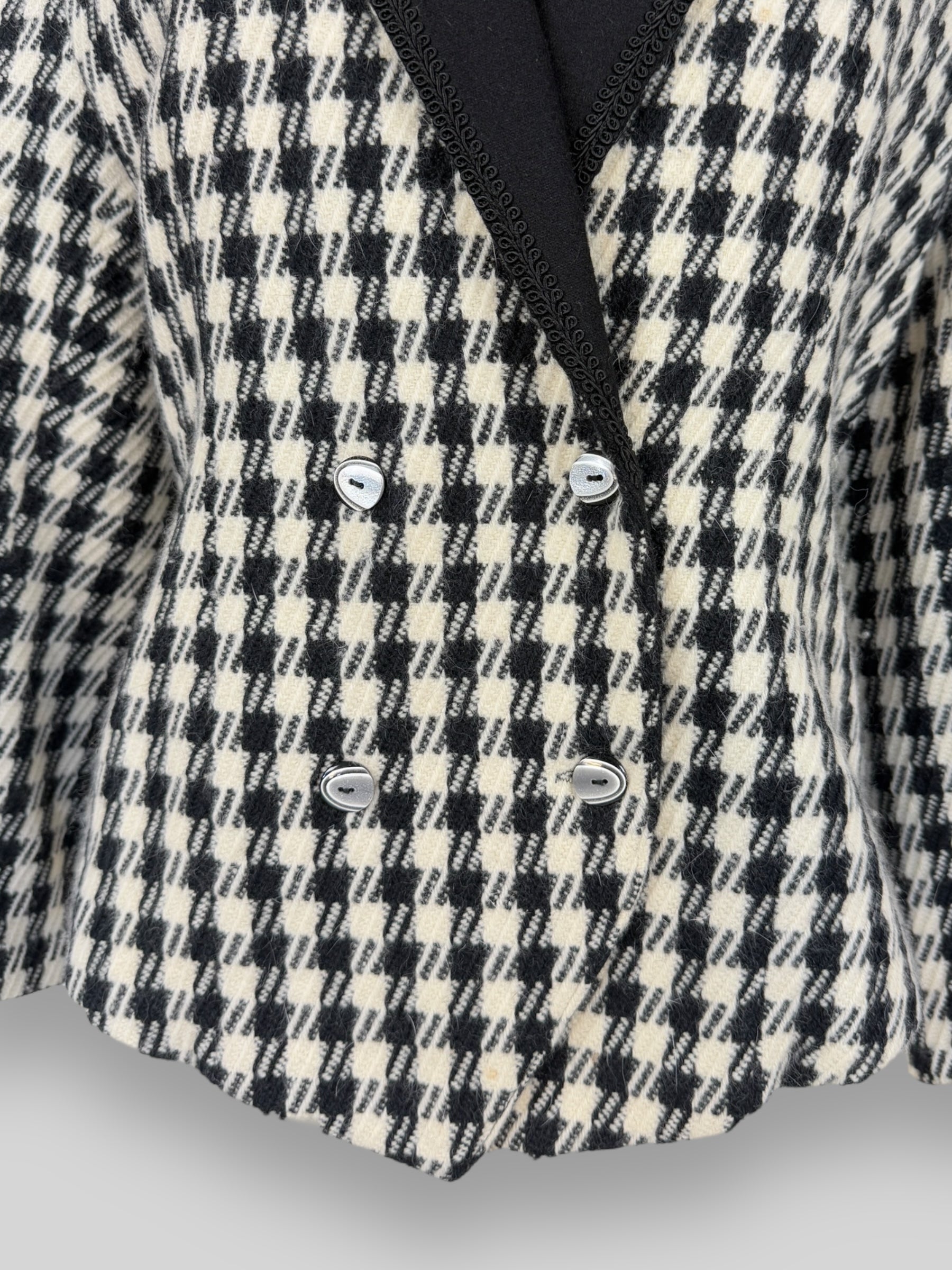 Vintage black and white houndstooth blazer with a structured silhouette, featuring a striking black lapel with intricate braided trim for added texture and elegance. The double-breasted front is adorned with silver-tone buttons, complementing the bold pattern. The slightly cropped length and padded shoulders enhance its tailored fit, making it a statement piece for refined, retro-inspired styling.