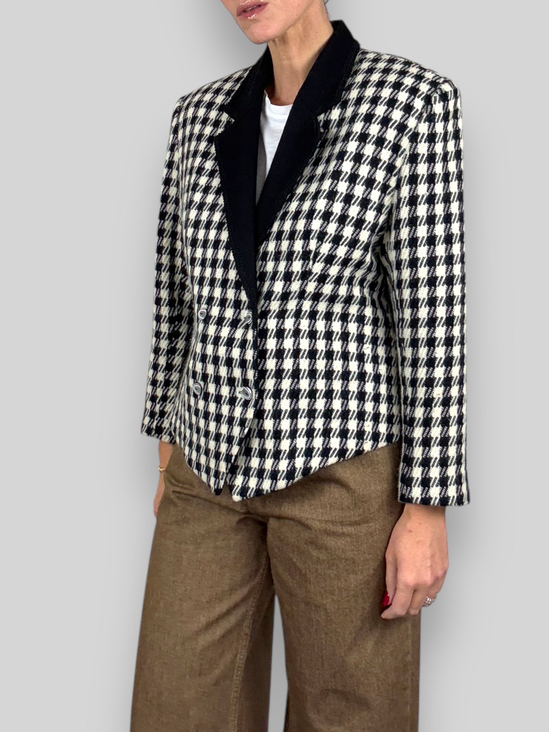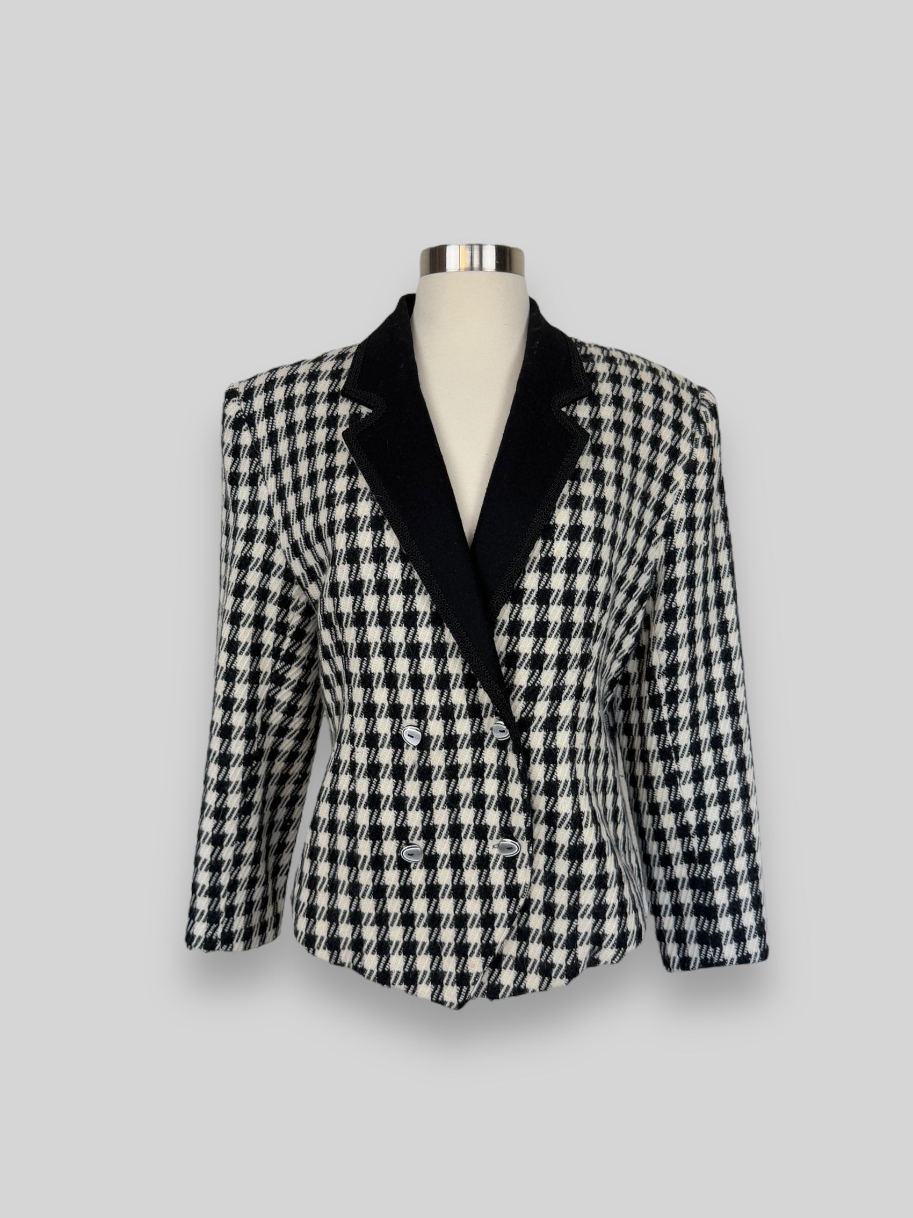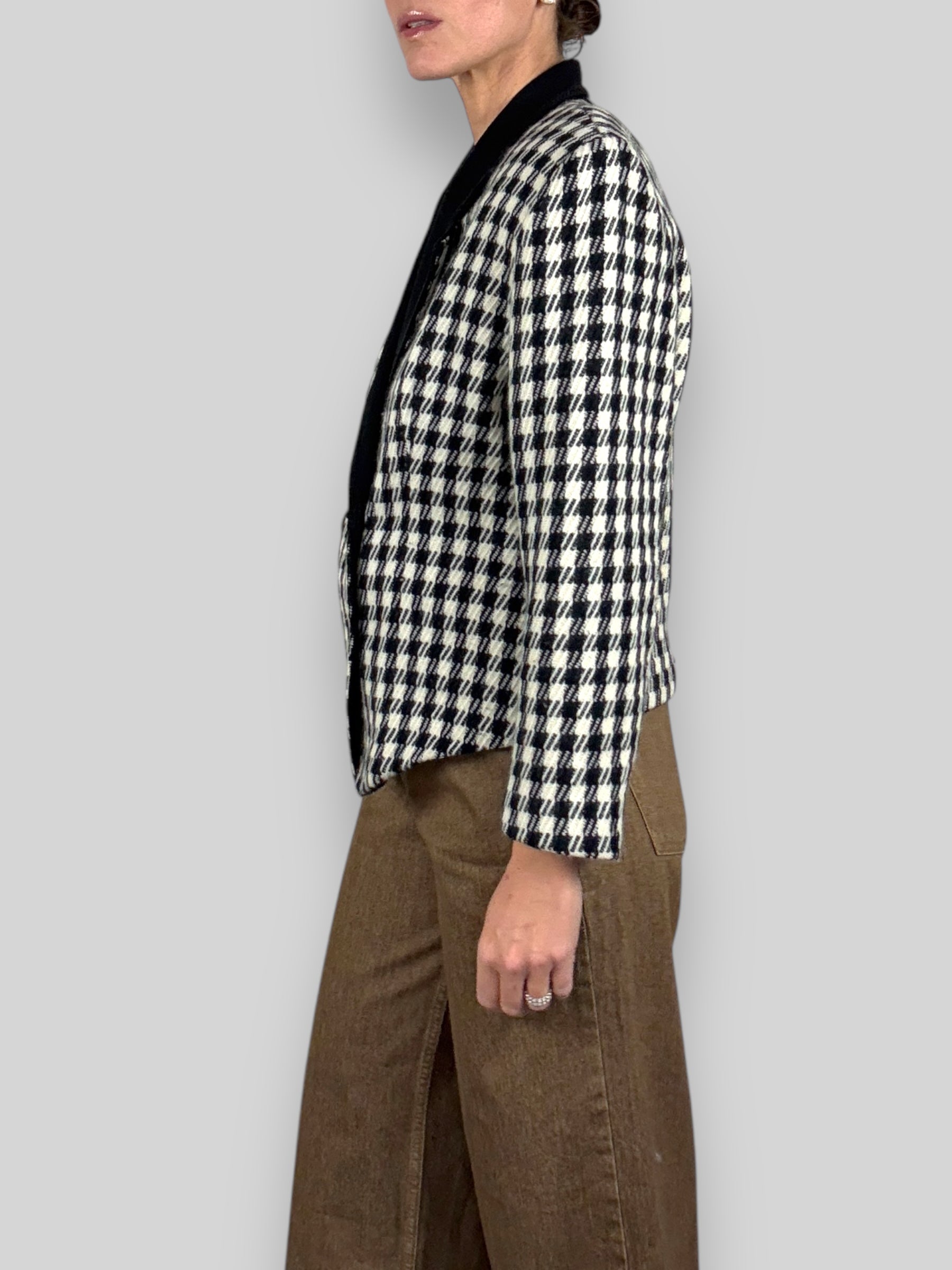 Vintage black and white houndstooth blazer with a structured silhouette, featuring a striking black lapel with intricate braided trim for added texture and elegance. The double-breasted front is adorned with silver-tone buttons, complementing the bold pattern. The slightly cropped length and padded shoulders enhance its tailored fit, making it a statement piece for refined, retro-inspired styling.