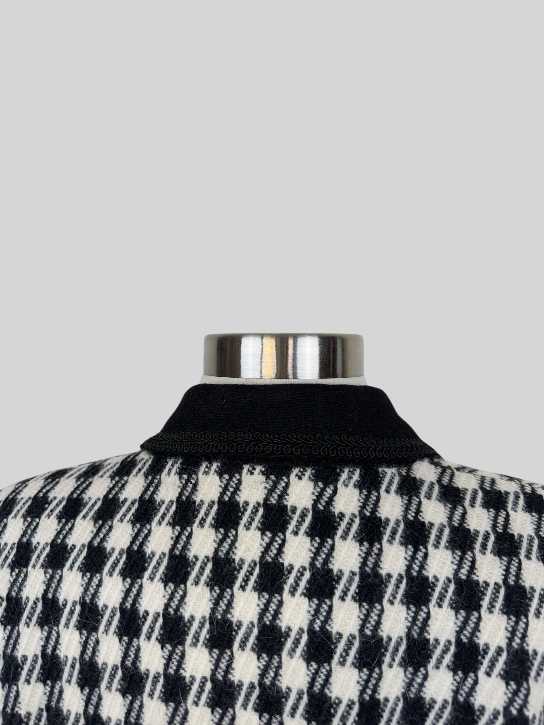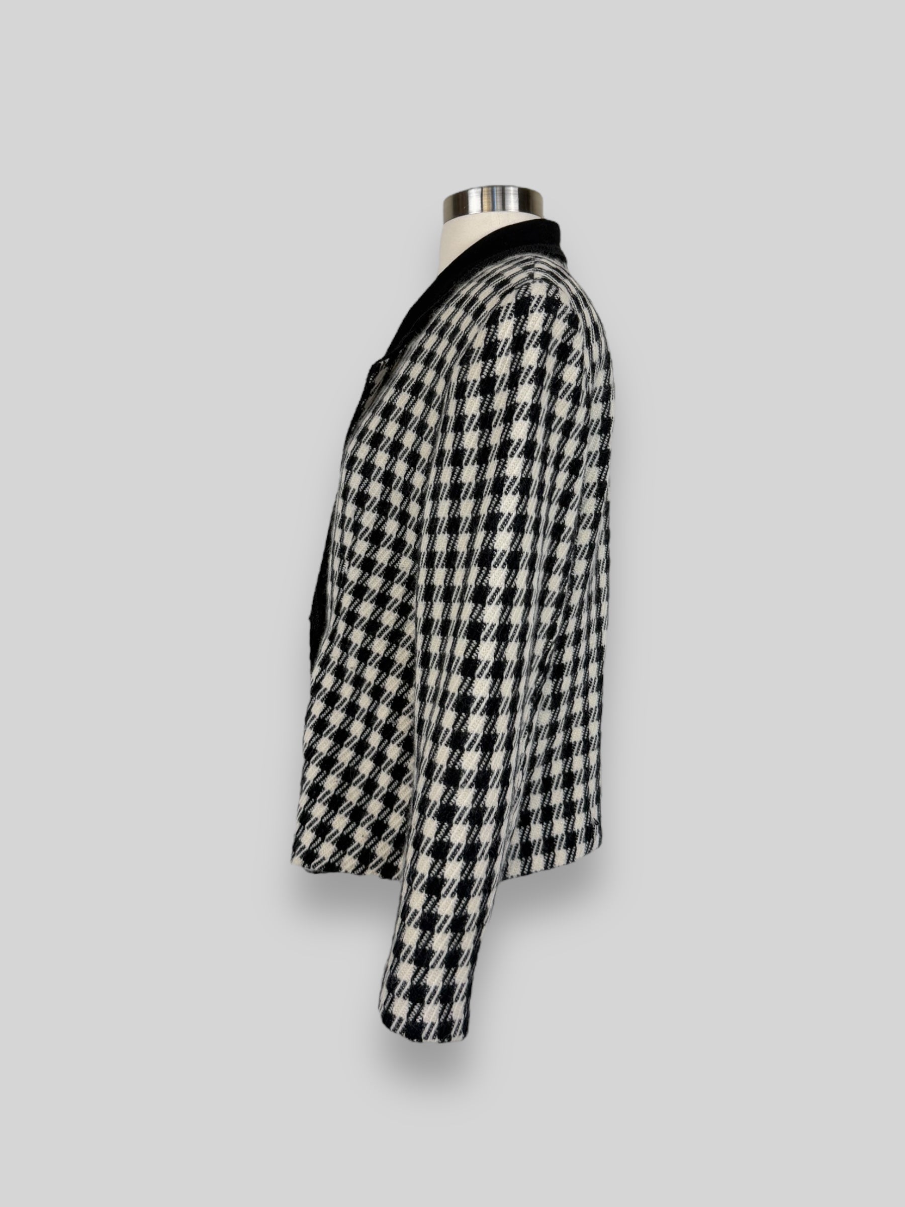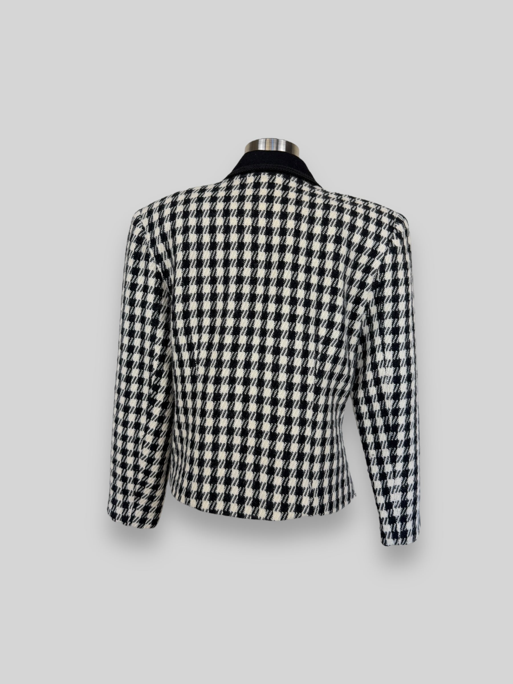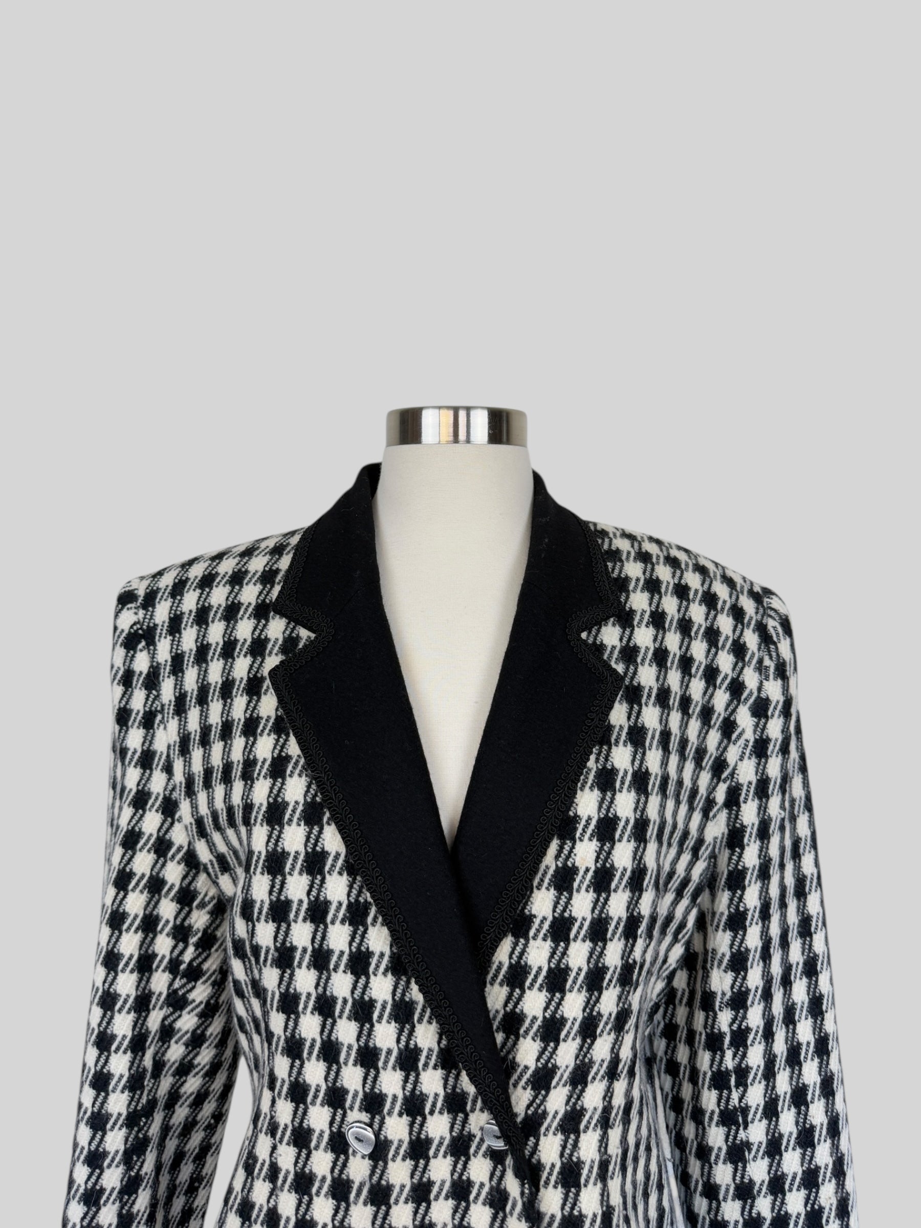 Vintage black and white houndstooth blazer with a structured silhouette, featuring a striking black lapel with intricate braided trim for added texture and elegance. The double-breasted front is adorned with silver-tone buttons, complementing the bold pattern. The slightly cropped length and padded shoulders enhance its tailored fit, making it a statement piece for refined, retro-inspired styling.