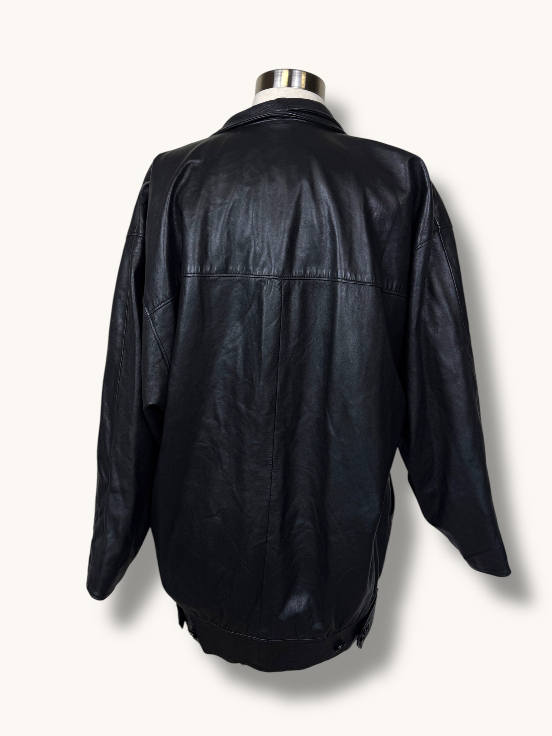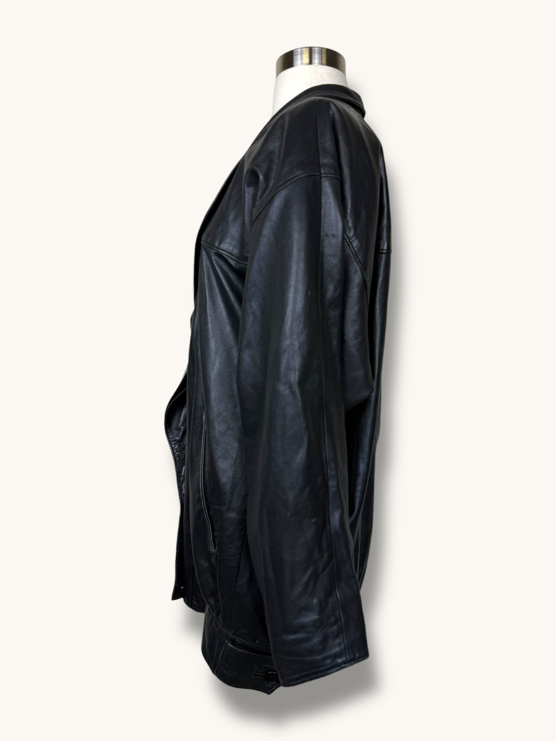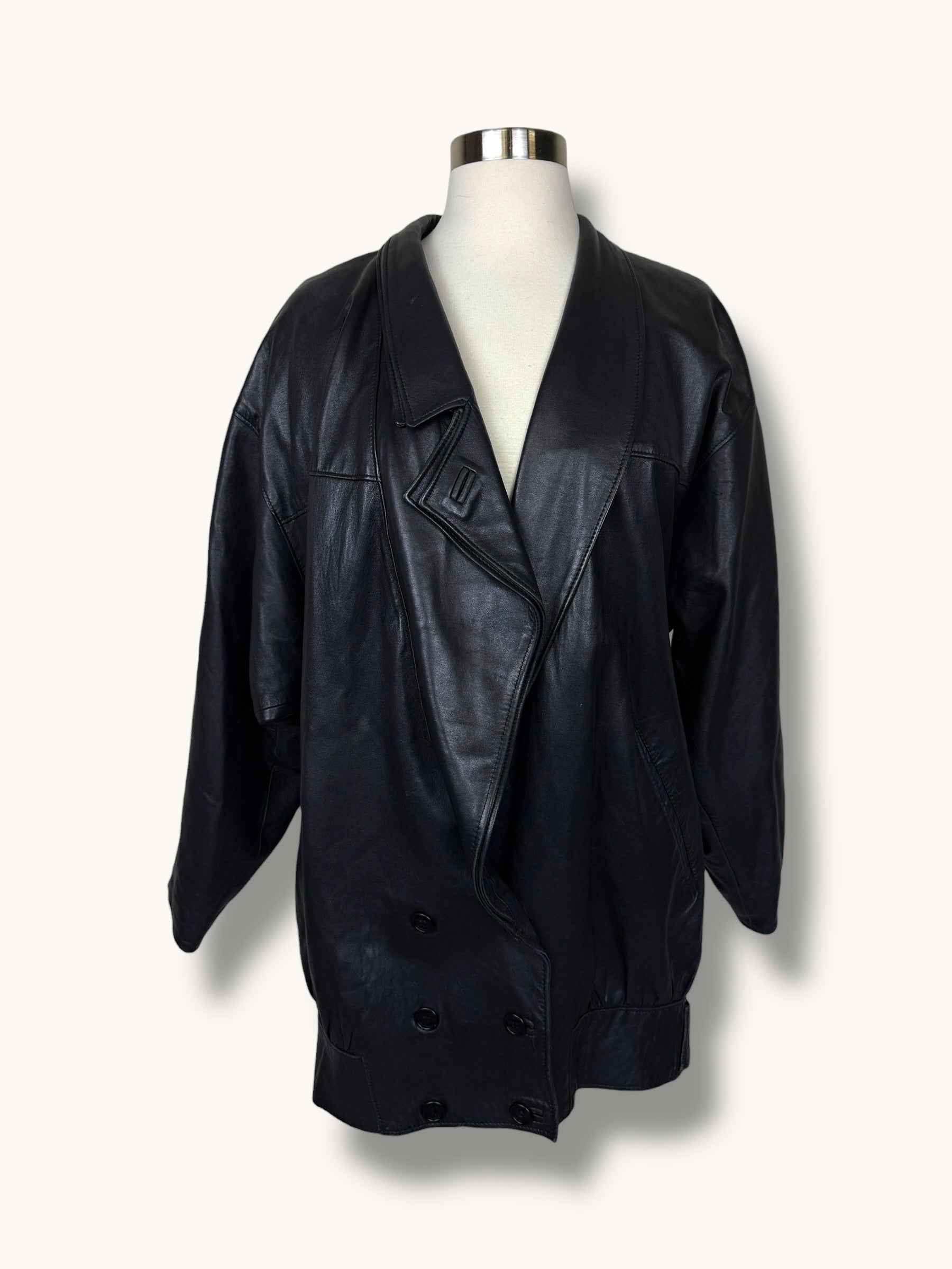 A beautifully crafted vintage Italian leather jacket made from exceptionally soft, supple black leather that drapes effortlessly on the body. Designed with an oversized silhouette and elegant shawl-style lapels, the jacket features subtle crossover detailing at the front and a unique double-breasted closure at the hem with small buttons that allow it to be fastened underneath for a more sculpted, tucked silhouette. The relaxed shoulders and smooth leather finish give it a timeless, effortless feel, making it the perfect statement layer over everything from tailored trousers to denim.
