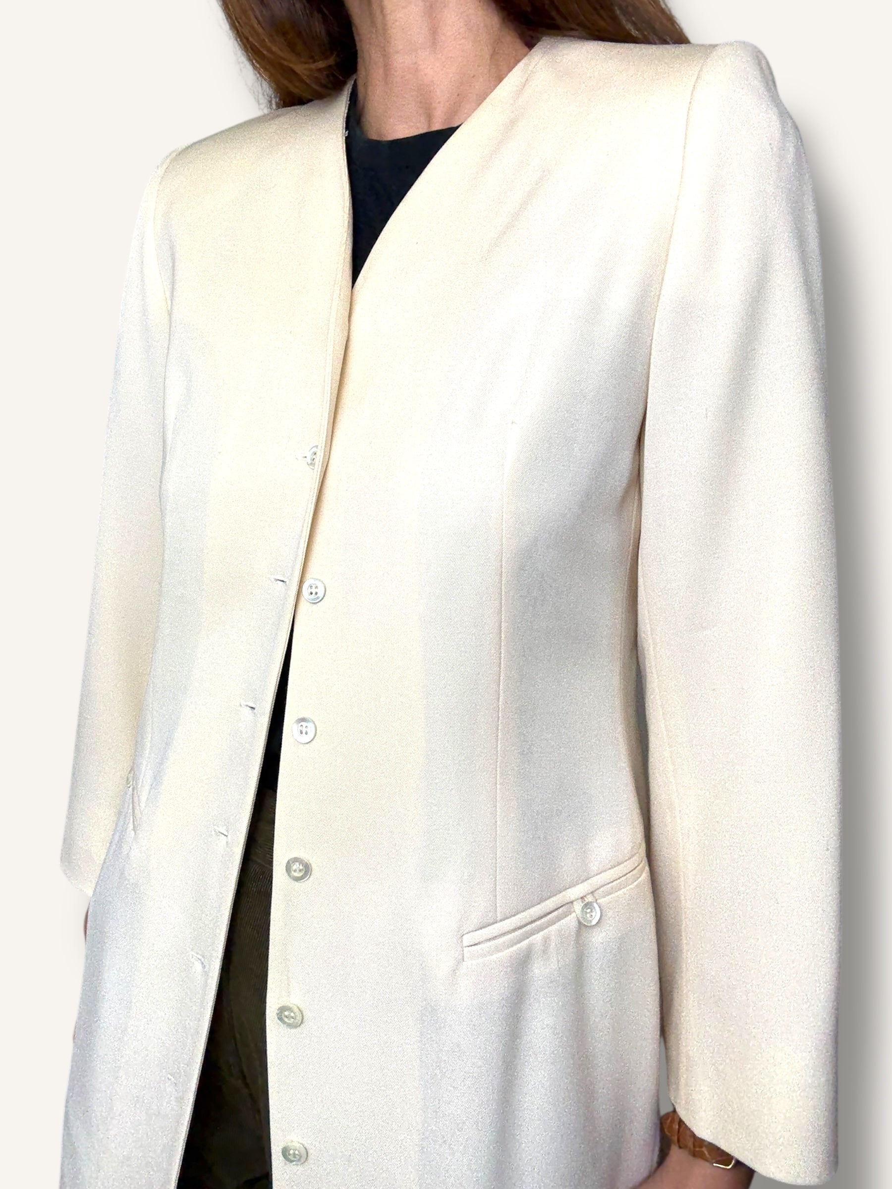 Vintage Nordstrom Cream Dress. A refined 80s Nordstrom dress in soft cream, tailored from lightweight woven fabric with a feminine yet structured silhouette. Featuring a V-neckline, front button closure with pearlescent buttons, and elegant long sleeves. It can be worn as a coat over pants. The back is beautifully detailed with intricate draped pleats that cinch the waist, enhancing its hourglass shape. Timeless and sophisticated, this piece captures understated glamour, perfect for both daytime polish and evening elegance.