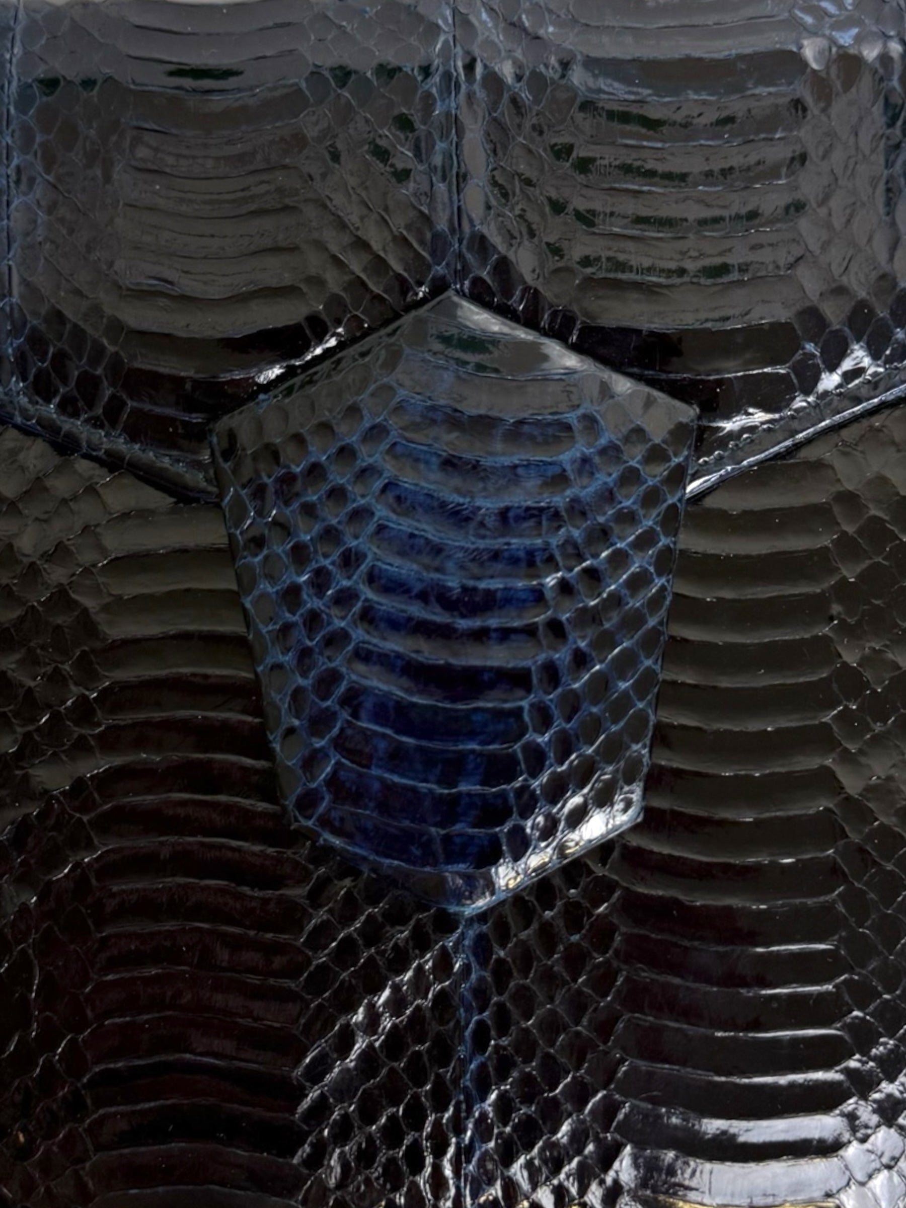 Vintage J. Renee Snakeskin Clutch Bag. This striking vintage clutch is crafted from genuine snakeskin in a deep midnight black with subtle blue undertones that catch the light beautifully. Its bold envelope silhouette and matching snakeskin clasp create a sleek, sculptural effect, making it the perfect statement accessory. Long leather matching strap to wear on the shoulder or cross body. Spacious enough for evening essentials yet effortlessly elegant, this clutch brings timeless sophistication and a touch of edge to any look.