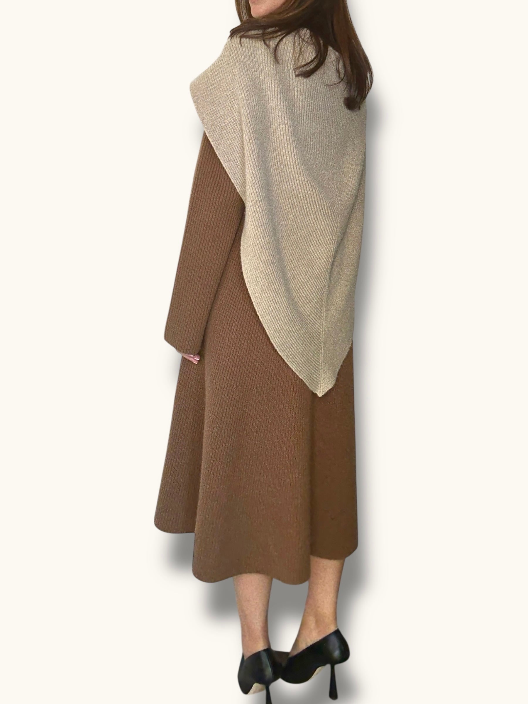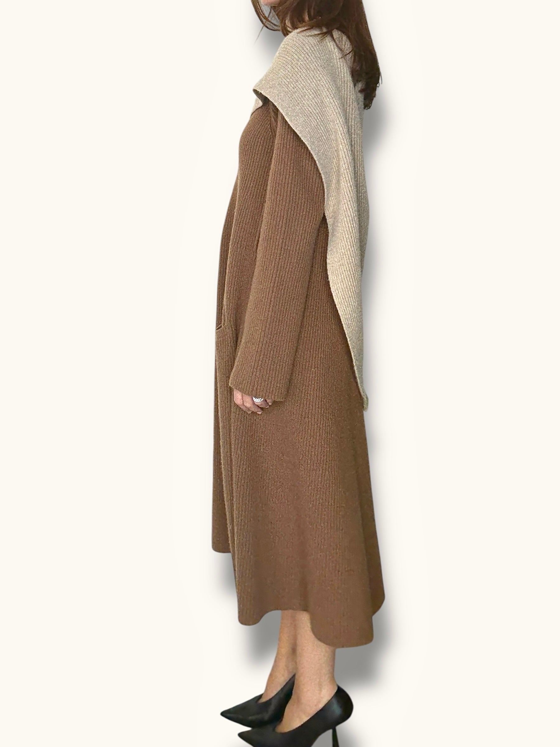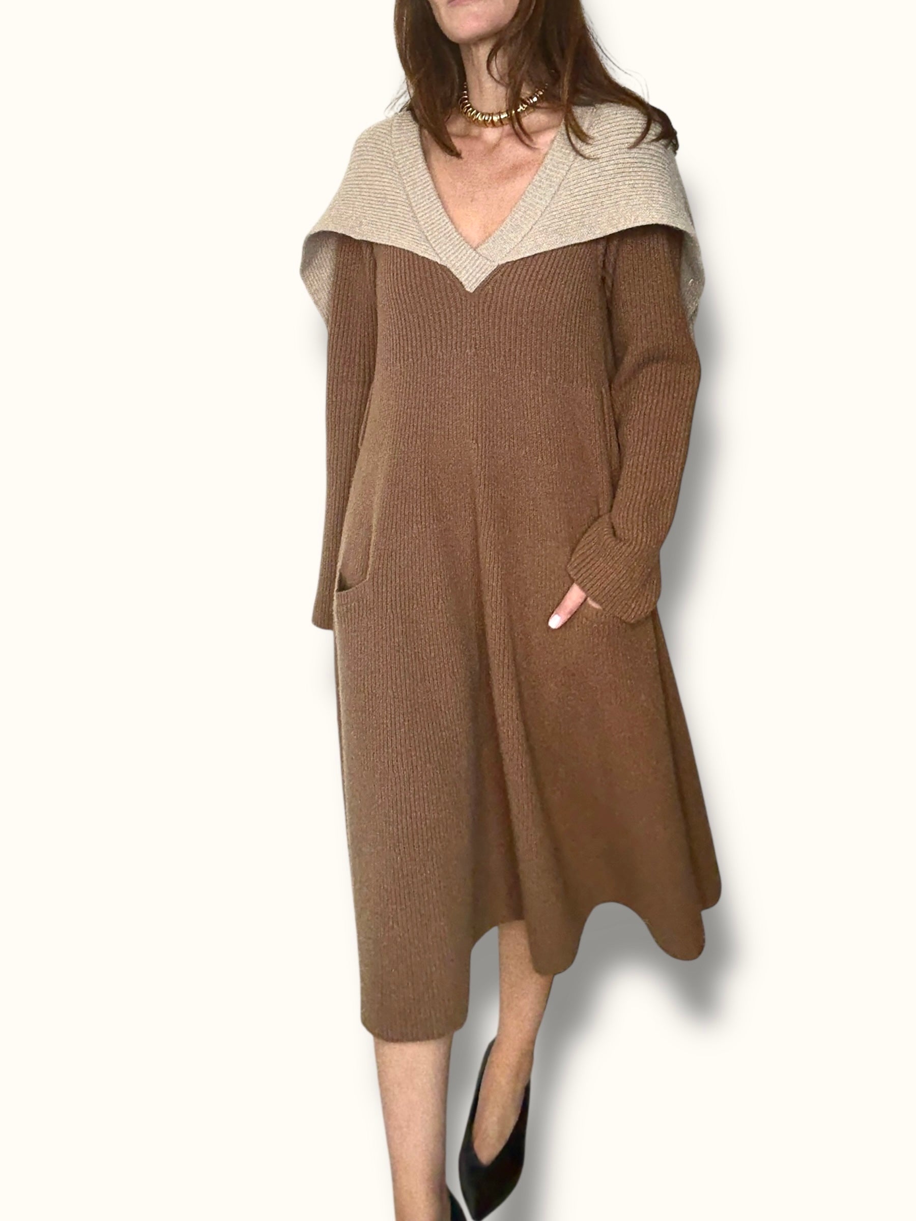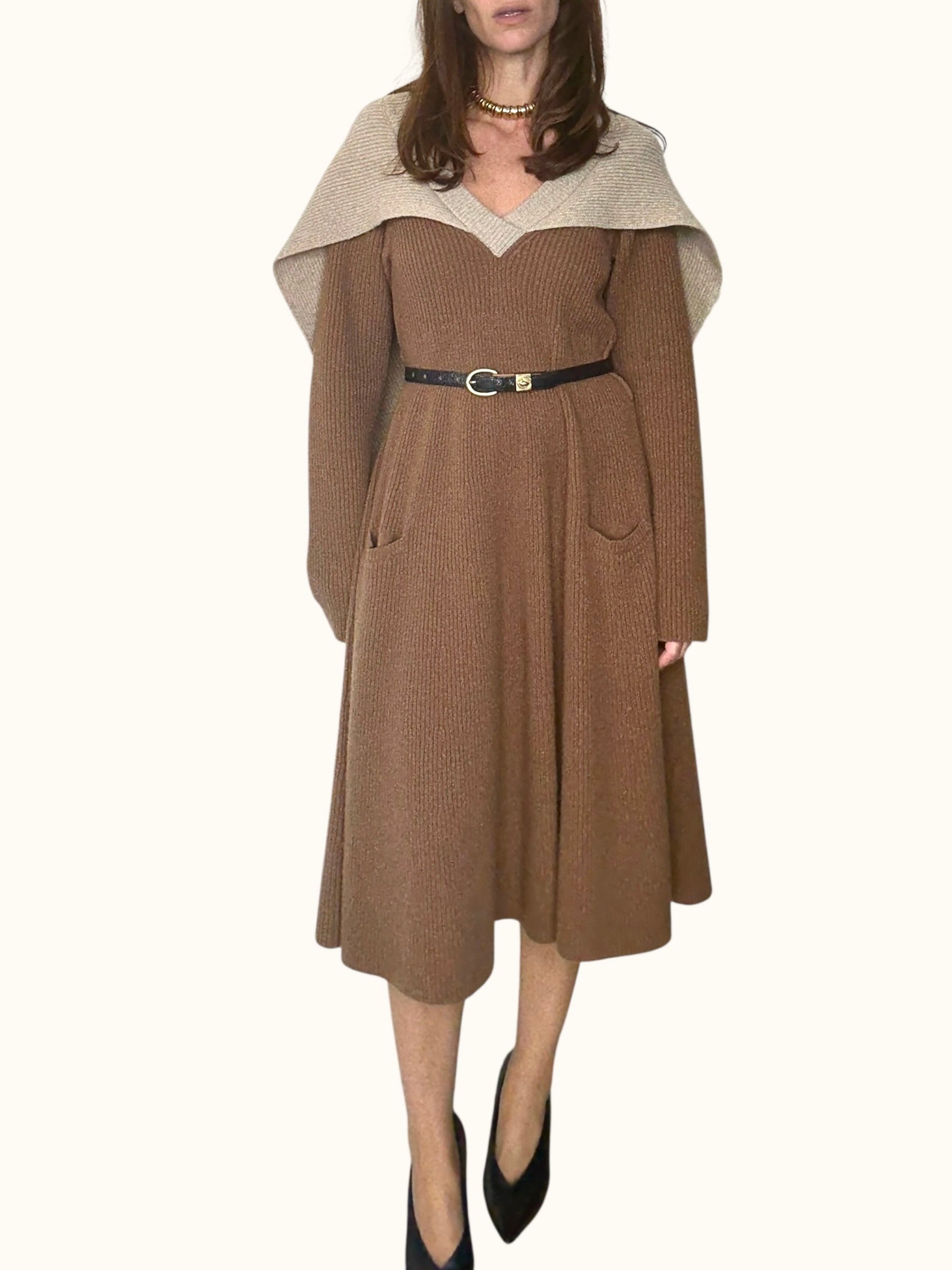 A collectible piece from JW Anderson’s runway archive. Knit dress crafted in 100% sheep wool. Designed in ribbed chestnut brown with a contrasting beige shawl detail, it features a V neckline, long sleeves, front pockets, and a flared silhouette. Originally came with a matching belt (missing), but easy to style with any belt as seen on runway looks.