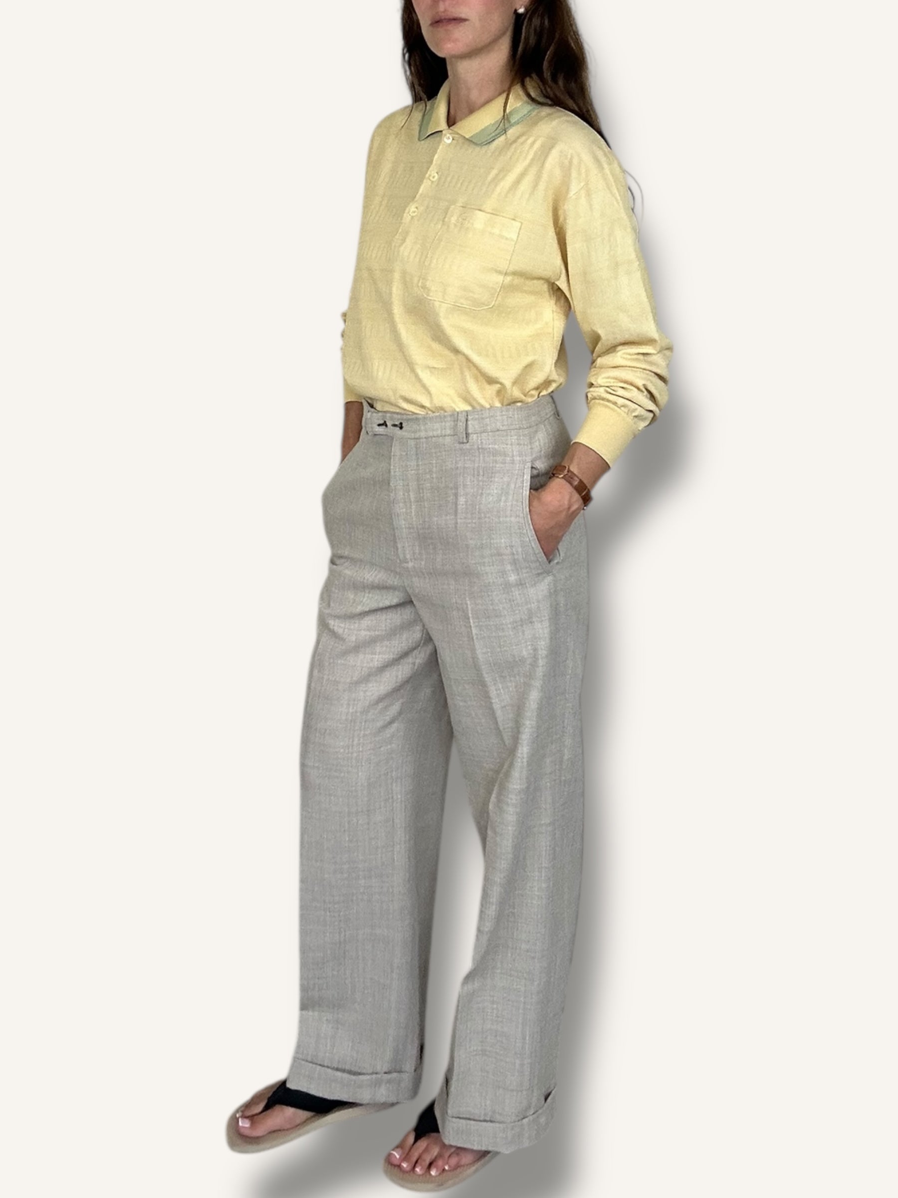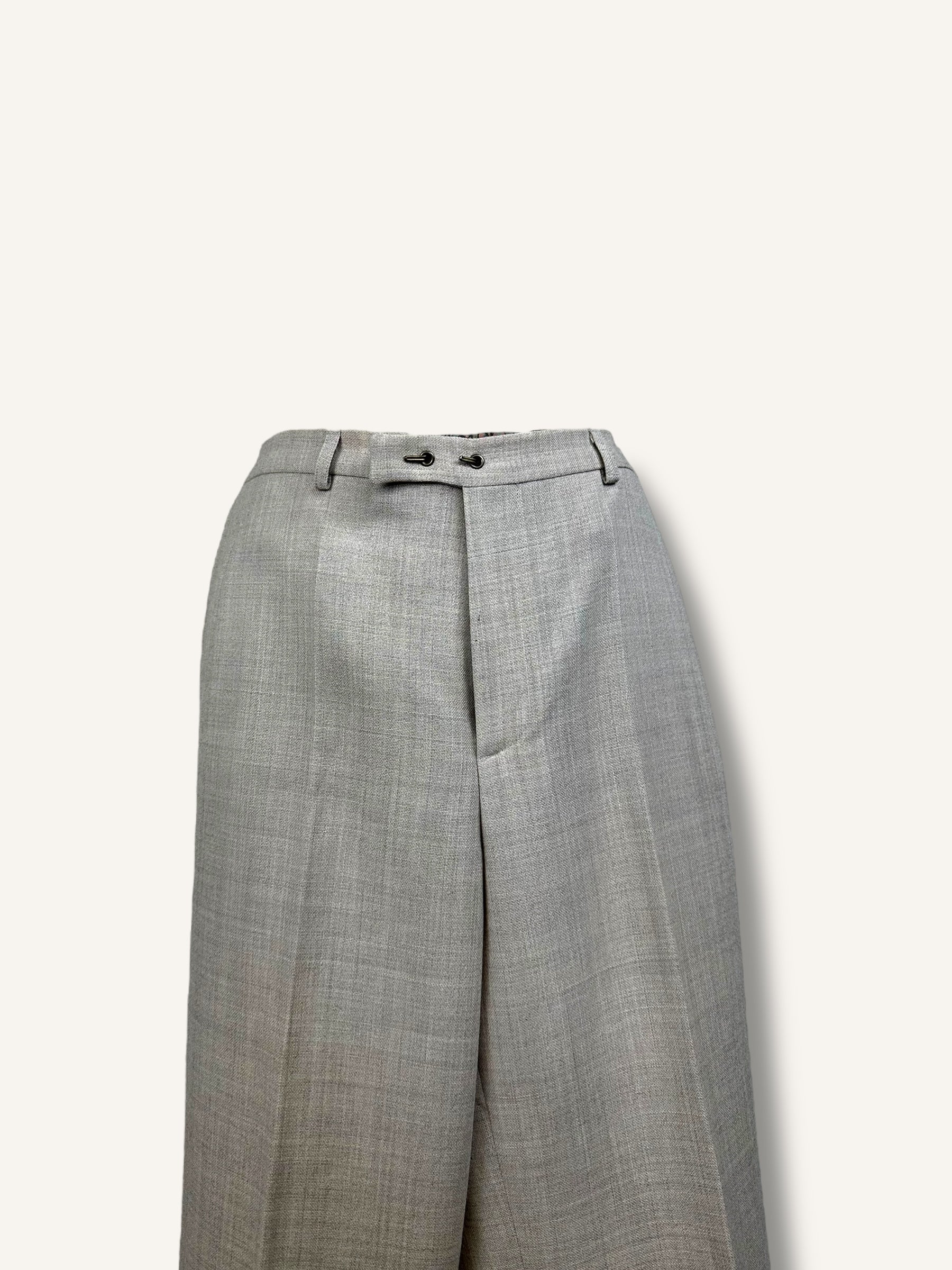 Elevate your wardrobe with these rare vintage Jean Paul Gaultier trousers — a refined nod to classic menswear with signature Gaultier edge. Tailored from a lightweight 100% wool in a soft grey-taupe blend, they feature a high-rise waist, sharp pleats, and a relaxed straight-leg silhouette that tapers ever so slightly at the cuffed hems. Detailed with double-button closure, belt loops, and back welt pockets, these trousers offer structured elegance with an effortlessly cool drape. Whether styled with a crisp button-down or dressed down with a tee, they bring quiet luxury and iconic ’90s tailoring to any look.