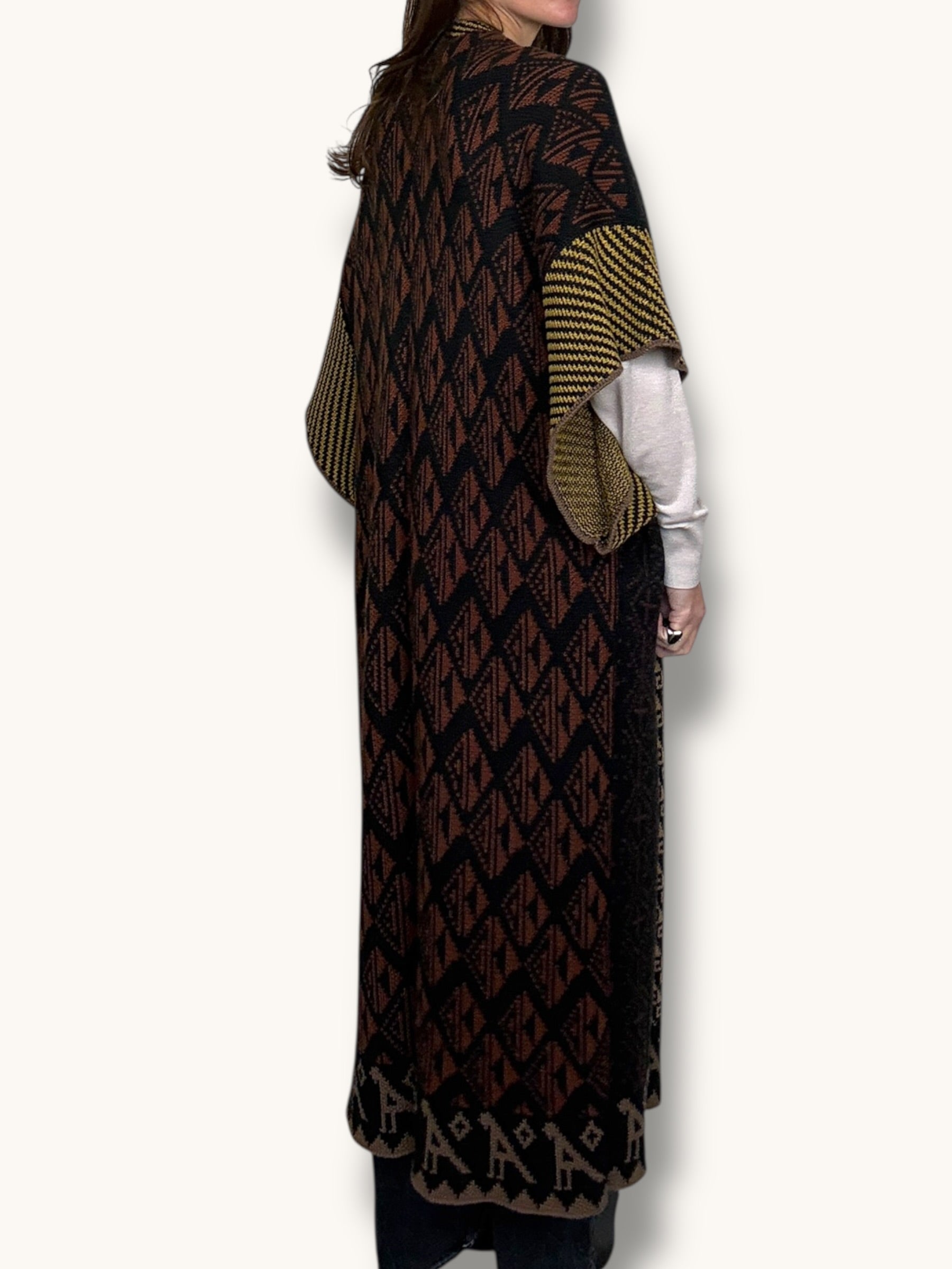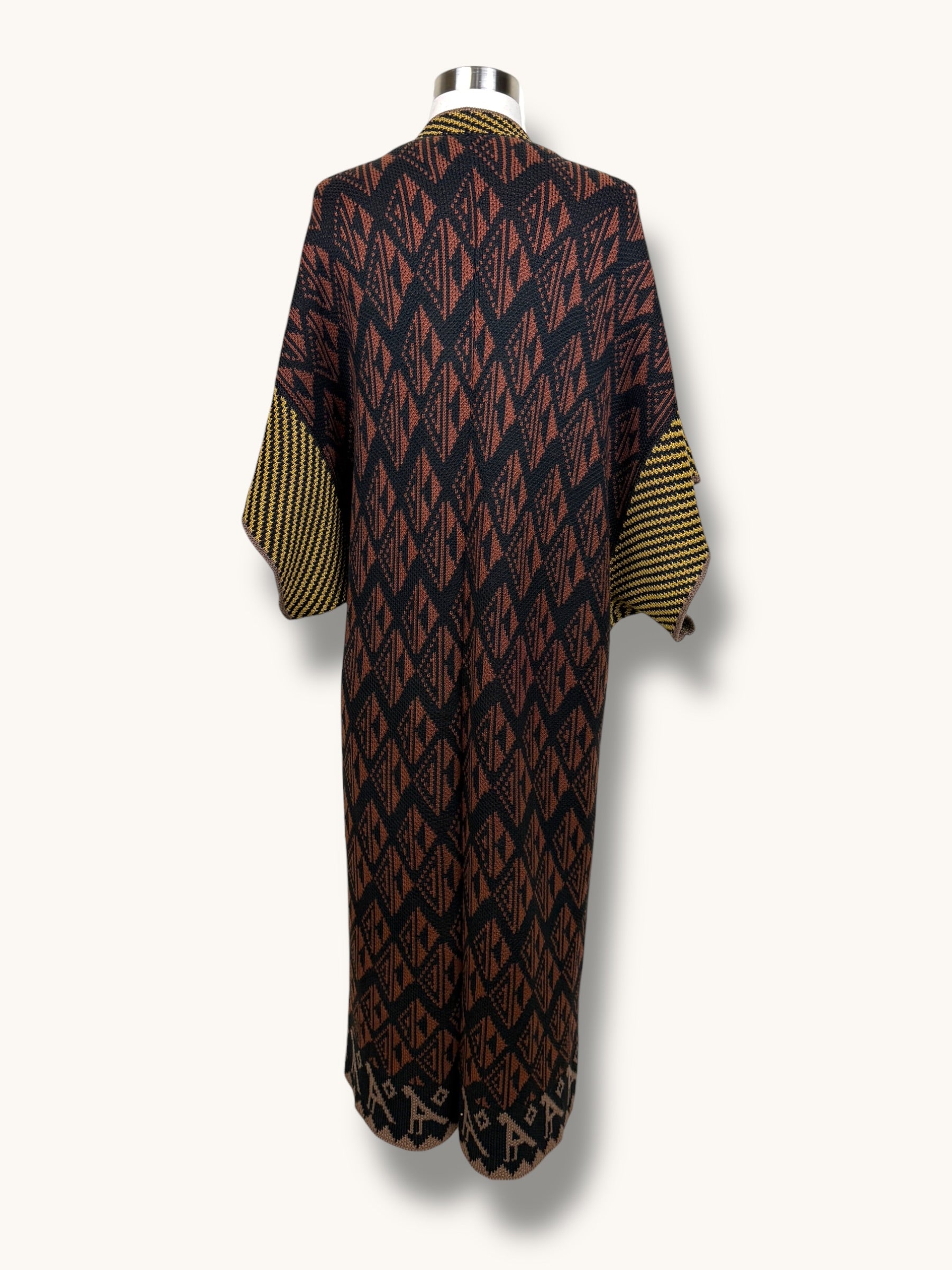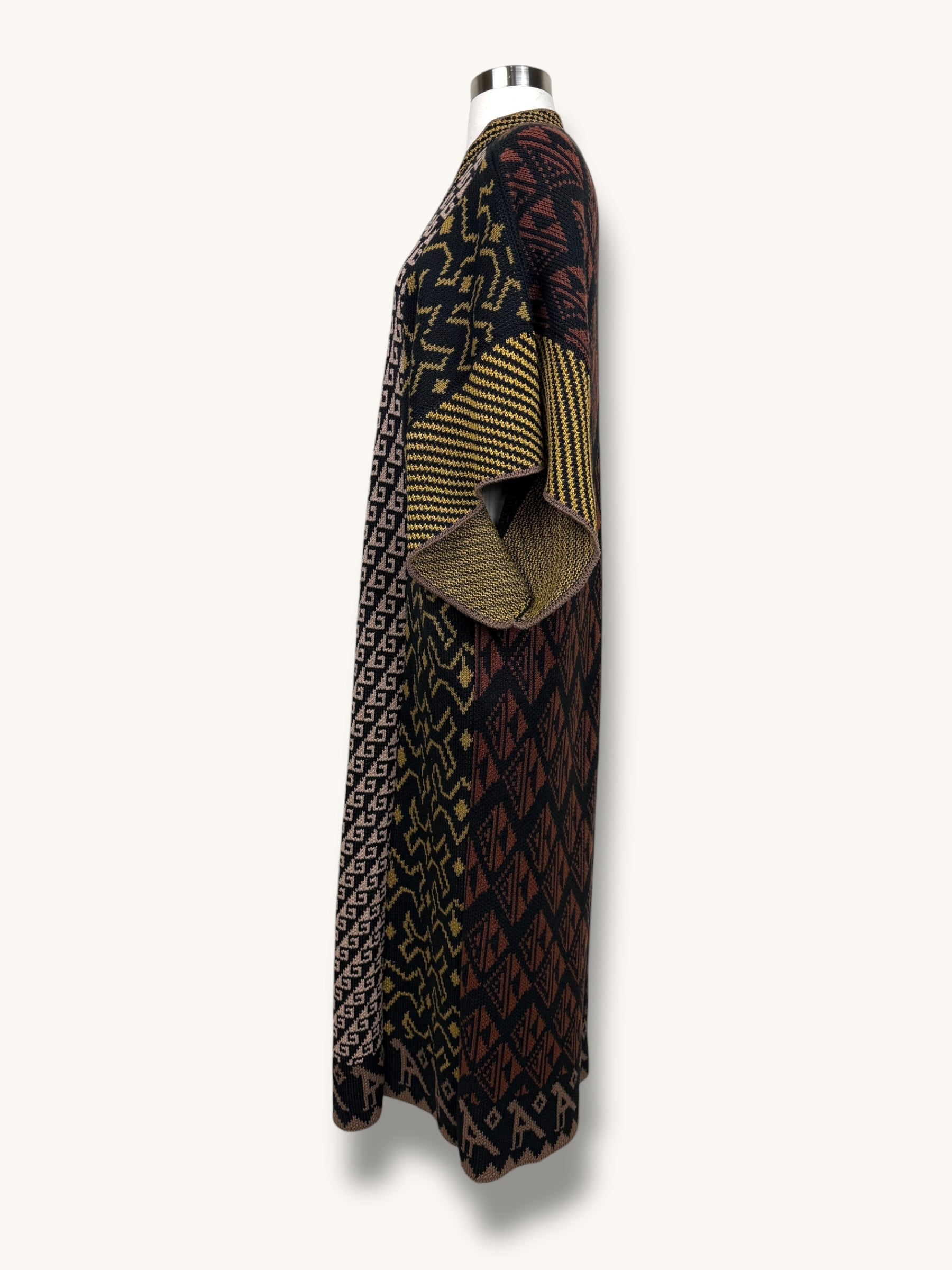A striking vintage knit duster crafted in a substantial, heavyweight jacquard with an unmistakably luxurious feel. Designed in a long, open-front silhouette with wide kimono-style sleeves, it features an artful mix of geometric and tribal-inspired patterns in rich tones of black, camel, mustard, and deep rust. The dense knit gives it beautiful structure and drape, while the contrasting vertical panels create a flattering, elongating effect. Cozy, dramatic, and incredibly elevated, this statement layering piece feels more like a wearable tapestry — perfect over denim or styled over a sleek monochrome look for maximum impact.