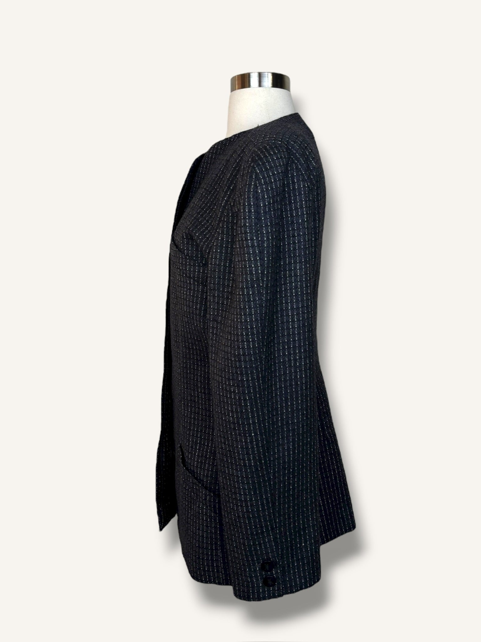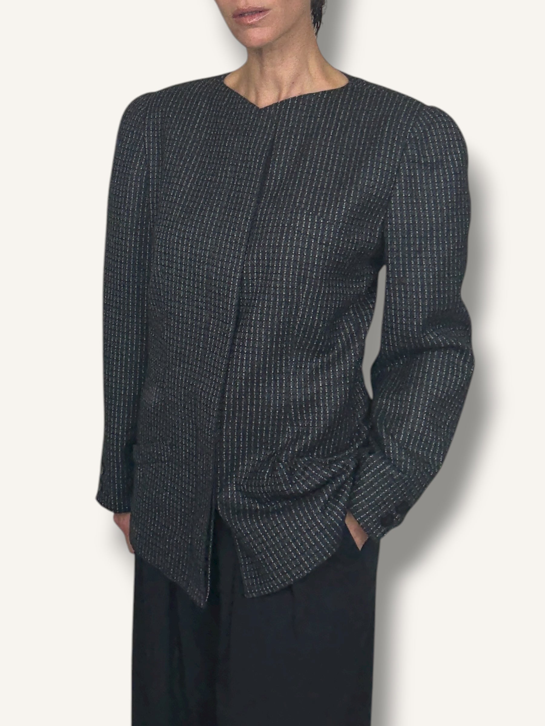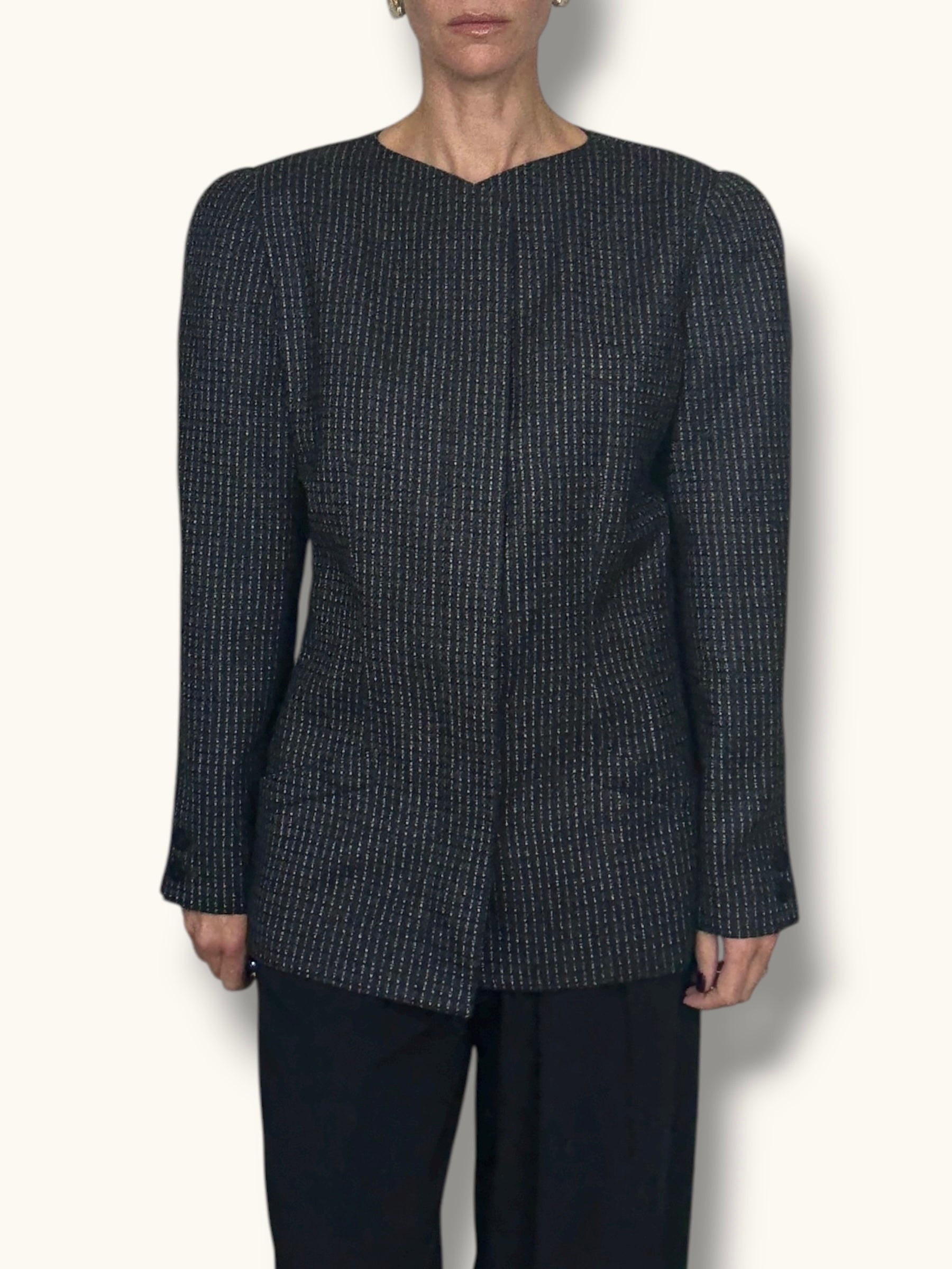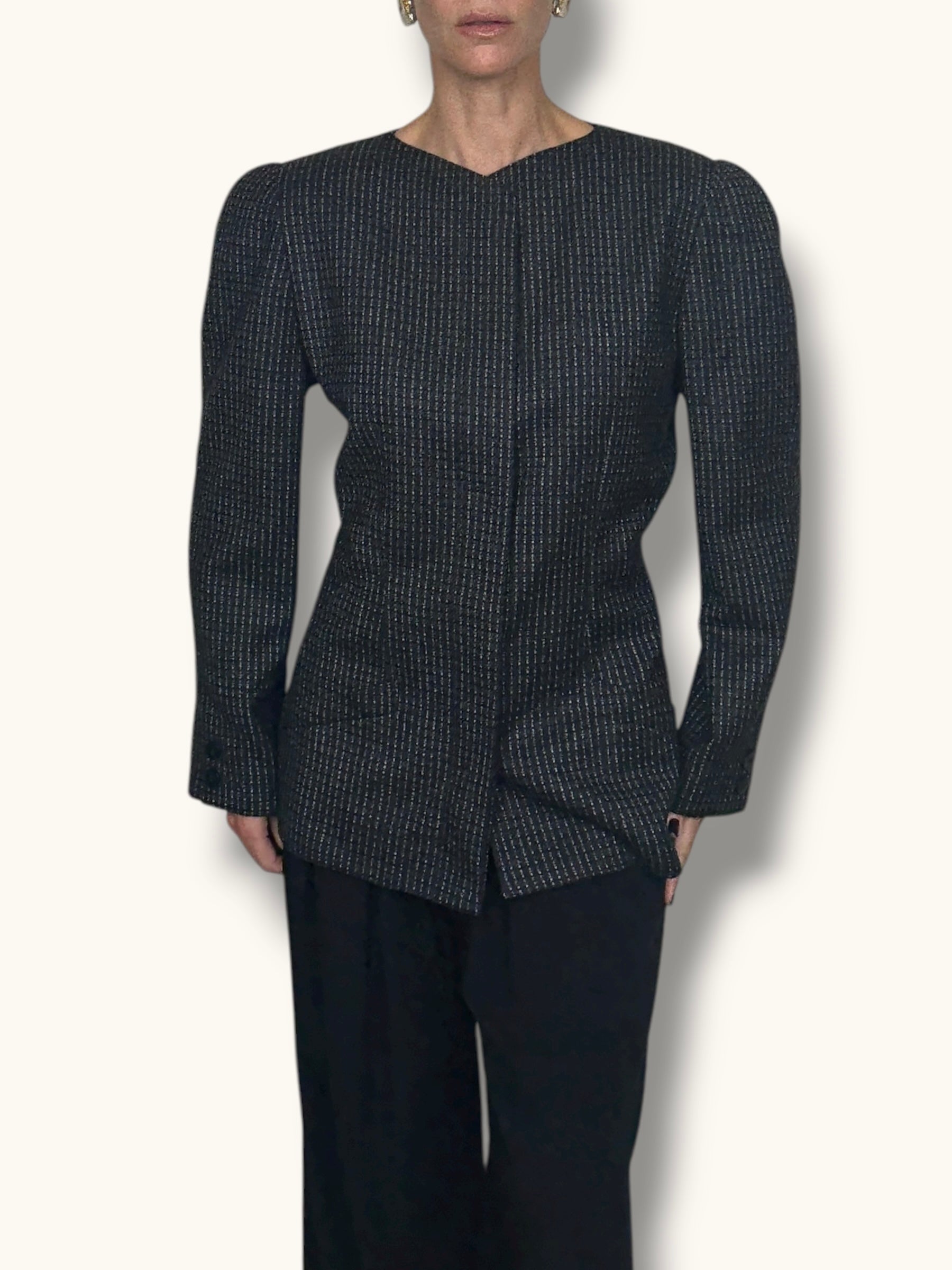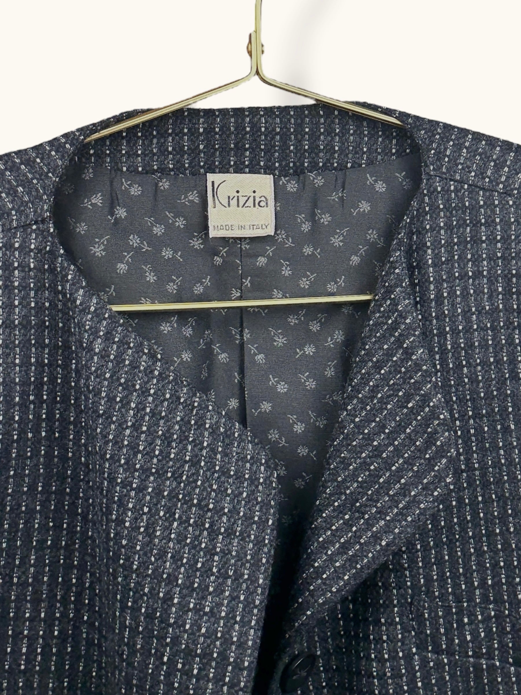 Vintage Krizia Wool Blazer. A stunning Italian-made piece by Krizia, this vintage blazer combines luxurious grey wool pinstripe pattern for a bold yet refined look. The structured silhouette and pointed collar create an elegant shape, while the vertical paneling elongates the body for a flattering fit. Finished with a hidden front button closure and meticulous Italian craftsmanship, this jacket embodies timeless sophistication with a modern edge — a true collector’s piece from Krizia’s iconic era.