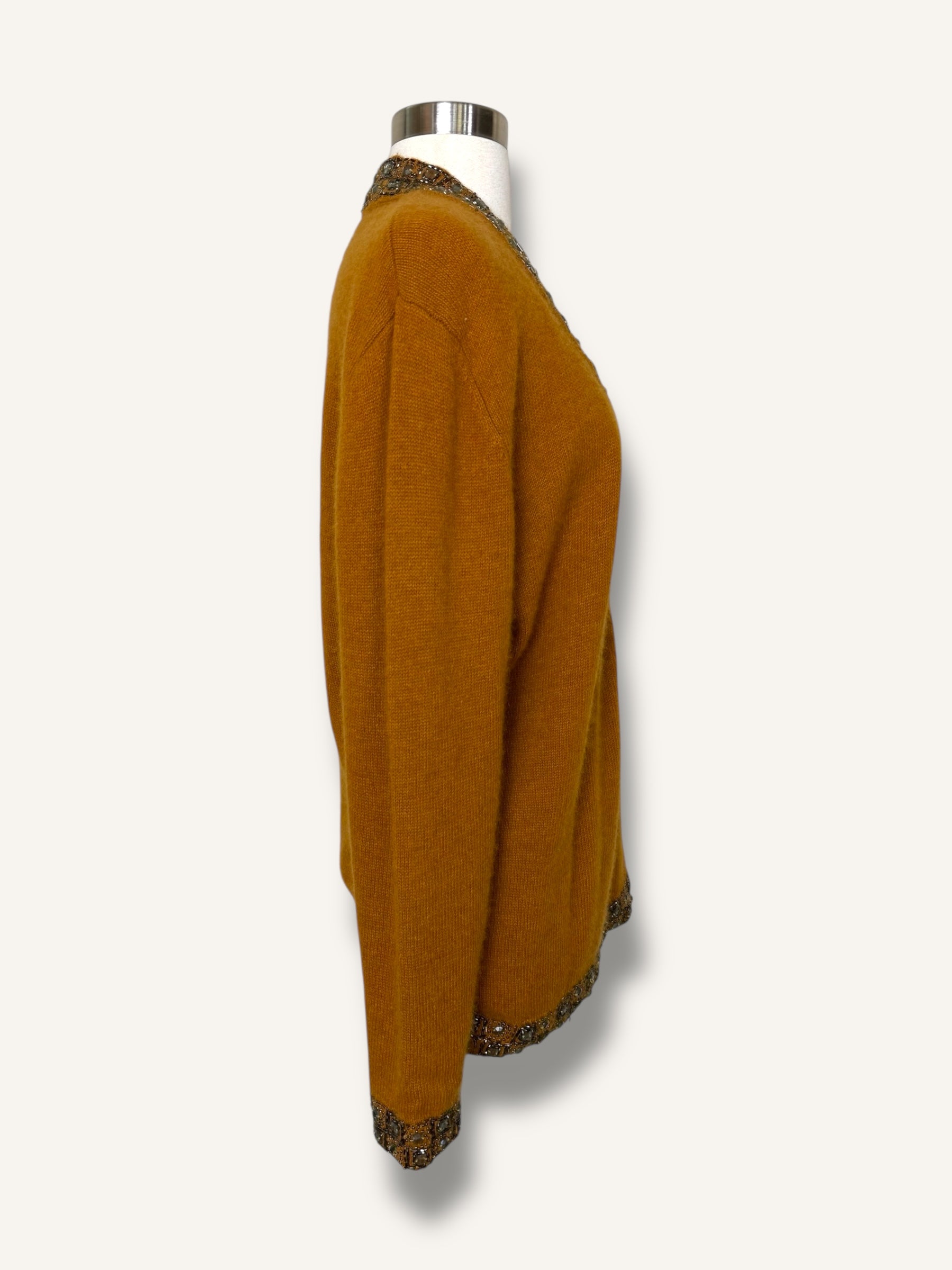 A rich mustard brown lambswool sweater, elevated with intricate sequin and bead embellishment along the neckline, wrap-style front, cuffs, and hem. Crafted from 100% lambswool, it’s soft, warm, and designed with a relaxed fit that balances cozy ease with a touch of glamour.