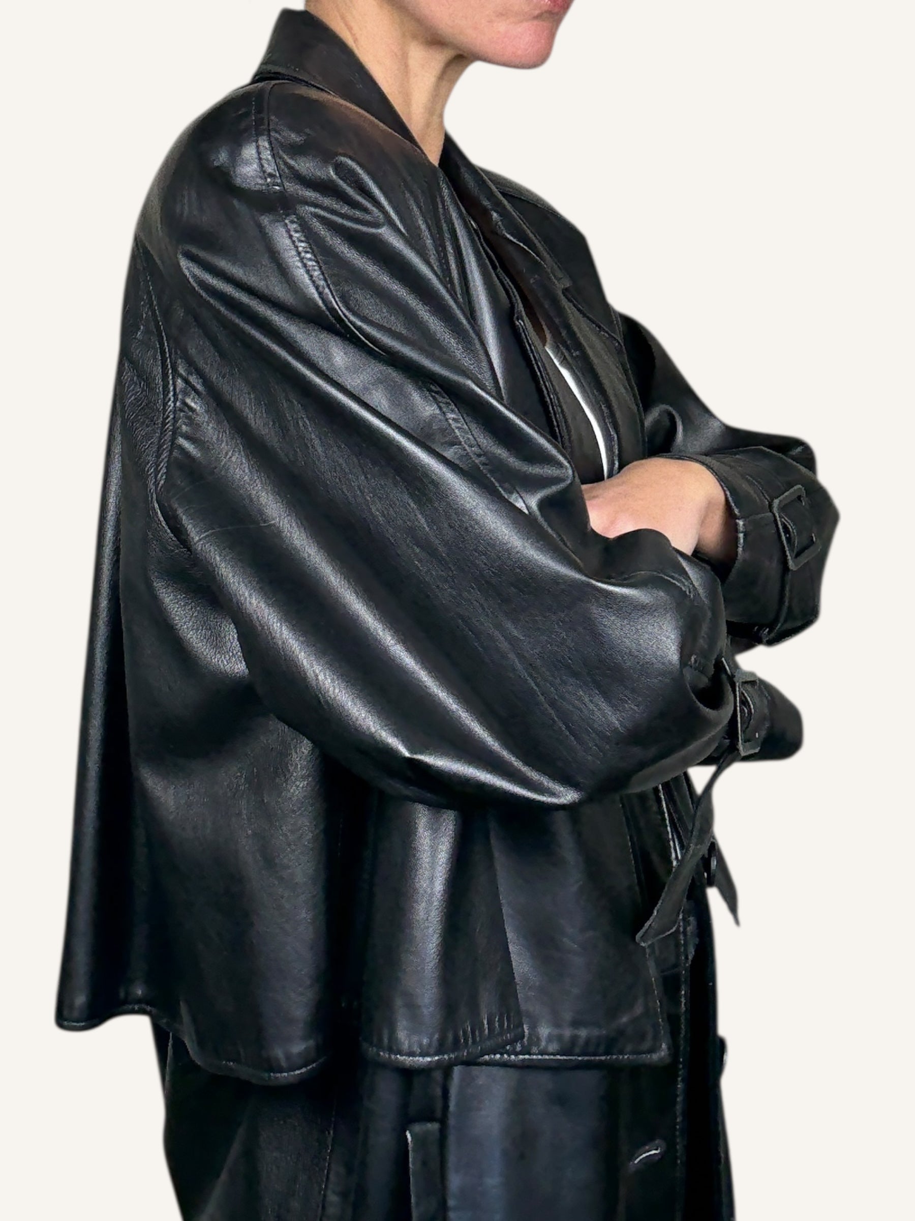 A timeless vintage Made in USA leather coat with an effortlessly chic, architectural silhouette. Crafted from supple black leather with a beautiful natural sheen, this one-of-a-kind piece blends classic tailoring with a modern, editorial edge. The coat features a structured notched collar, oversized sleeves with adjustable buckle cuffs, and a unique layered back panel that adds movement and dimension. Front button closure and two side pockets make it both practical and polished, while its longline shape creates an elongating, ultra-flattering fit.