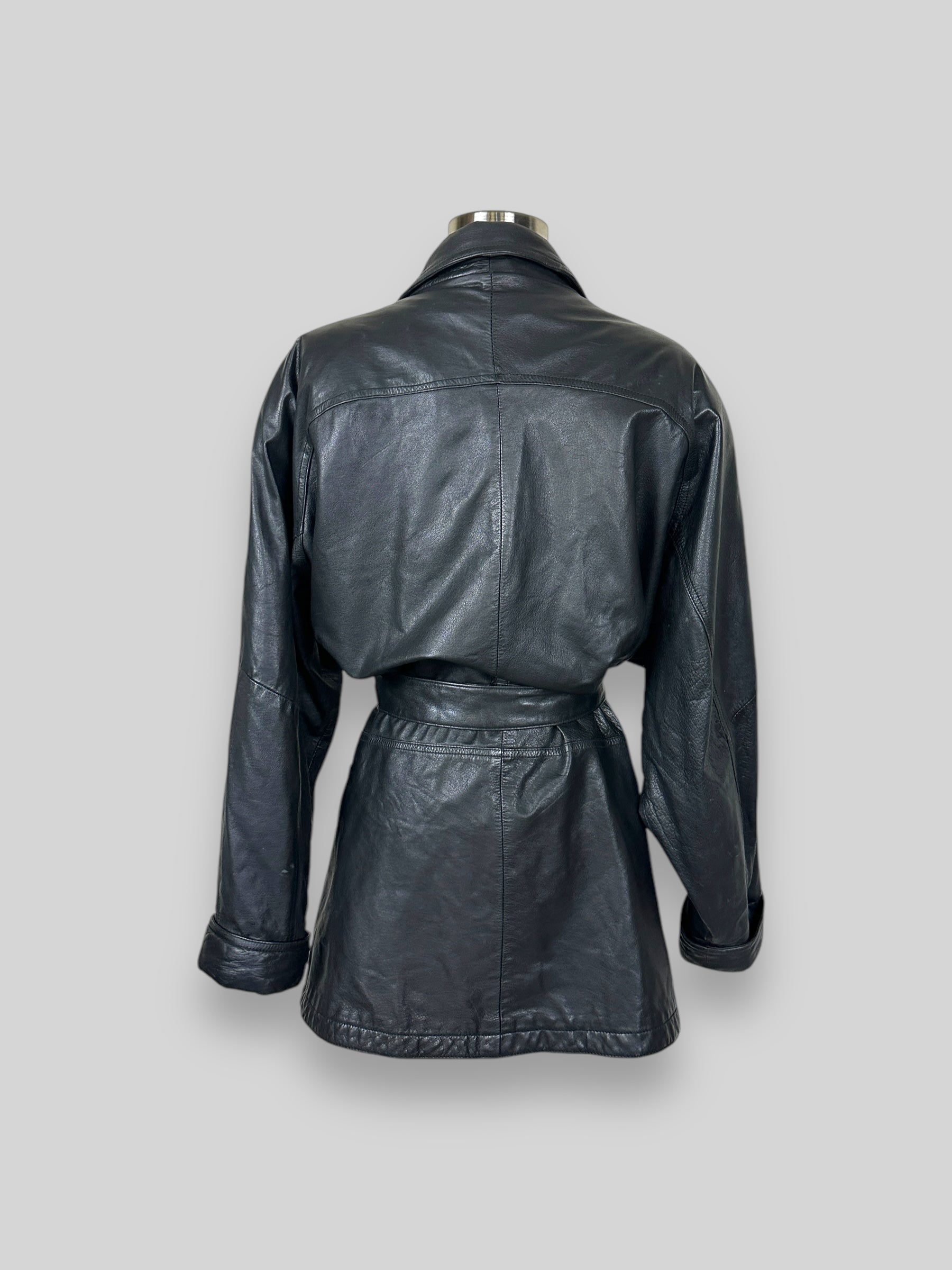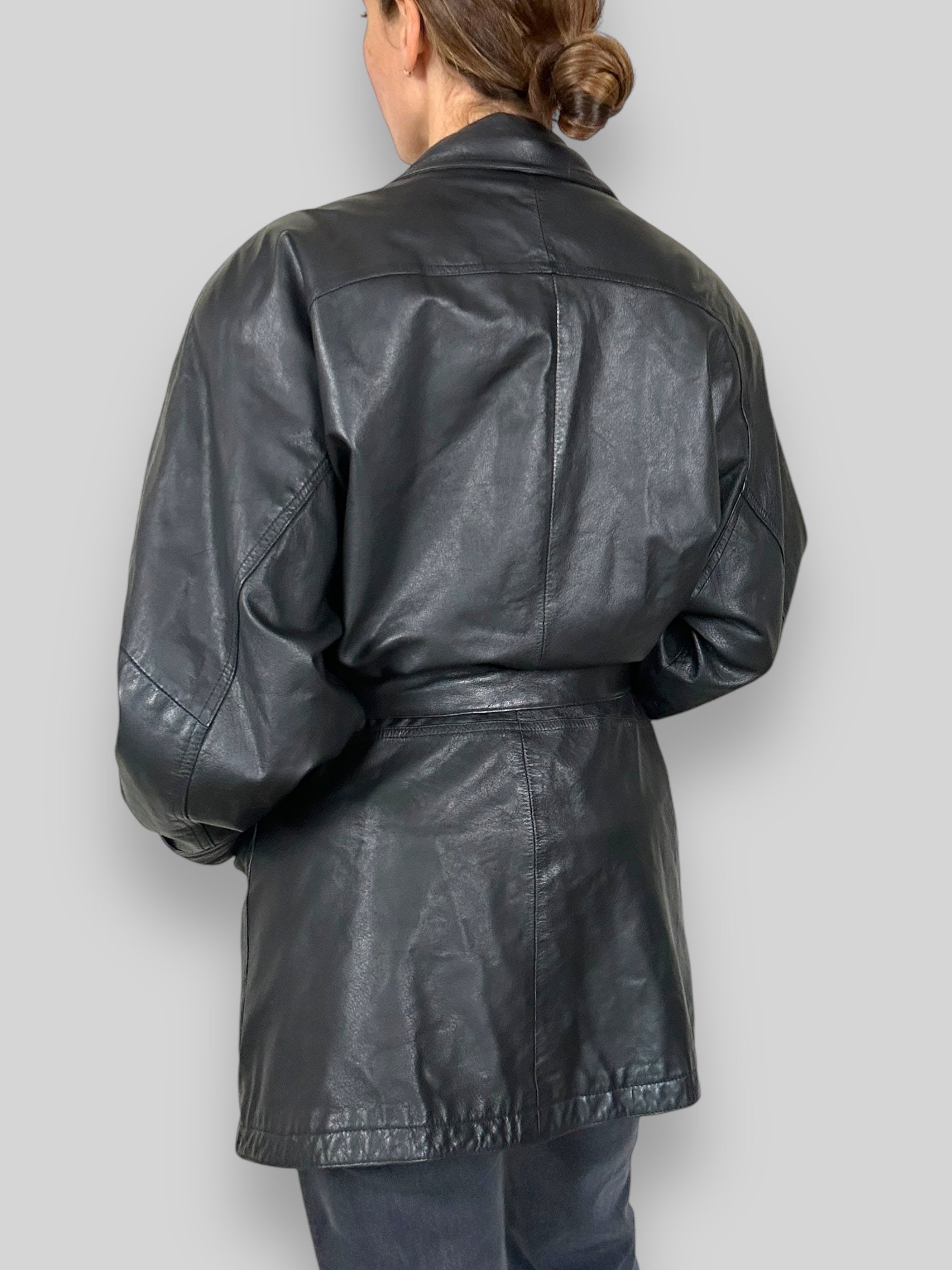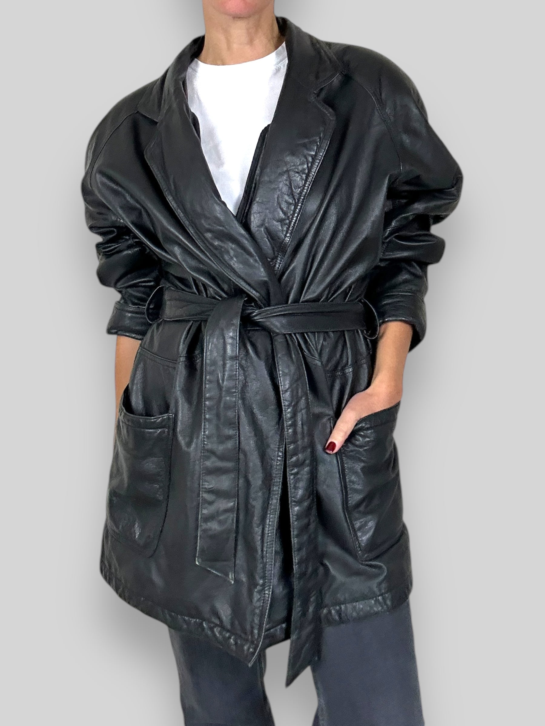 Vintage Black Leather Belted Coat. Elevate your wardrobe with this classic vintage black leather coat. Perfectly combining timeless design and functionality, this piece is a true statement item.