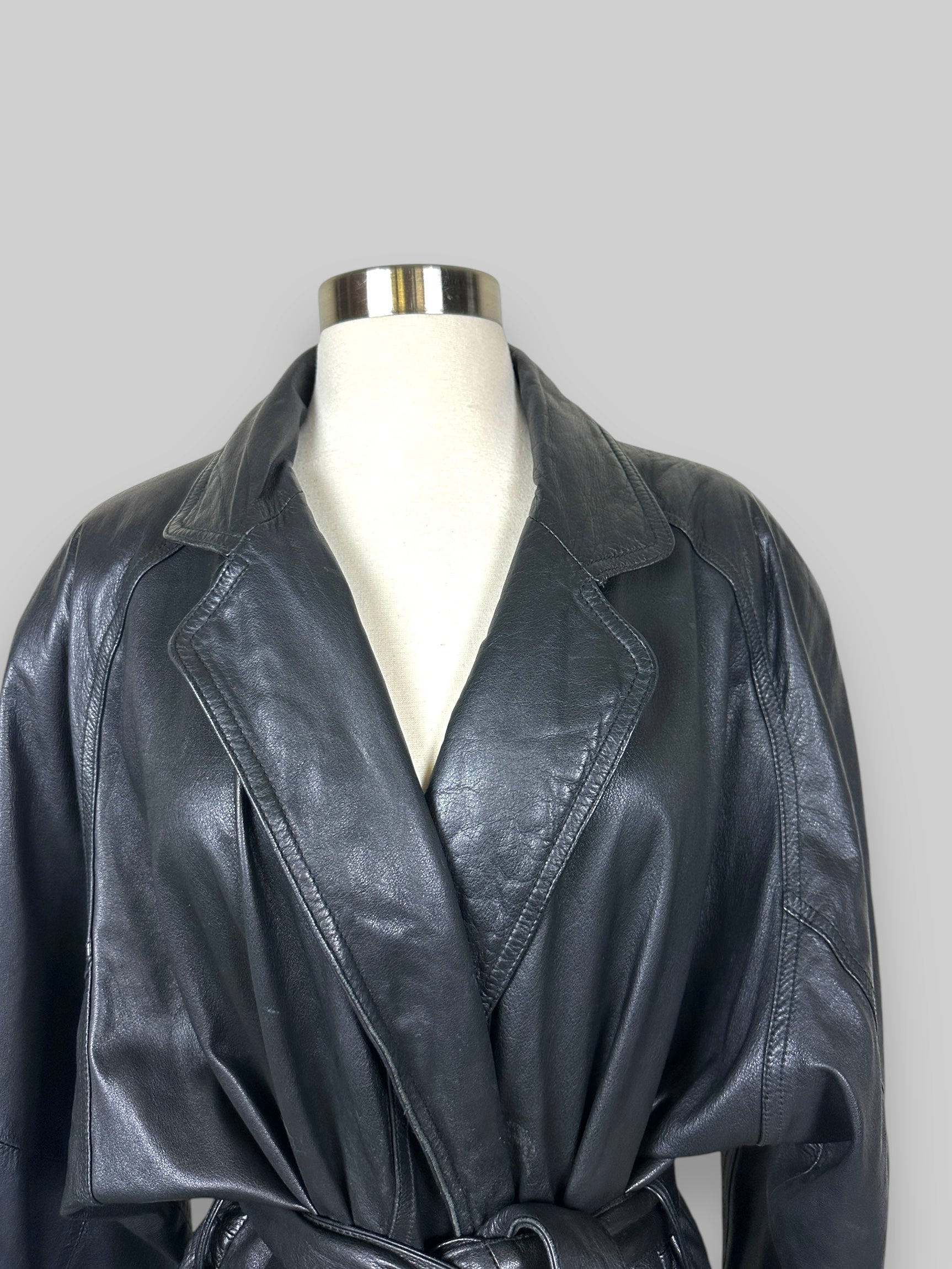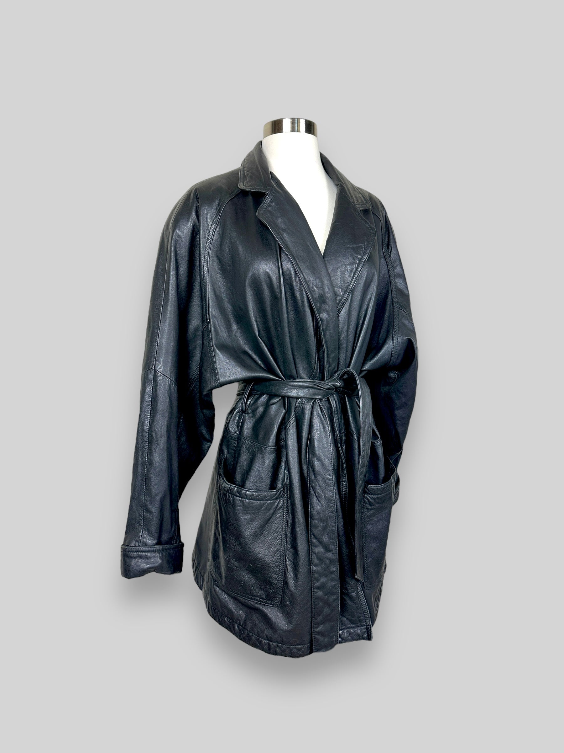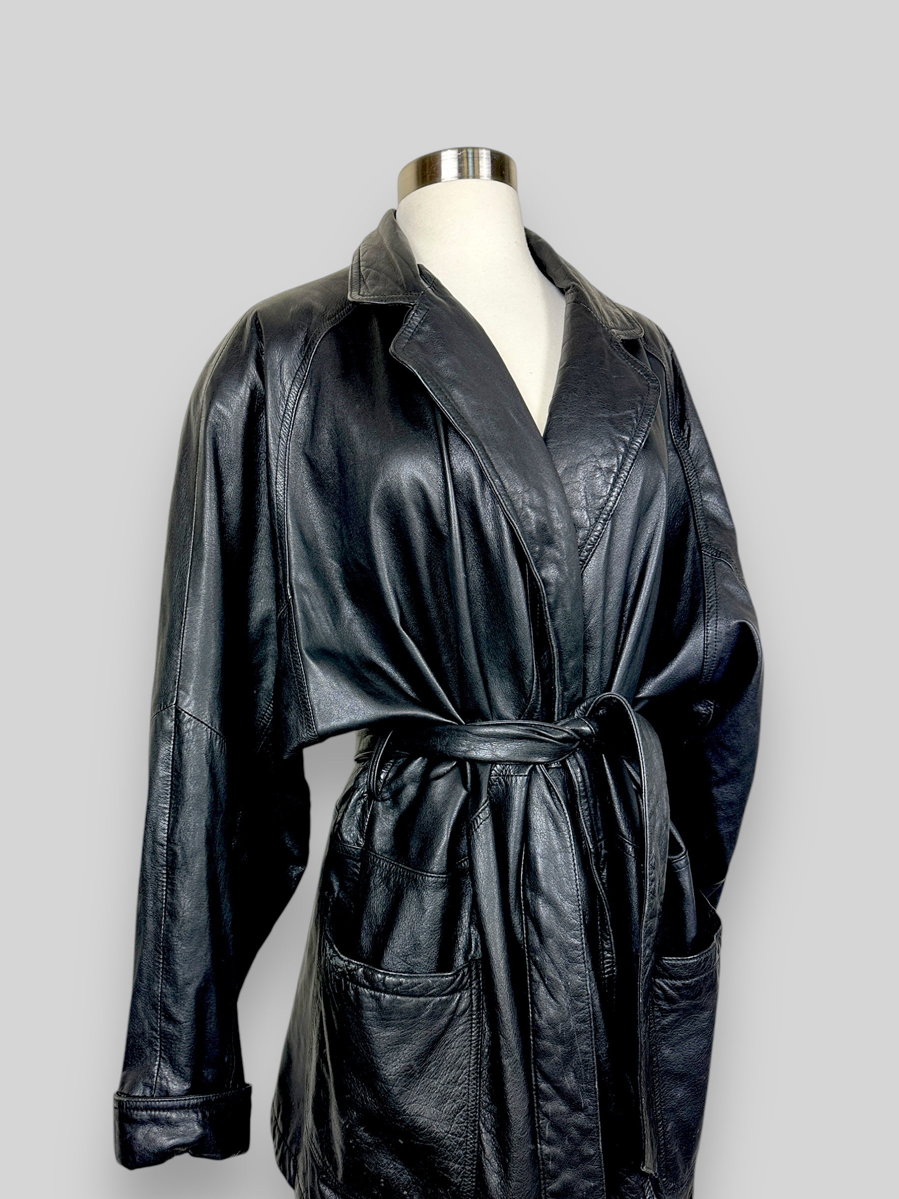 Vintage Black Leather Belted Coat. Elevate your wardrobe with this classic vintage black leather coat. Perfectly combining timeless design and functionality, this piece is a true statement item.