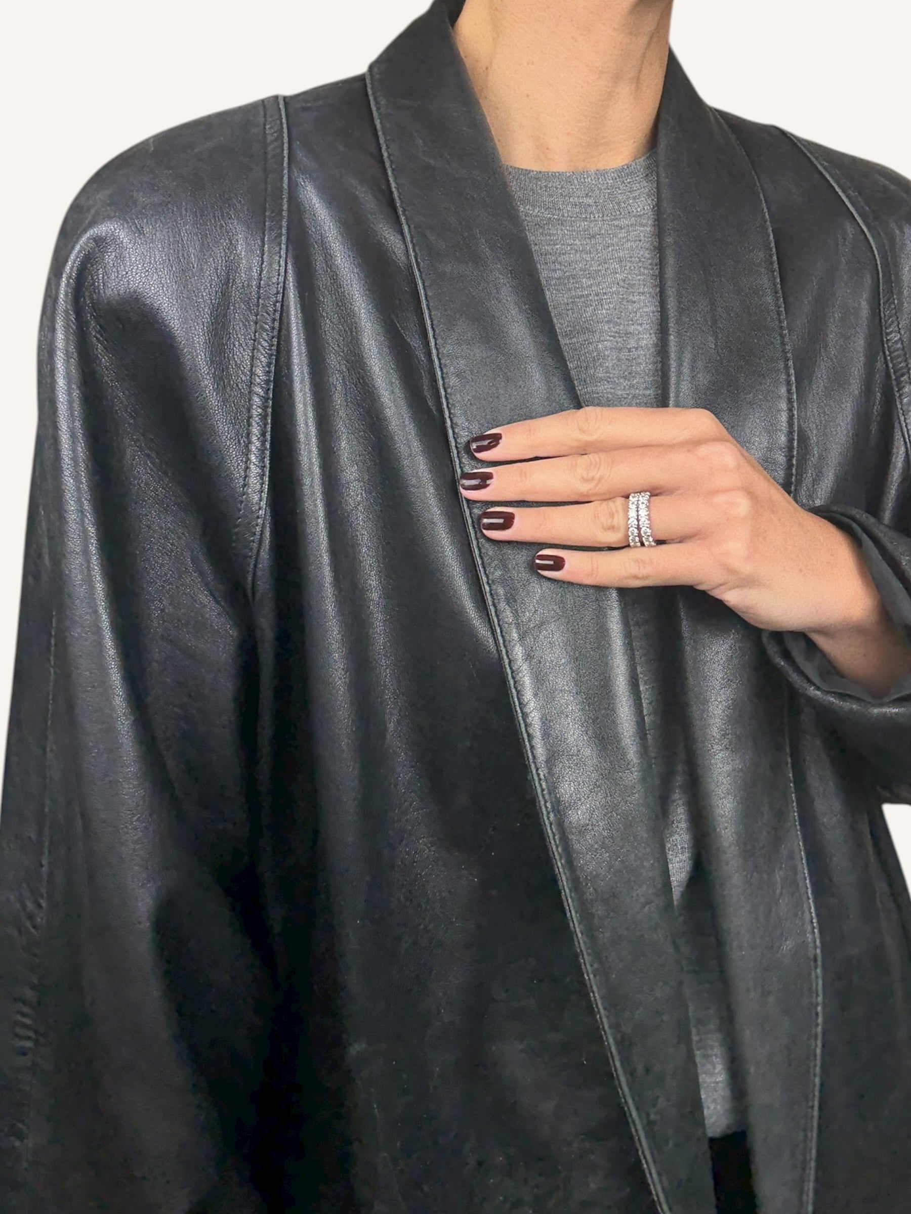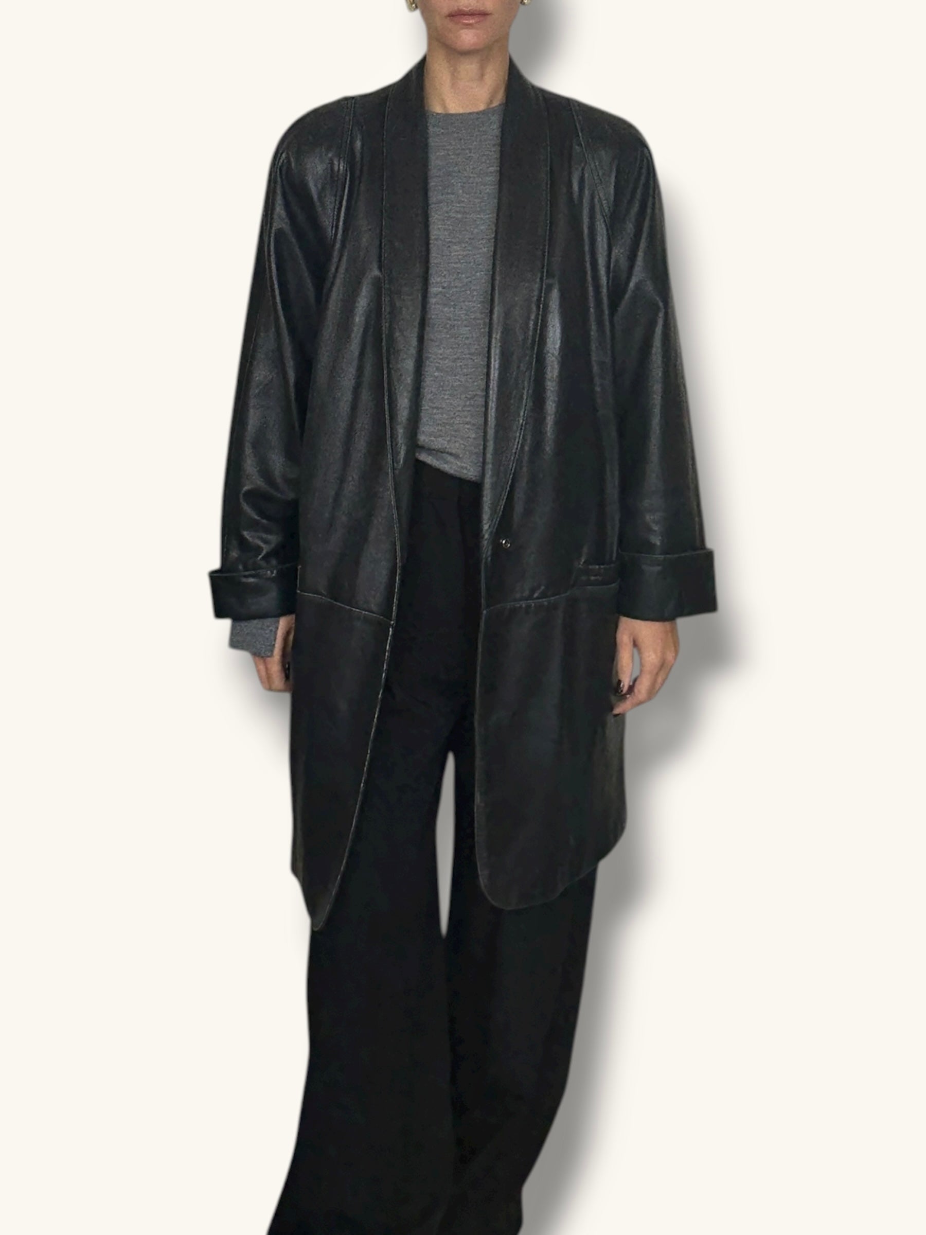 Vintage Black Leather Jacket. A sleek and effortless vintage black leather jacket with an open, draped front that closes with a single snap button for a clean, minimalist finish. Crafted from soft genuine leather with a natural sheen, it features wide lapels, rolled cuffs, and two deep front pockets that add to its relaxed sophistication. The leather shows gentle signs of wear consistent with age—without damage—giving it that authentic worn-in patina unique to true vintage pieces. Lightly structured with an unlined interior, it’s a timeless layer that embodies effortless cool.