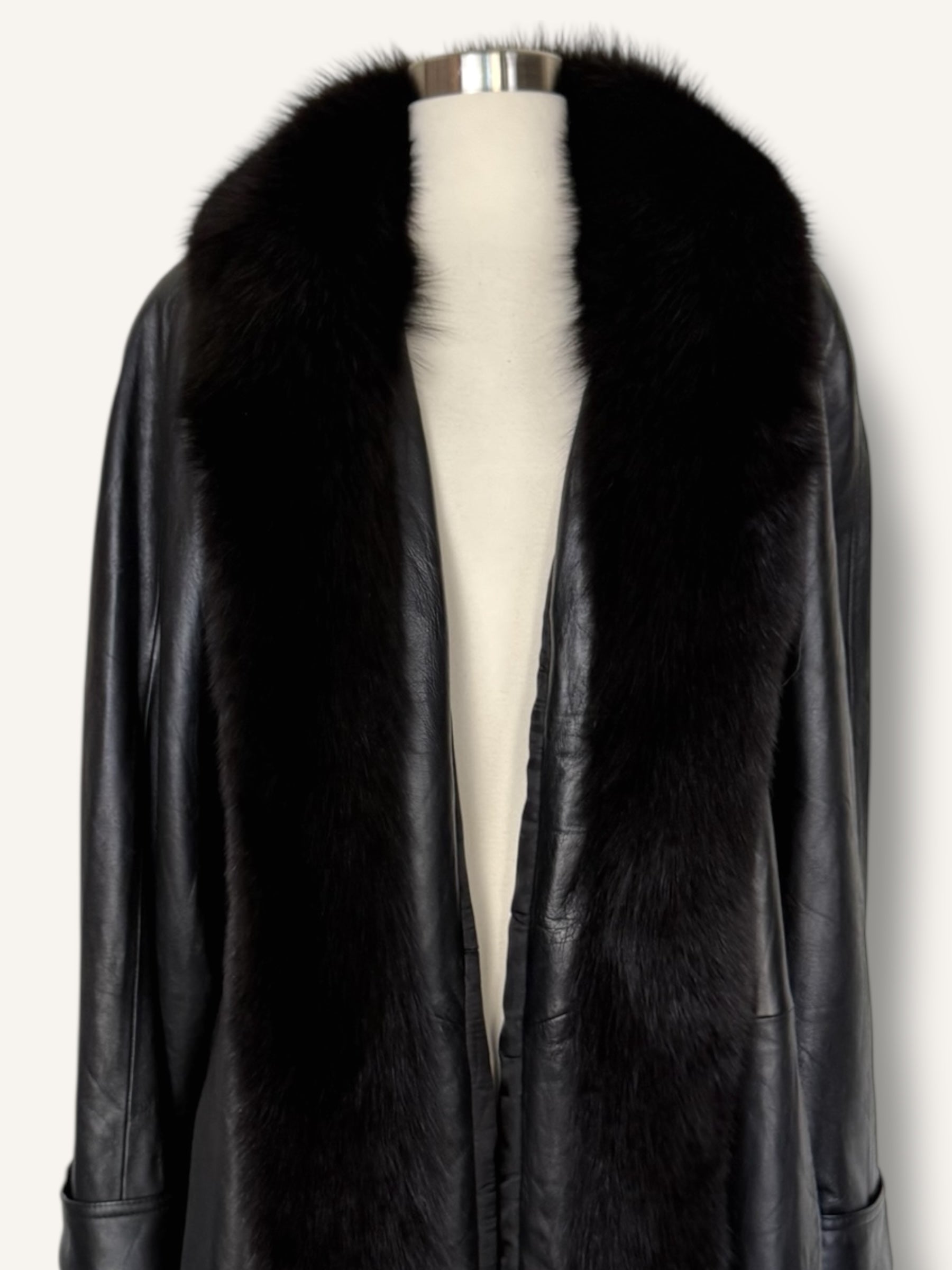 Soft lamb leather vintage coat crafted in supple black leather with a dramatic genuine fox fur collar. Features a relaxed silhouette with cuffed sleeves and clean tailoring through the back. A timeless statement piece that combines classic leather edge with rich fur detailing.