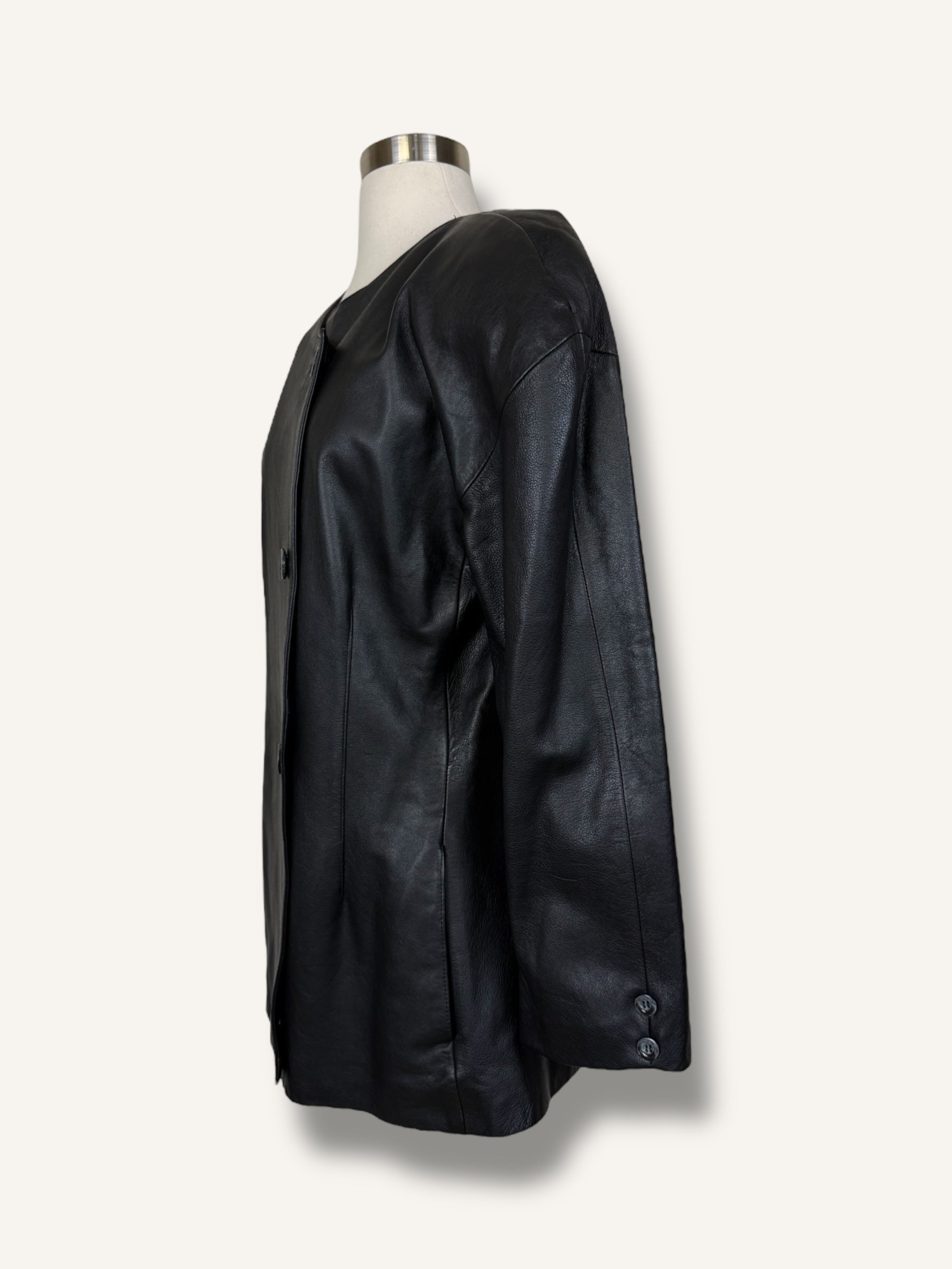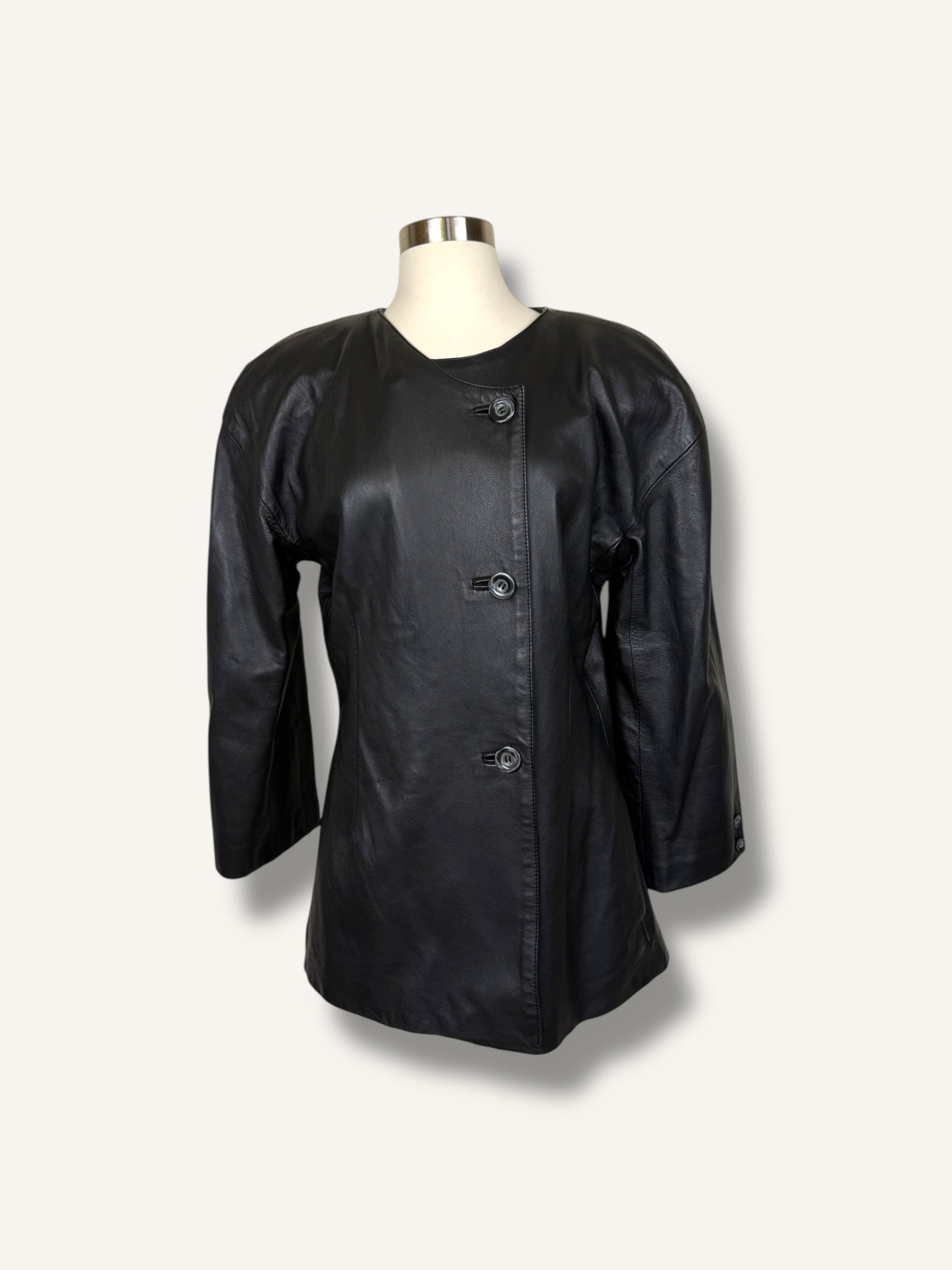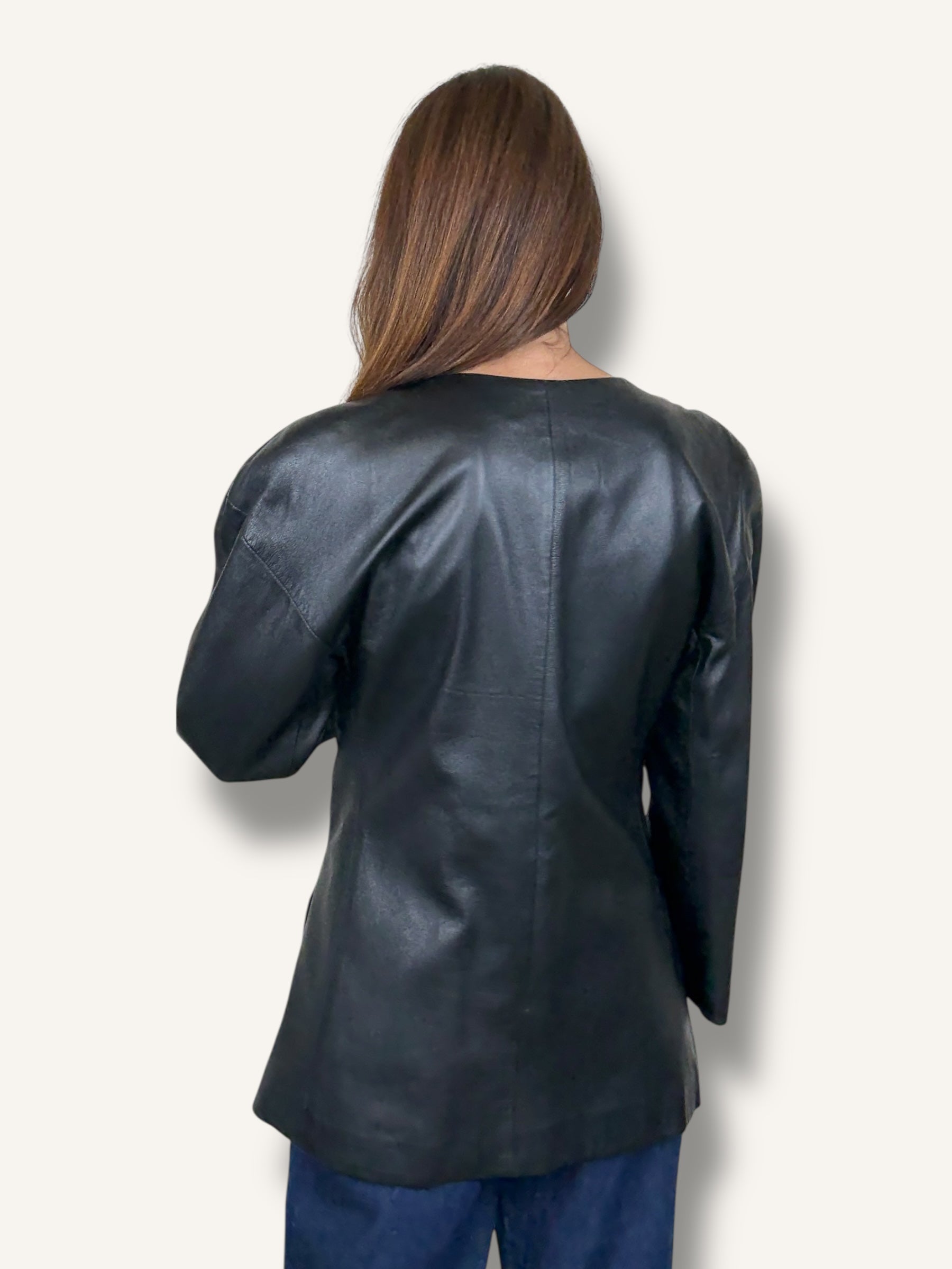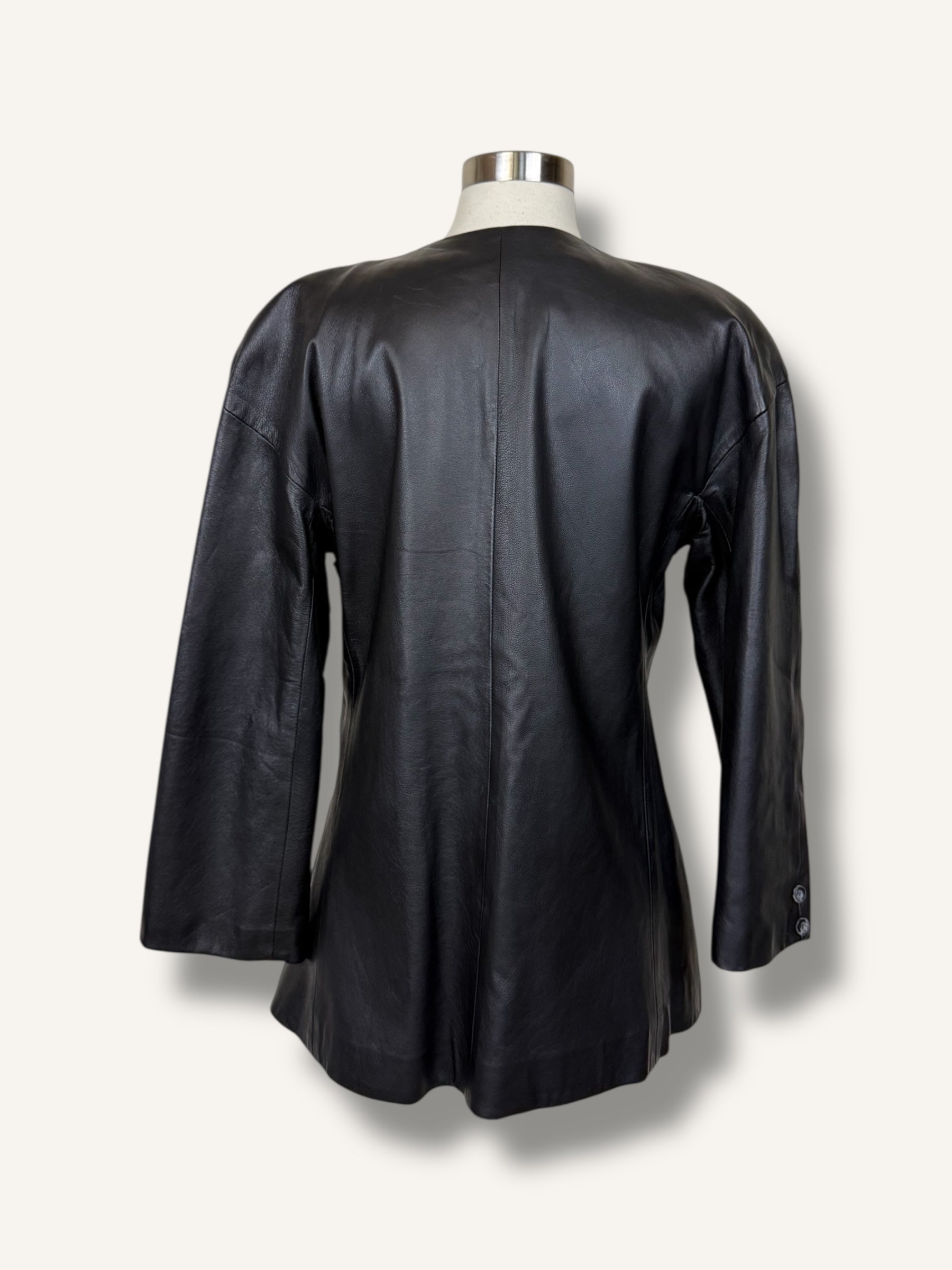 Vintage Krizia black leather jacket, made in Italy featuring a clean collarless neckline and asymmetric button closure. Designed with structured shoulders, long sleeves, and a slightly boxy silhouette, it blends minimal lines with a sleek, modern edge. Finished with tonal buttons at the front and cuffs, this piece offers a refined take on classic leather outerwear.