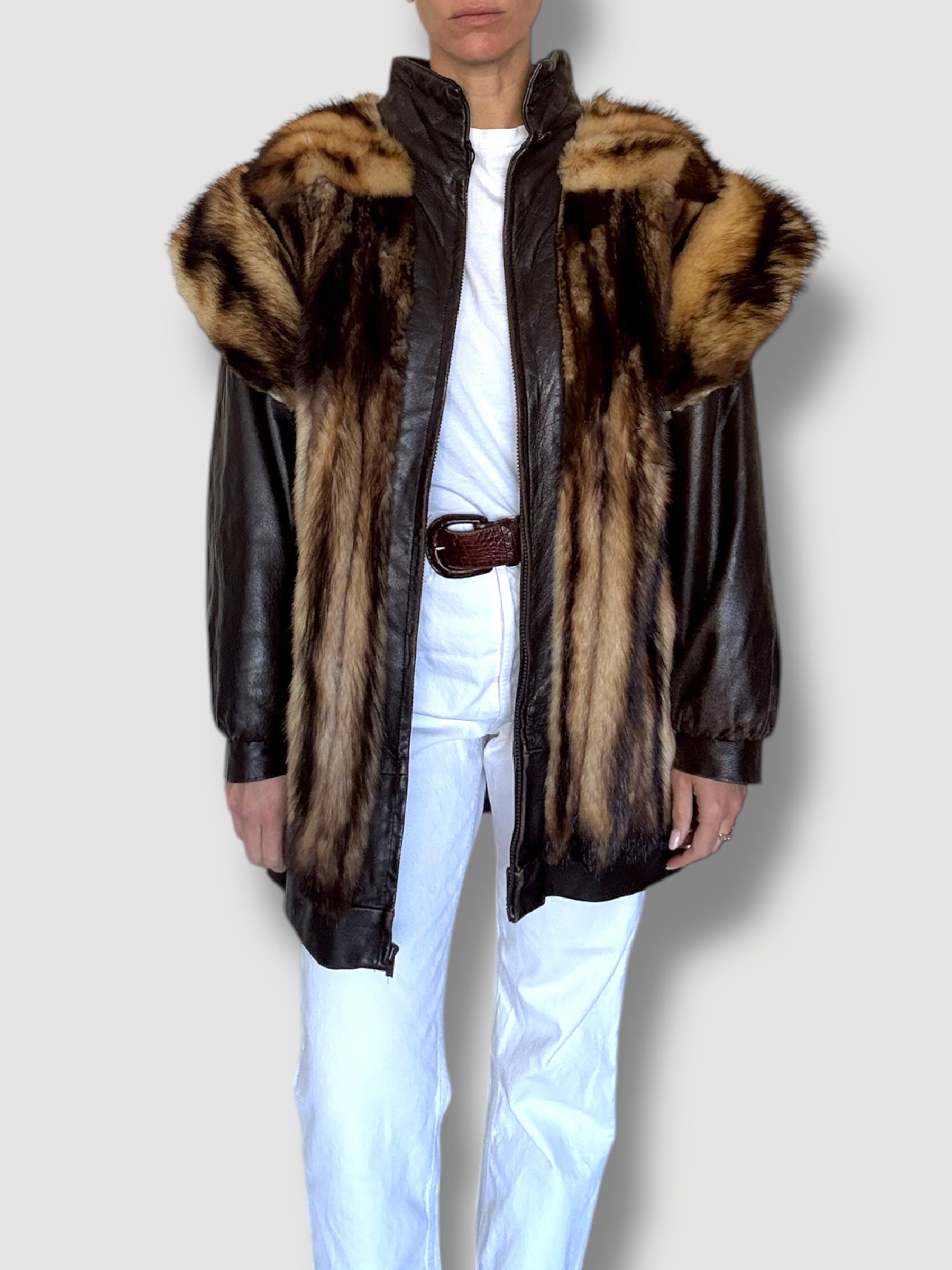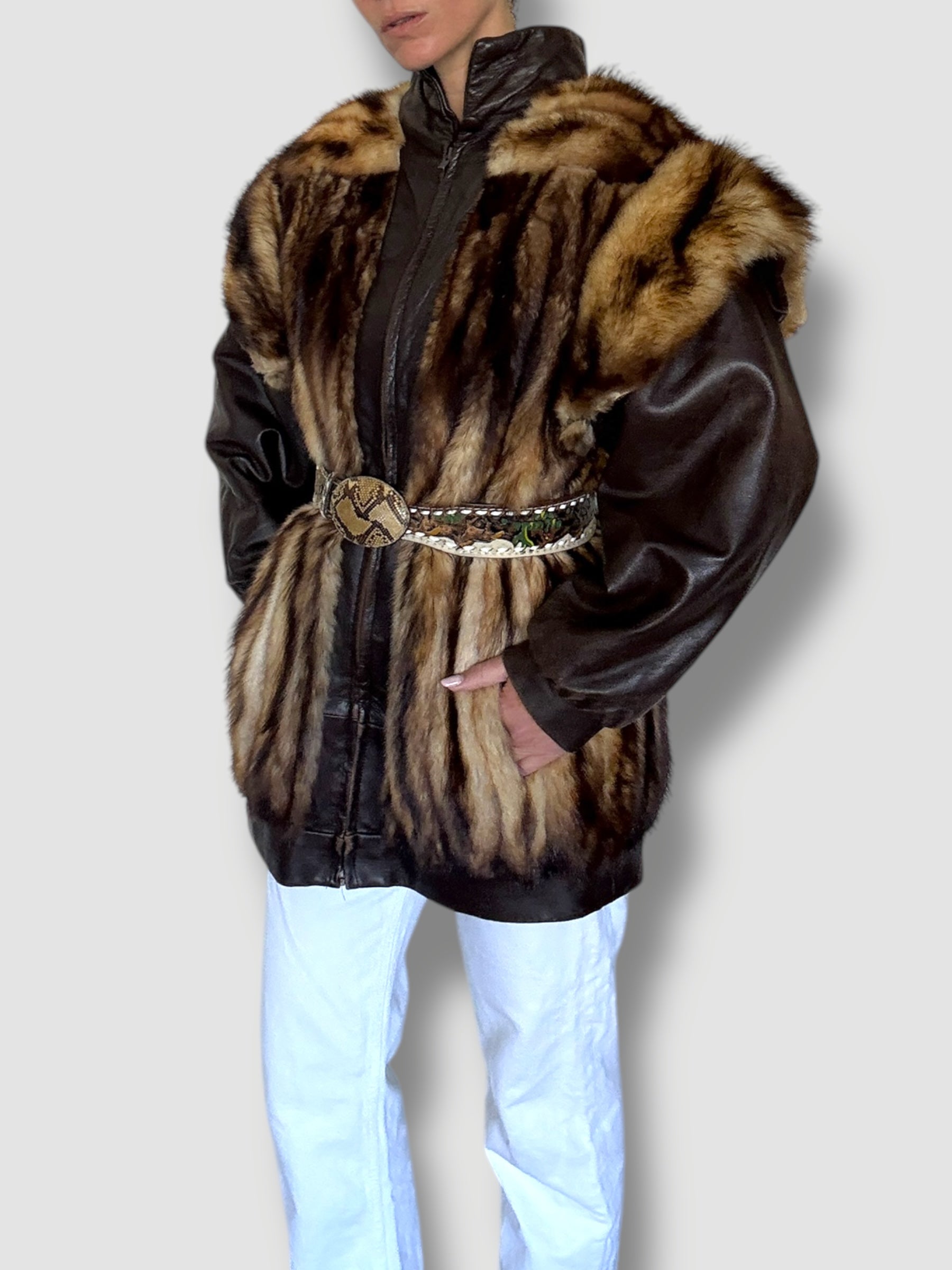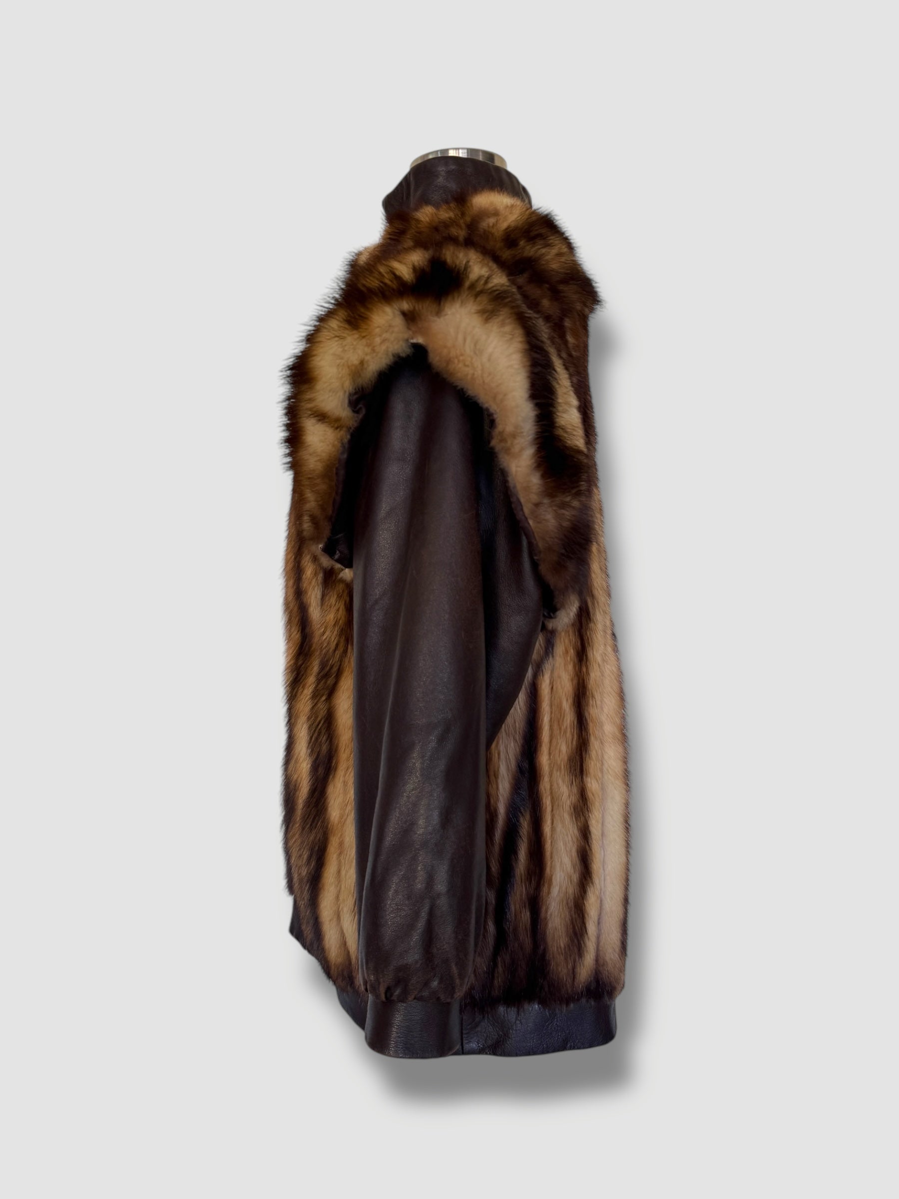 This striking vintage coat is a bold fusion of luxury and edge, crafted from buttery dark brown leather and richly textured mink fur. The voluminous fur panels wrap around the front and back shoulders, creating dramatic structure and warmth, while the leather sleeves and zip-front closure add a sleek, moto-inspired contrast. Oversized in silhouette with a high collar, it’s both cozy and commanding—style it loose for a relaxed statement or cinch it with a belt for a glam, waist-defining look. A true showstopper that brings unapologetic vintage drama.